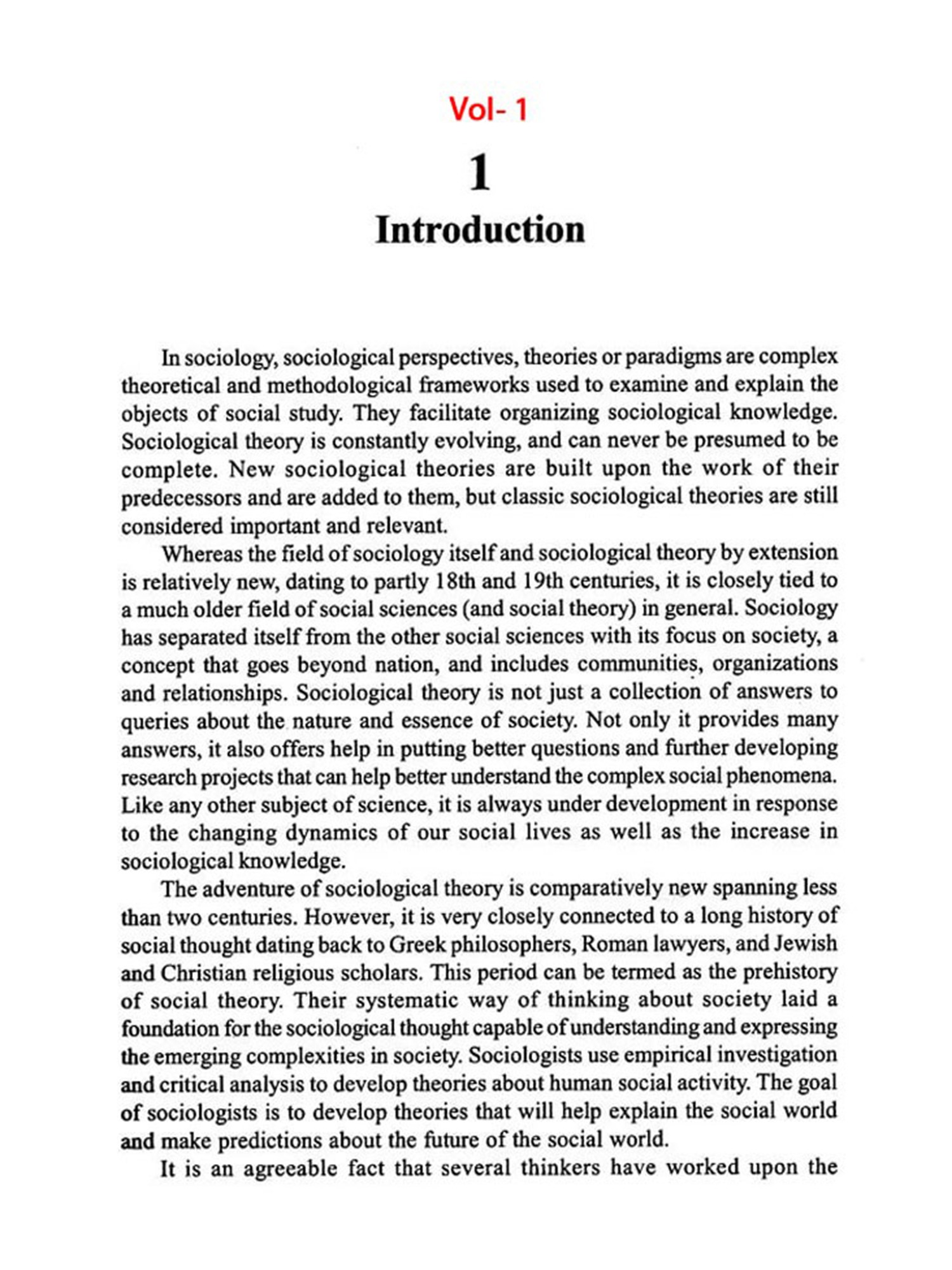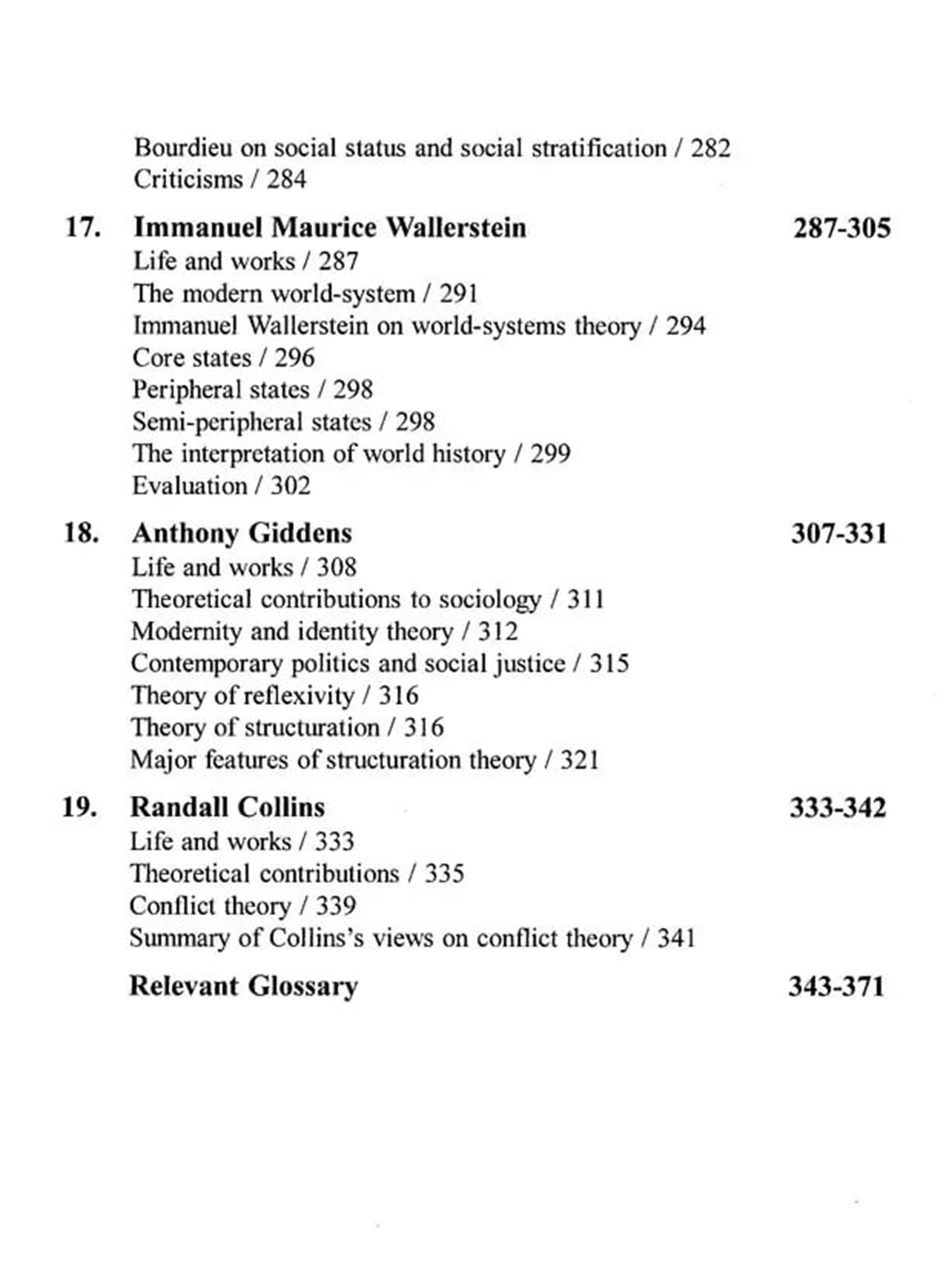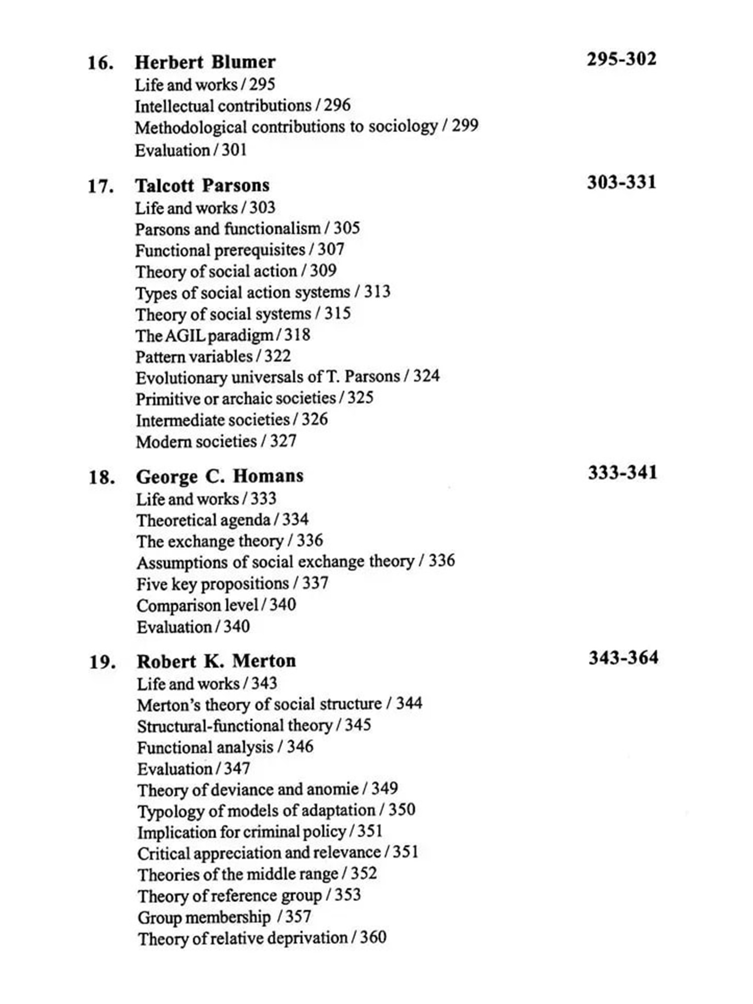 This is a book on a widely acclaimed topic of sociology. It attempts to deal with eighteen exponents of sociology in a chronological fashion who have rightly come to be regarded as masters of social thought. The book critically examines the major social thinkers from Auguste Comte to Robert K. Merton. The sociological thinkers covered are Auguste Comte, Karl Marx, Herbert Spencer, Vilfredo Pareto, Ferdinand Tönnies, Thorstein Bunde Veblen, David Émile Durkheim, Georg Simmel, Maximilian Karl Emil Weber, George Herbert Mead, Charles Horton Cooley, Pitirim A. Sorokin, Herbert Marcuse, Alfred Schütz, Herbert Blumer, Talcott Parsons, George C. Homans, and Robert K. Merton.