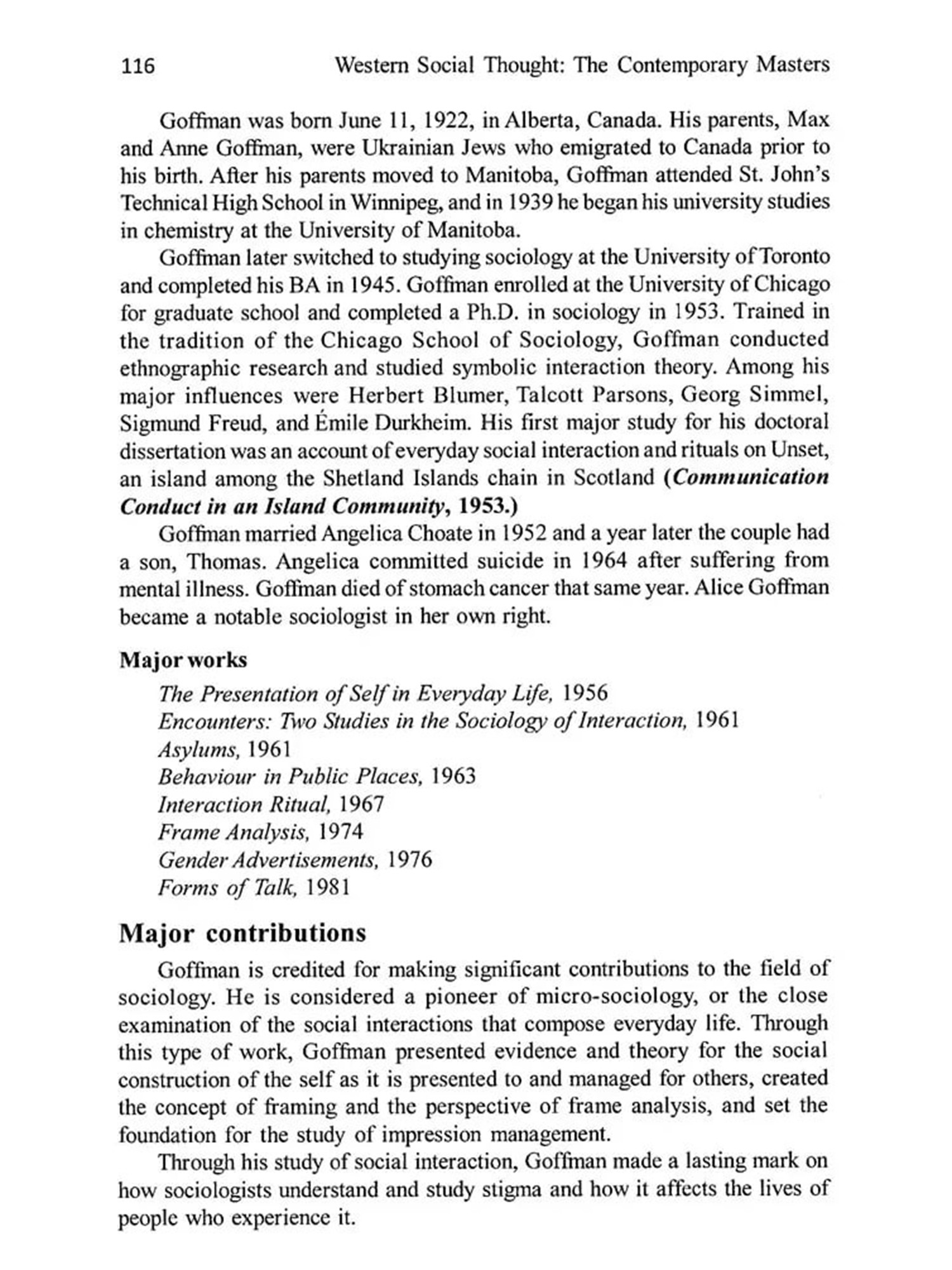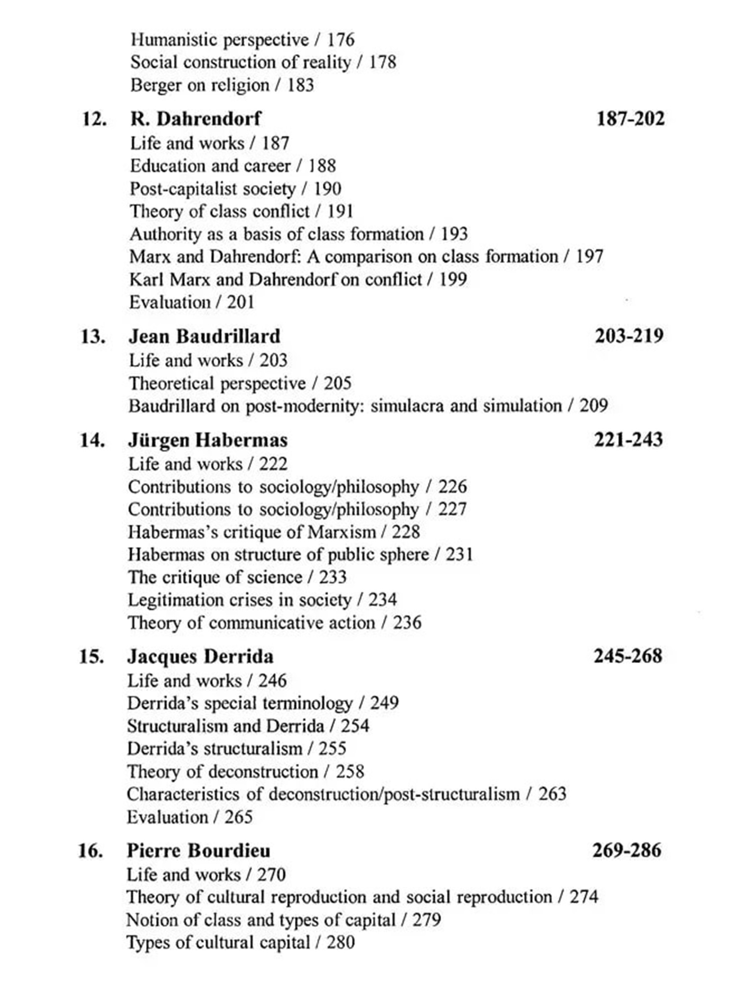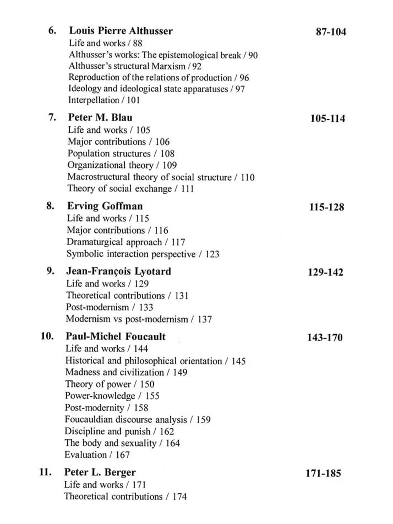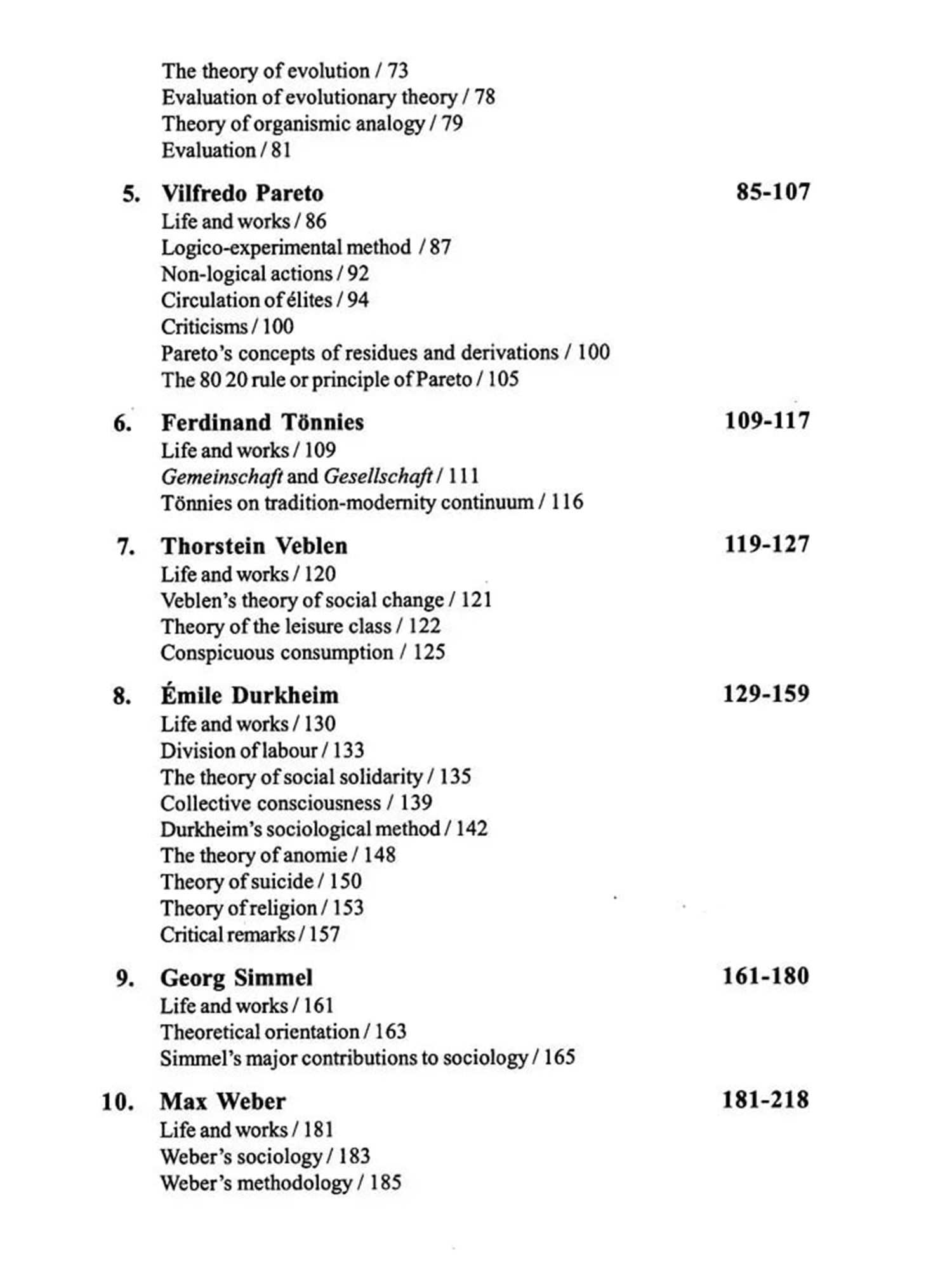 The book covers eighteen exponents of sociology who are regarded as masters of social thought. The book critically examines the major social thinkers from Auguste Comte to Robert King Merton chronologically. The sociological thinkers covered are Auguste Comte, Karl Marx, Herbert Spencer, Vilfredo Pareto, Ferdinand Tönnies, Thorstein Bunde Veblen, David Émile Durkheim, Georg Simmel, Maximilian Karl Emil Weber, George Herbert Mead, Charles Horton Cooley, Pitirim A. Sorokin, Herbert Marcuse, Alfred Schütz, Herbert Blumer, Talcott Parsons, George C. Homans, and Robert King Merton.