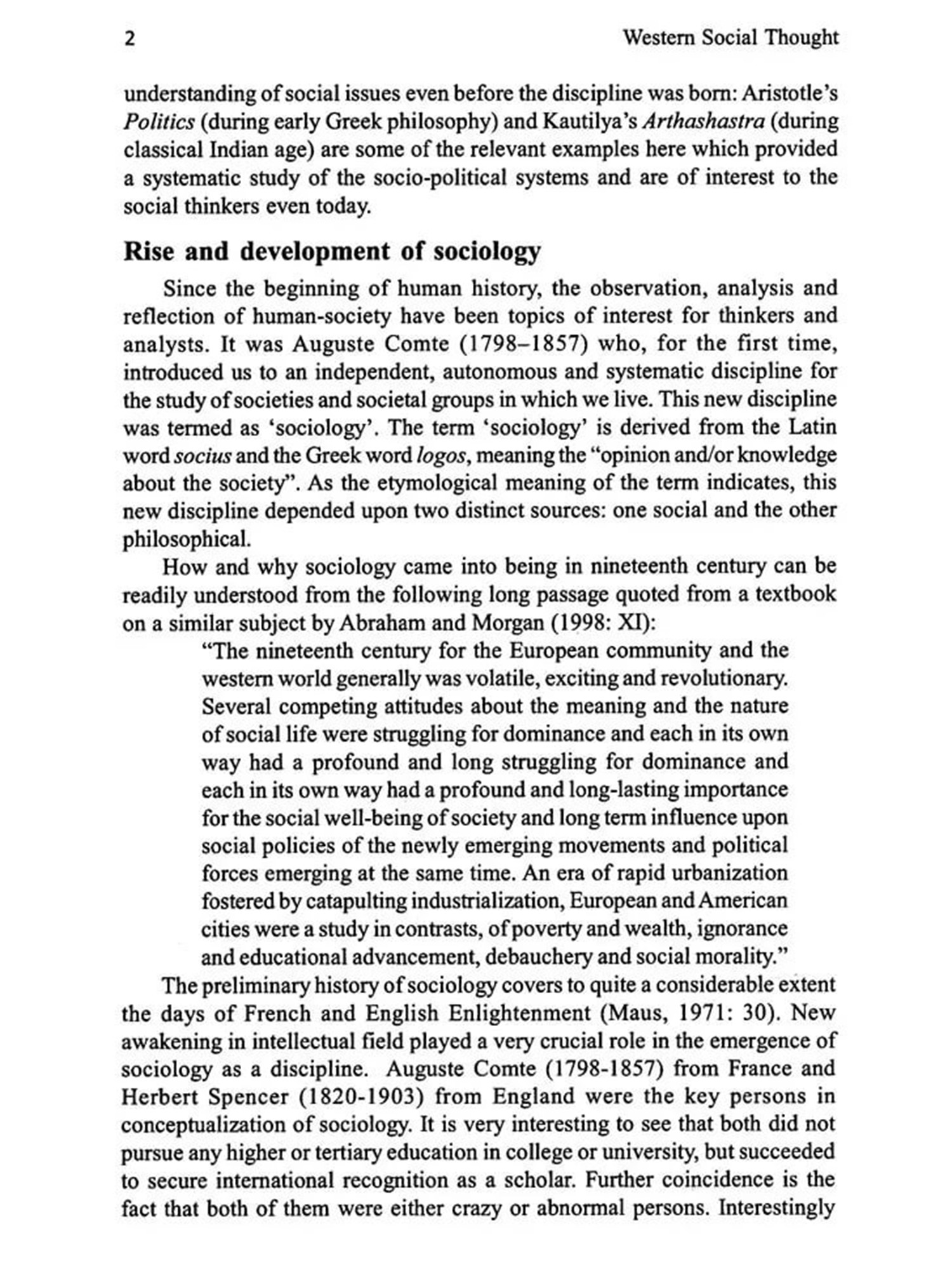 There are many standard textbooks on social thinkers from the Western countries. With this book, students will no longer face the problems of vast and complicated literature in country like India. A central purpose of this text is to be as concise and simple as far as possible. No student of sociology and its related fields can ignore this book. The organization of the book too has kept the range of students in mind. There is a consistent organizational scheme within the chapters. The book is written in a lucid, easy-to-read manner, and essentially sums up the development of sociological thought for hundred fifty years, i.e. from mid-nineteenth century to the end of twentieth century. From this period on to the present day I have done another book titled as Western Social Thought: The Contemporary Masters.