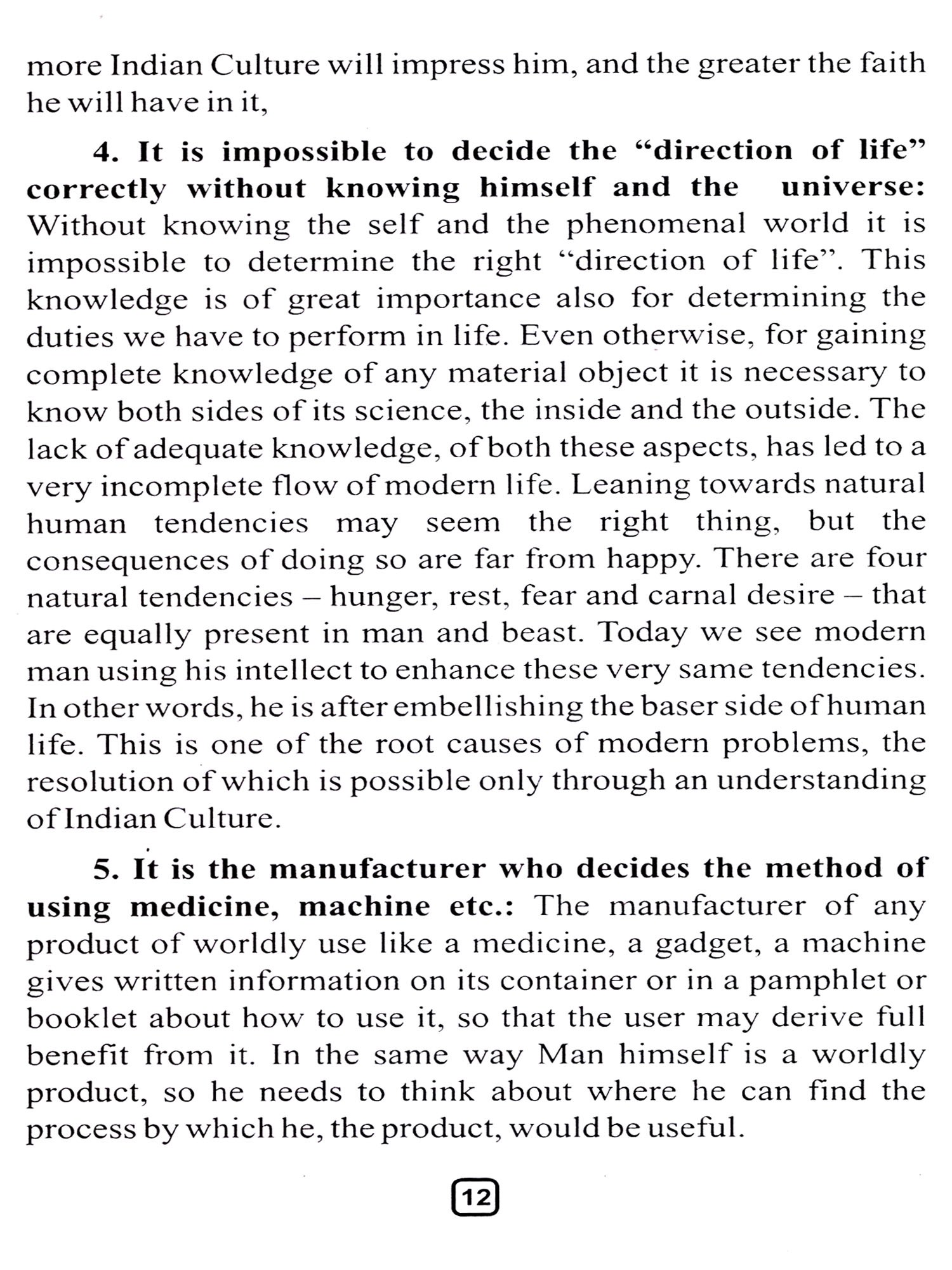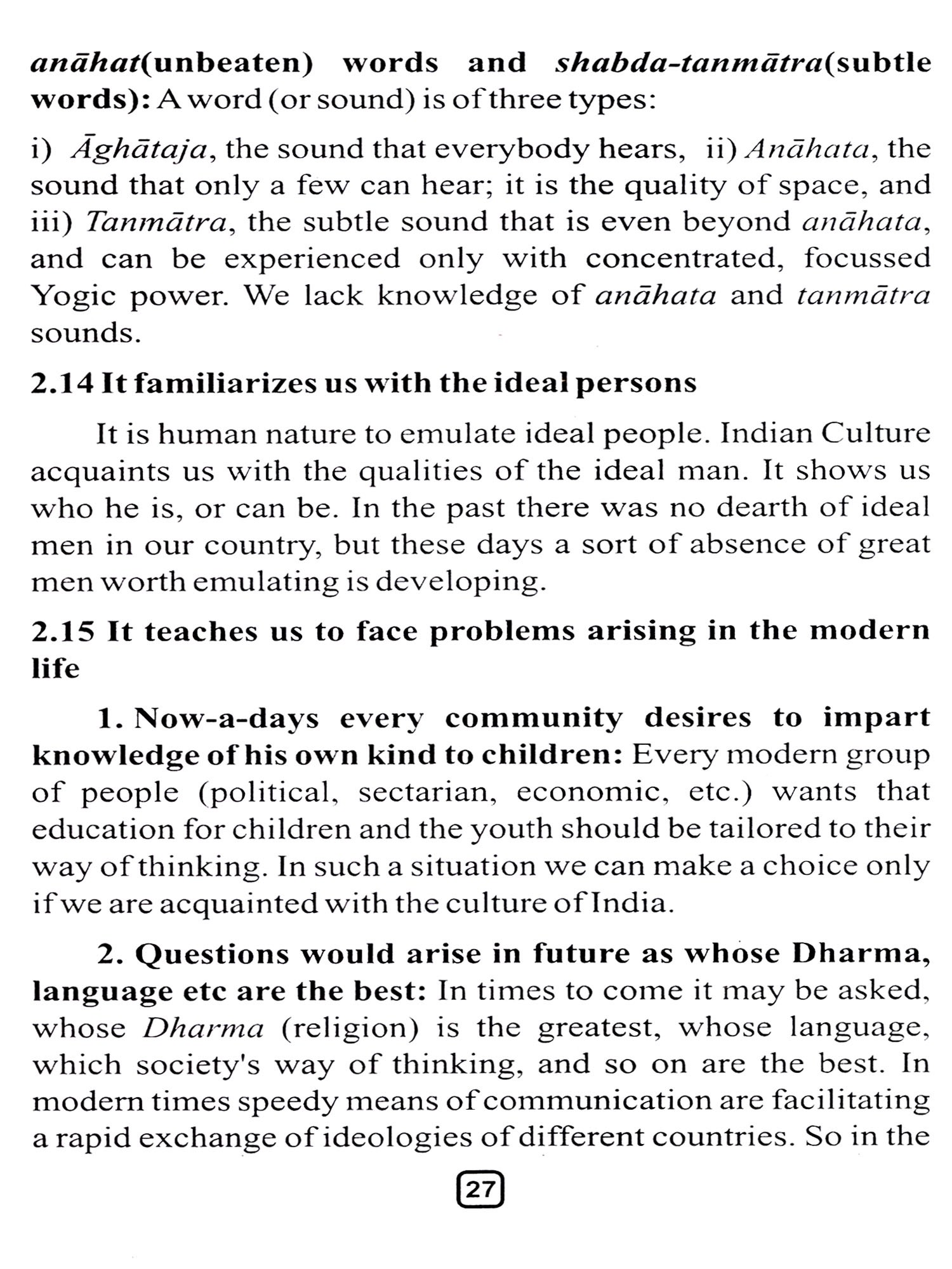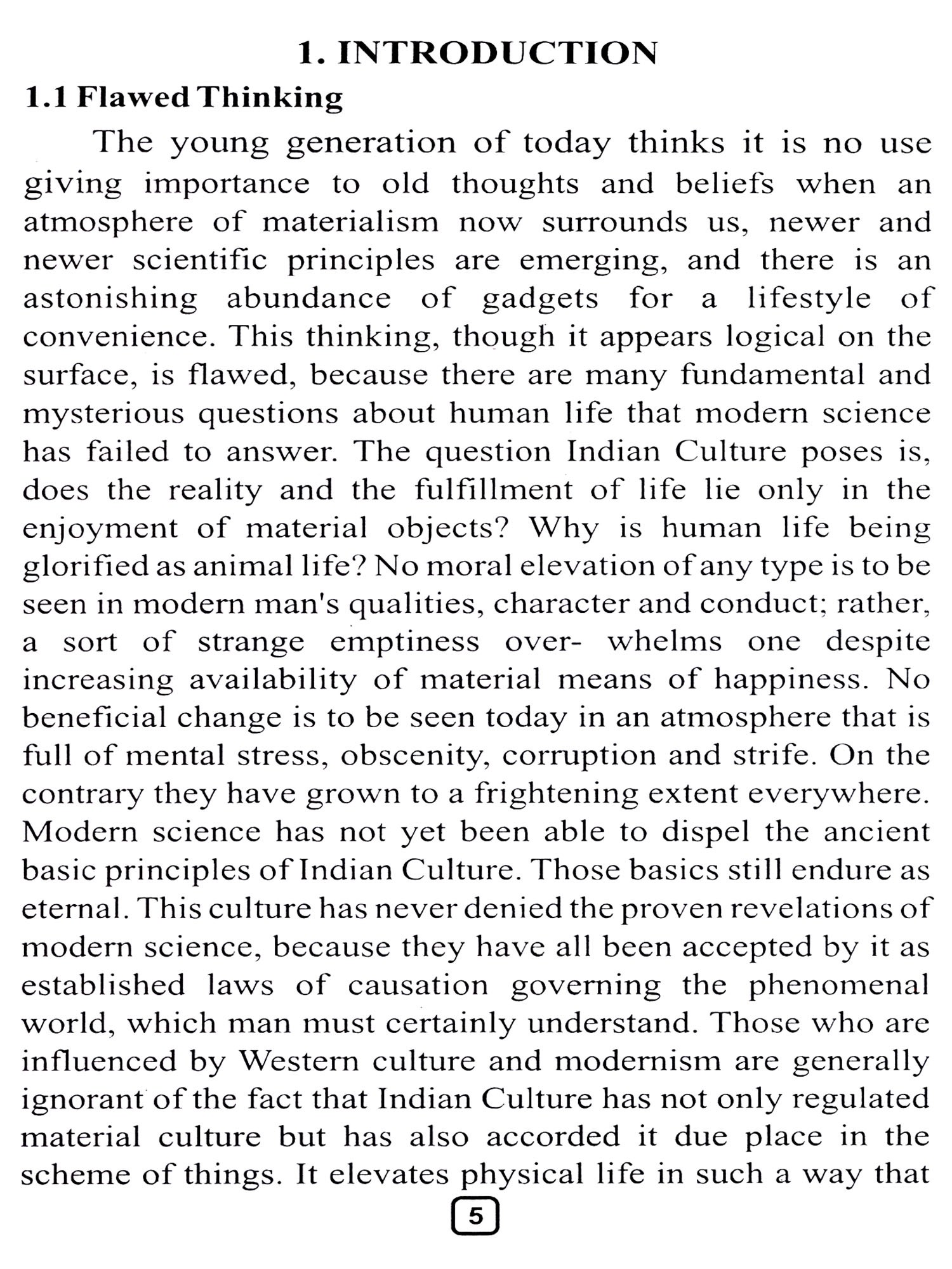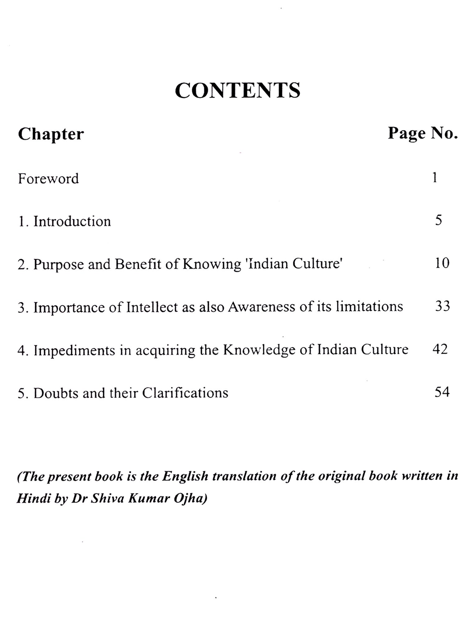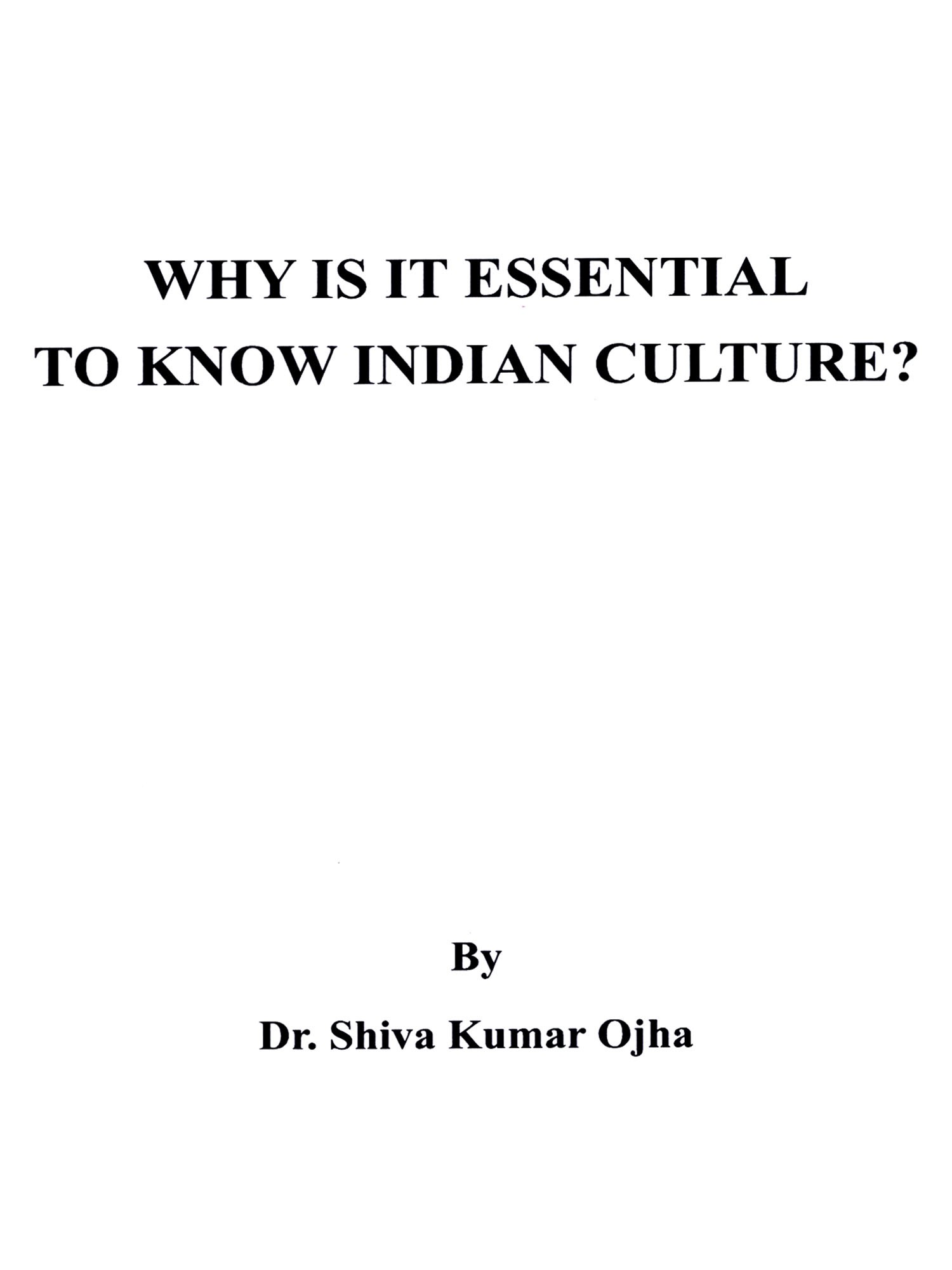 It would be appropriate to begin with some incidents this writer has personally experienced. Just a few years ago he was discussing Indian Culture with a certain gentleman. He was around 40 years old and was employed in some company. The writer said to him, 'You have a job, you are busy in your office for the whole day, you work hard, at the same time you must be enjoying your work, your children go to school, you have a good wife, there is a doctor to attend on you as well as police security; in such a situation, what is the need of Indian Culture?' Thinking for a while he replied, 'No need that I can see.' Another incident is also not very old. It was when, during the current decade, this writer used to teach a course in Indian Culture for a class of adult and professional students. It was an optional subject, but once a student opted for it, it became compulsory like other subjects. Every year, in the beginning of the course, the writer would ask the students, 'Why did you opt for a study of Indian Culture when you live in India?' They found it hard to give an appropriate answer to the question. In fact, it would not be an exaggeration to say that the writer got no meaningful answer. This was not the students' fault, it is the fault of modern education, and of the social milieu that we all of us have knowing or unknowingly created around us.