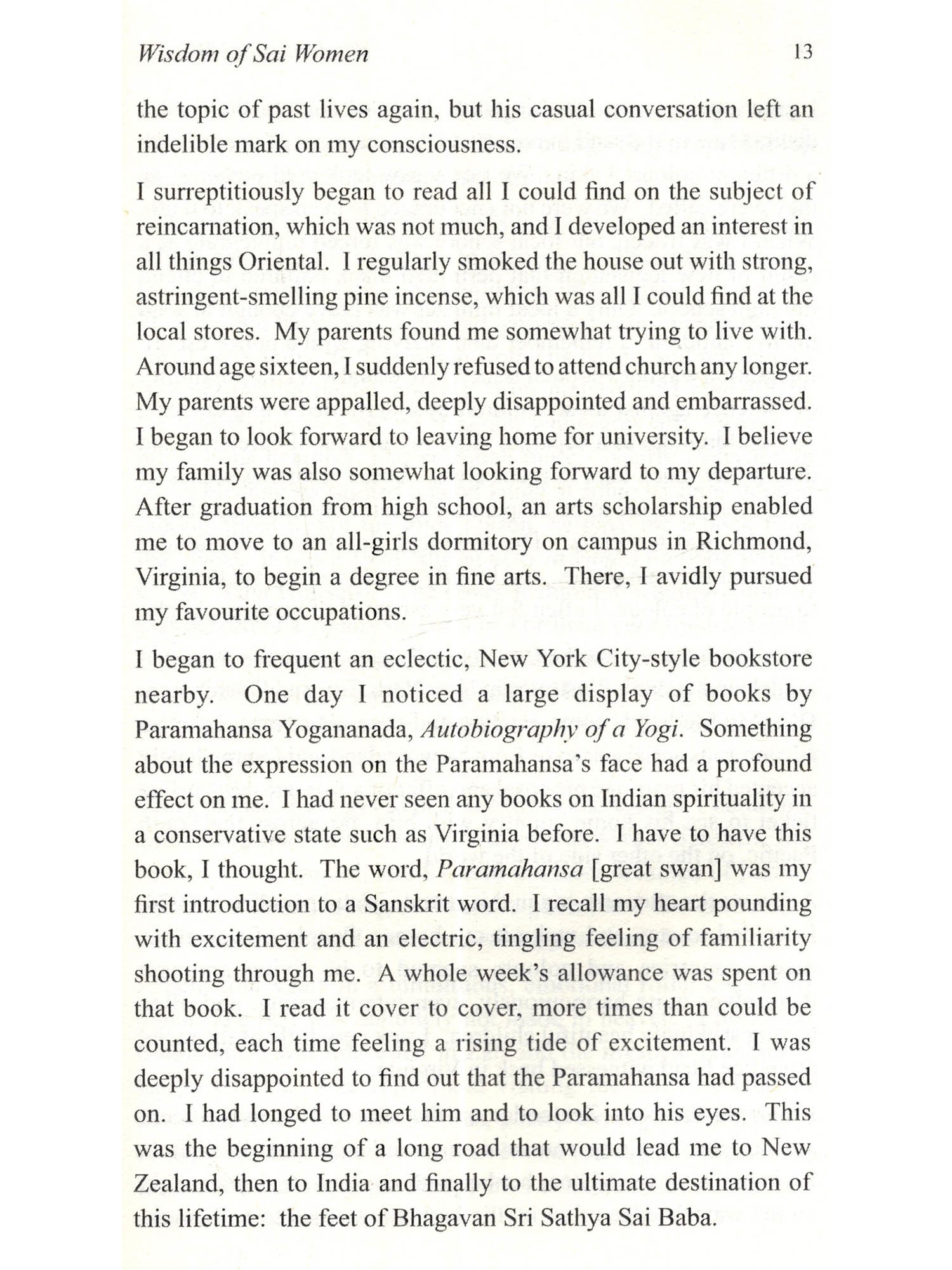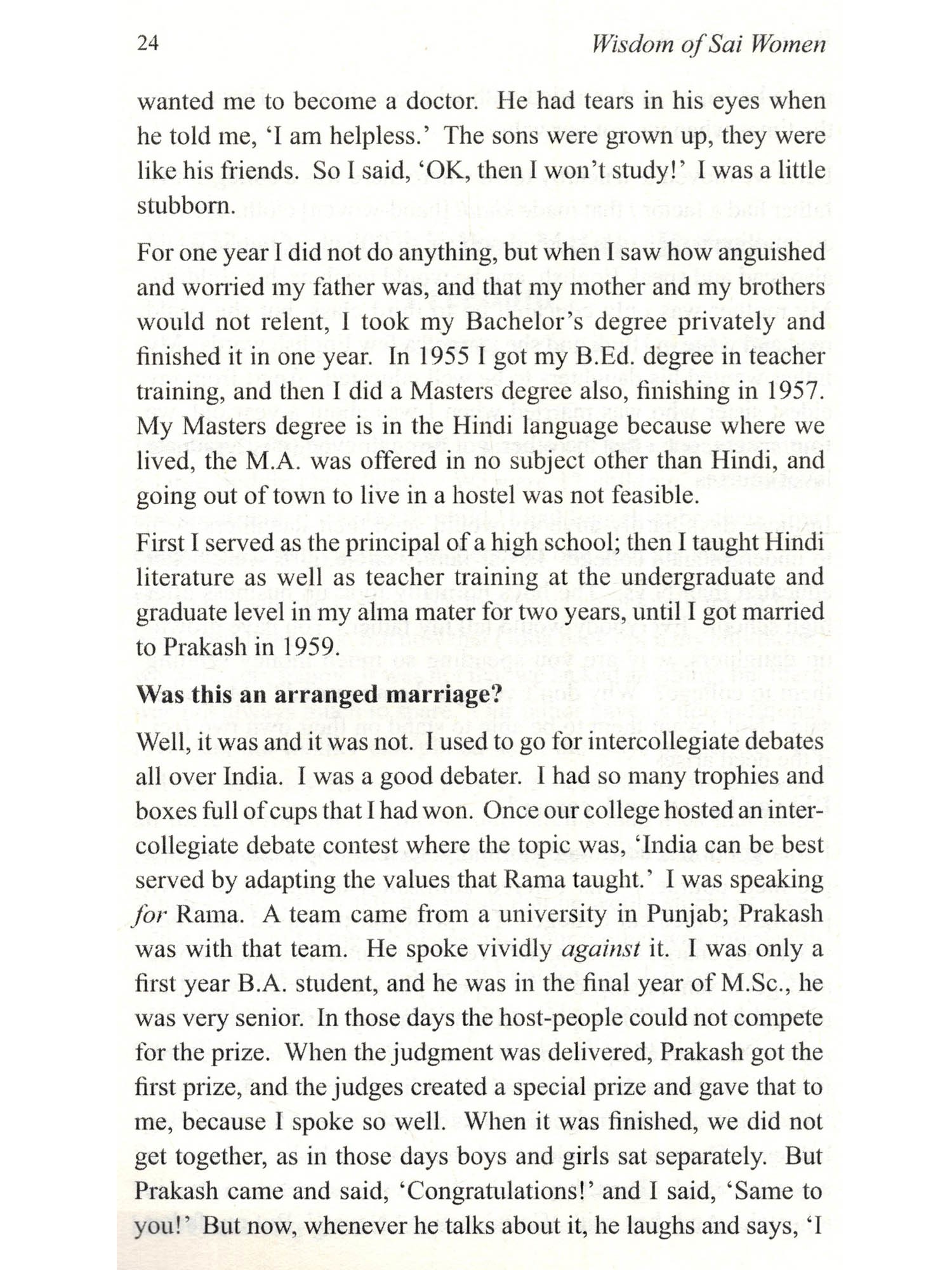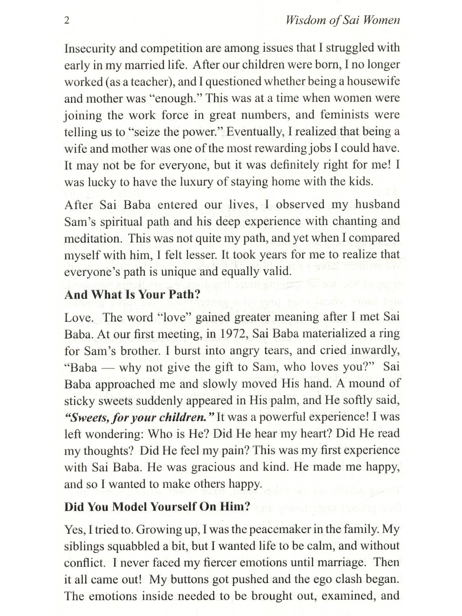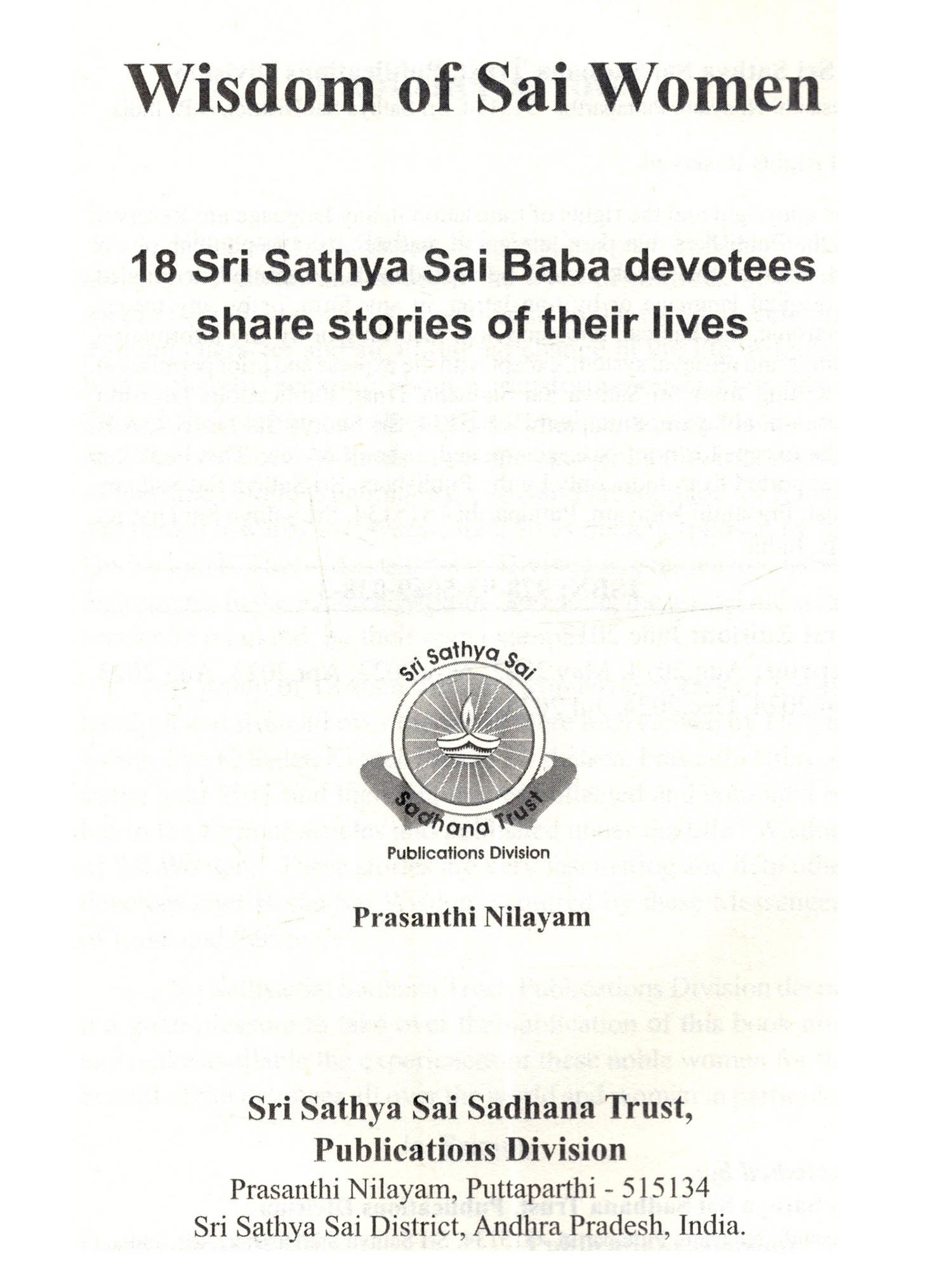 WISDOM OF SAI WOMEN This book contains oral and written interviews with 18 Sai women devotees from around the world. In their later years, these women became wise, calm, serene, and beautiful, but they did not all start out that way. They share a little of the stories of their lives, along with their favourite Swami stories, and pass along their hard-earned wisdom for us to reflect on. They are women, they are mothers, they are elders, and above all, they are Sai devotees of long-standing. We should offer them our respect, and take courage and confidence from them in return. Laugh along with them as you read their tales; marvel at their lives; appreciate them for what they have become; and most of all, cherish their wisdom.