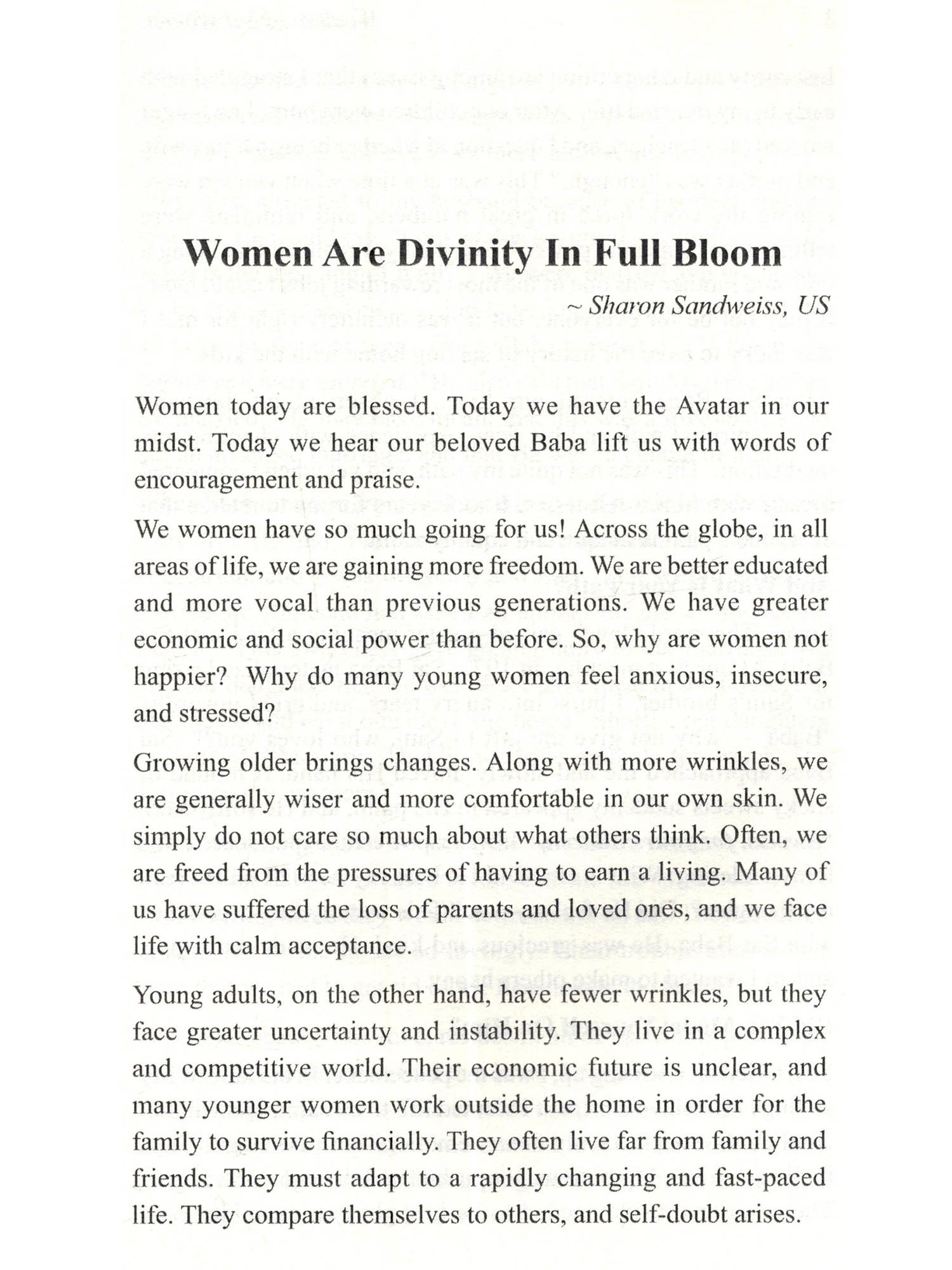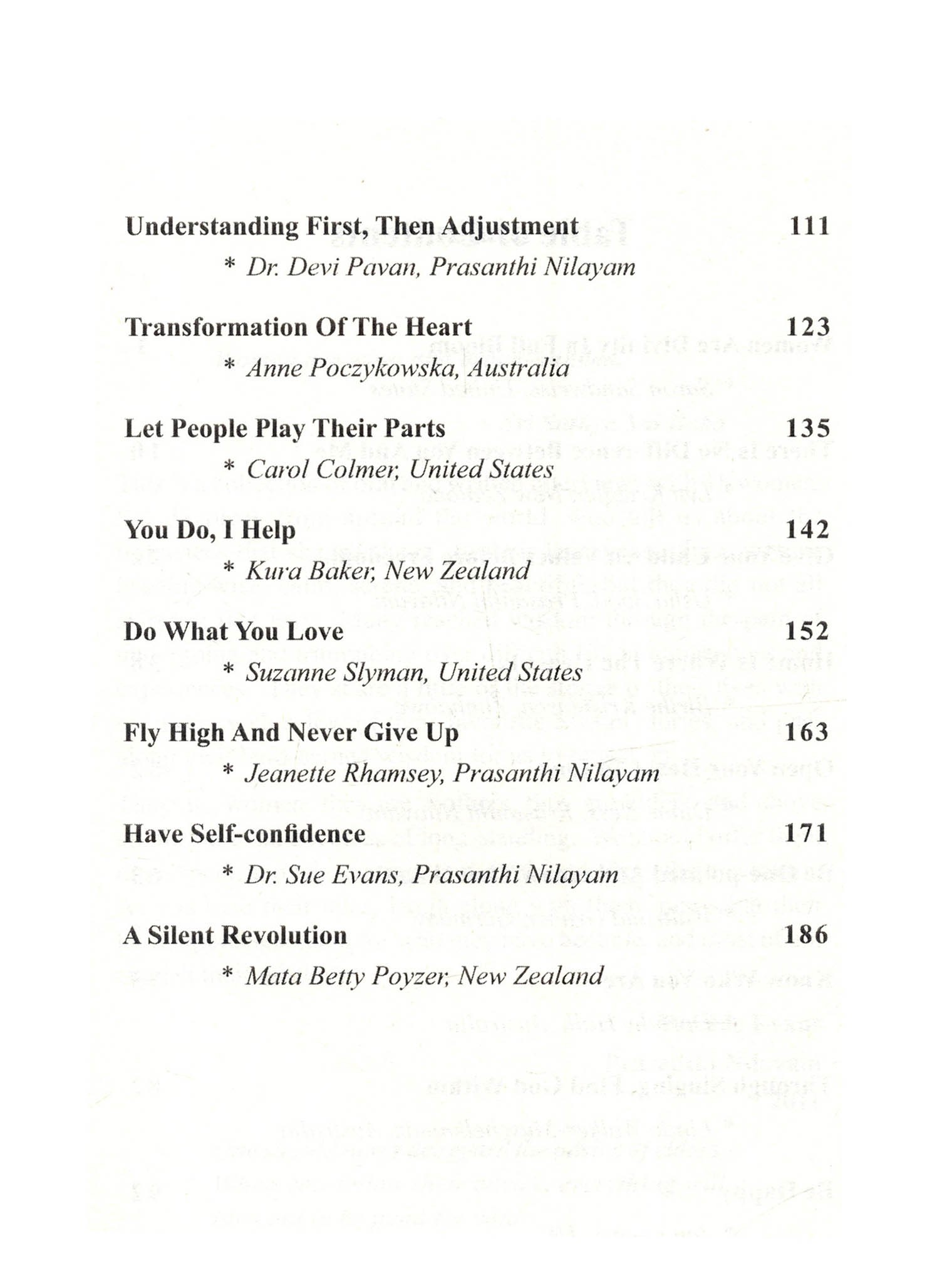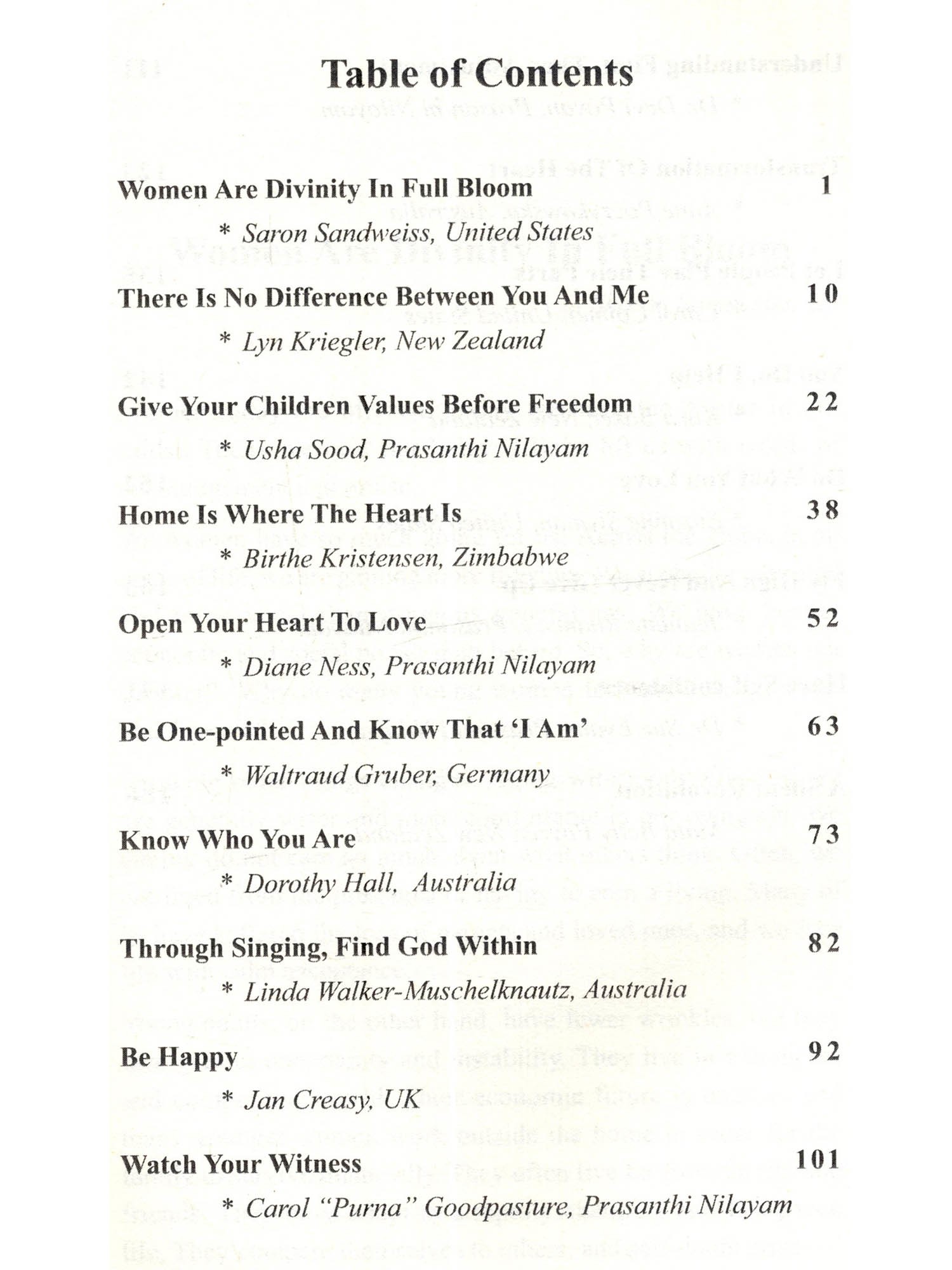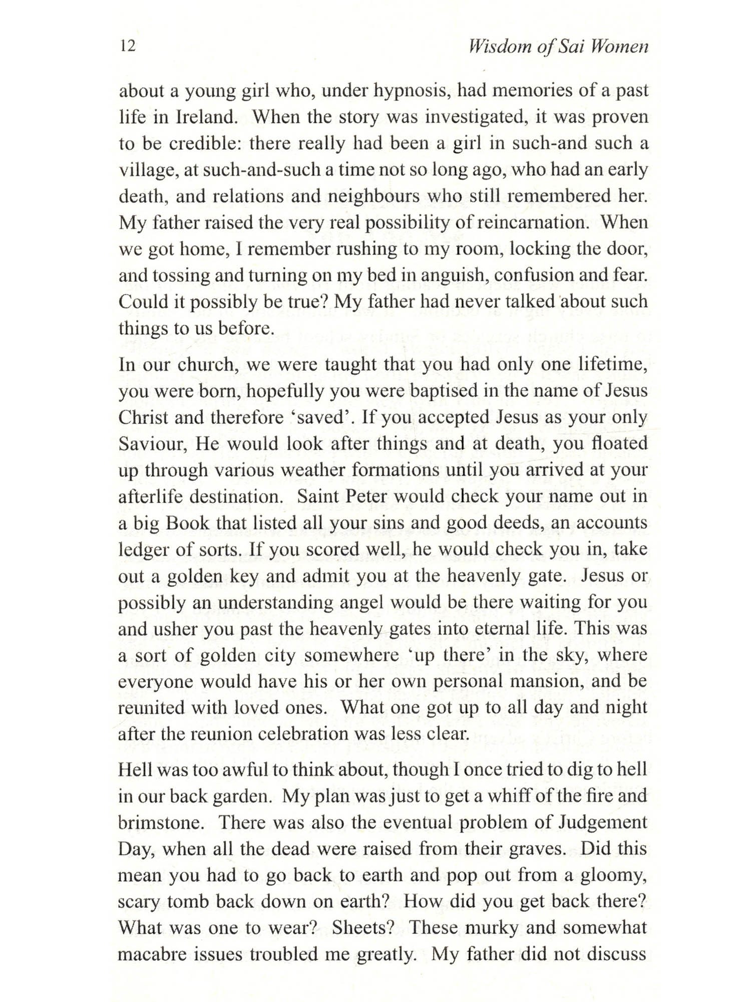 WISDOM OF SAI WOMEN This book contains oral and written interviews with 18 Sai women devotees from around the world. In their later years, these women became wise, calm, serene, and beautiful, but they did not all start out that way. They share a little of the stories of their lives, along with their favourite Swami stories, and pass along their hard-earned wisdom for us to reflect on. They are women, they are mothers, they are elders, and above all, they are Sai devotees of long-standing. We should offer them our respect, and take courage and confidence from them in return. Laugh along with them as you read their tales; marvel at their lives; appreciate them for what they have become; and most of all, cherish their wisdom.