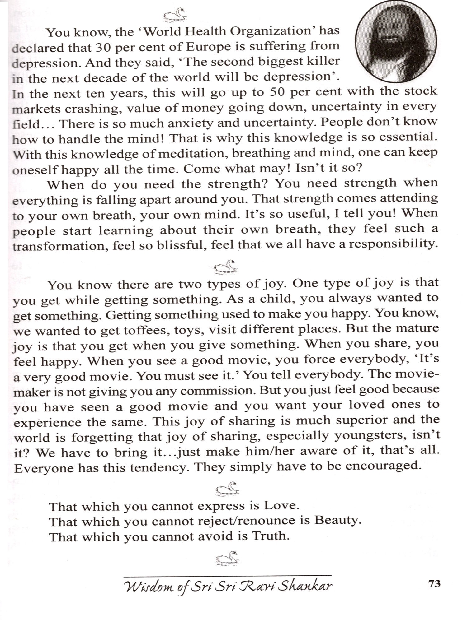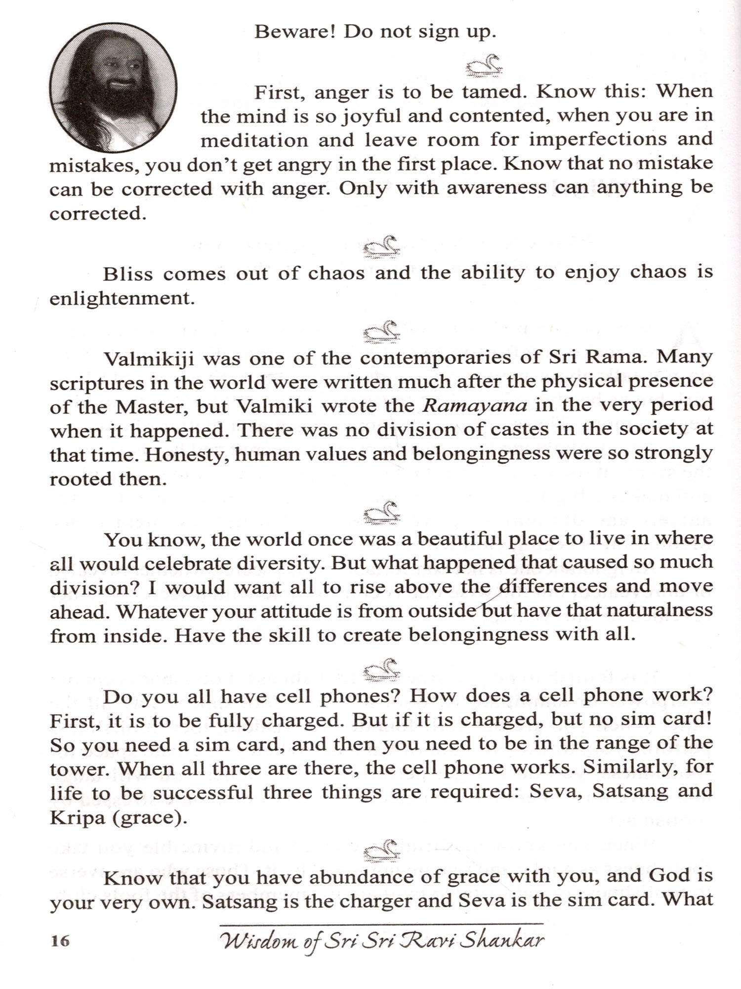 He has given discourses on important texts such as the Bhagwad Gita, the Ashtavakra Gita, the Patanjali Yogasutras, the Narada Bhakti Sutras, the Shiv Sutras, etc. He has spoken extensively on subjects such as devotion, surrender, peace, love, enlightenment, etc. His Wisdom of Sri Sri Ravi Shankar have led millions to befriend the Divinity within him/her and around him/her. They have met the Divinity that they have been searching for.