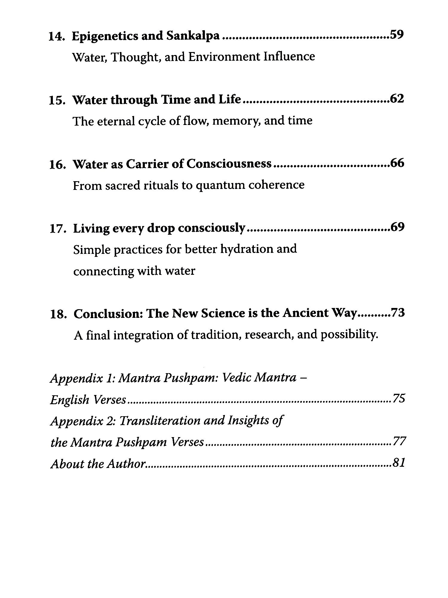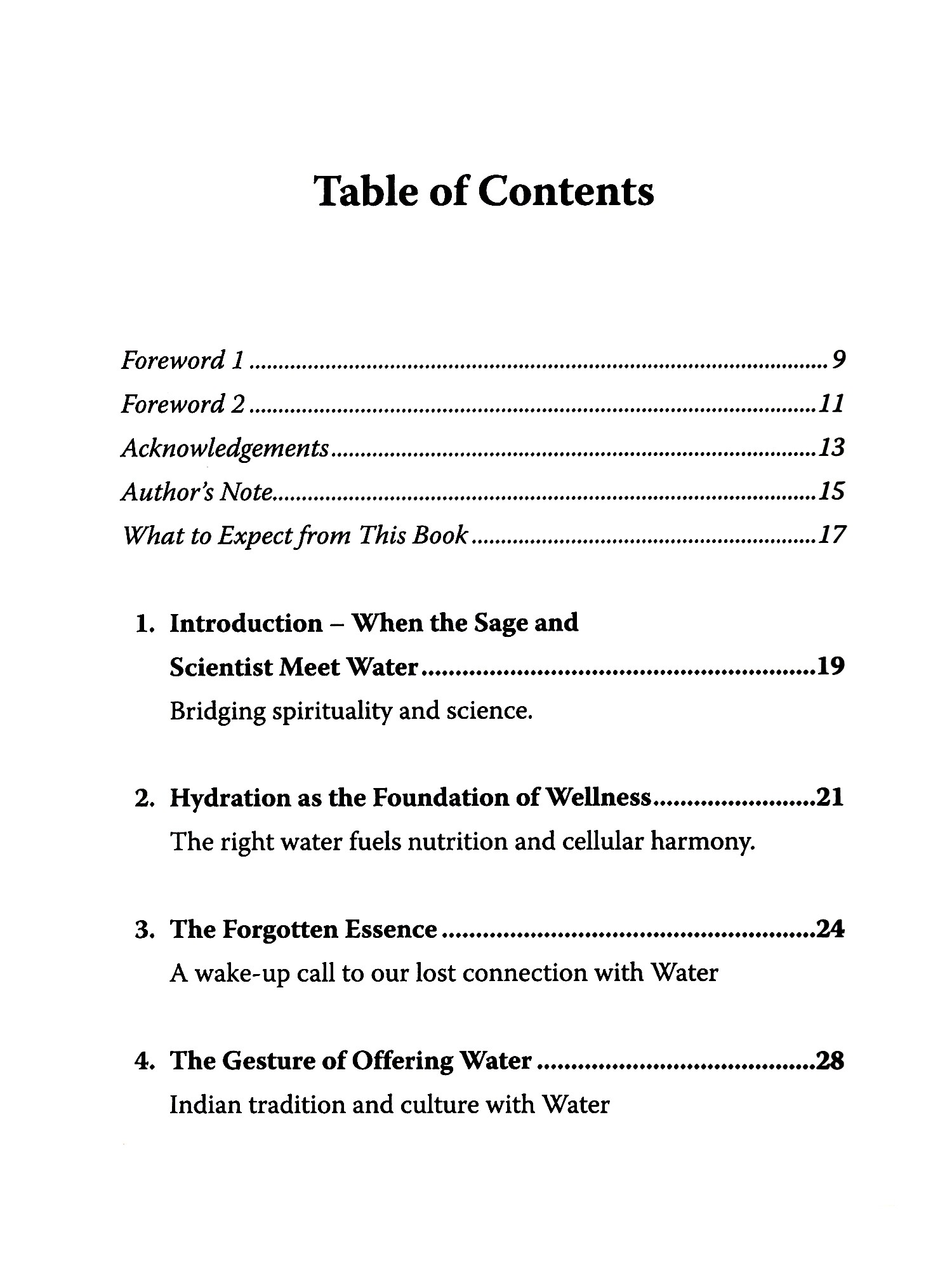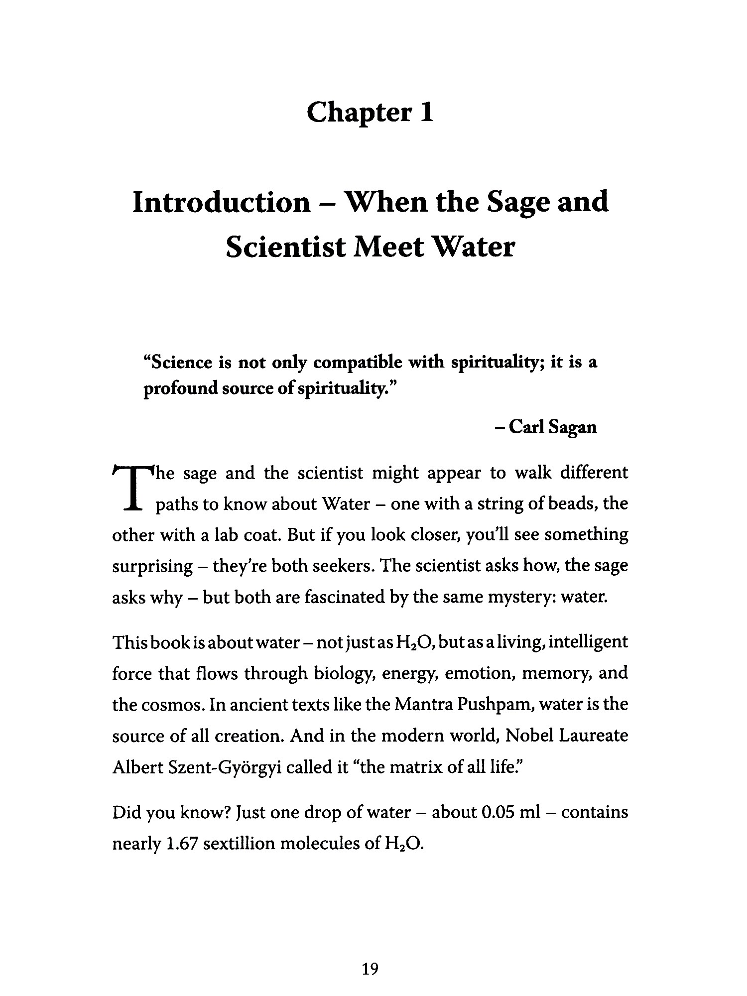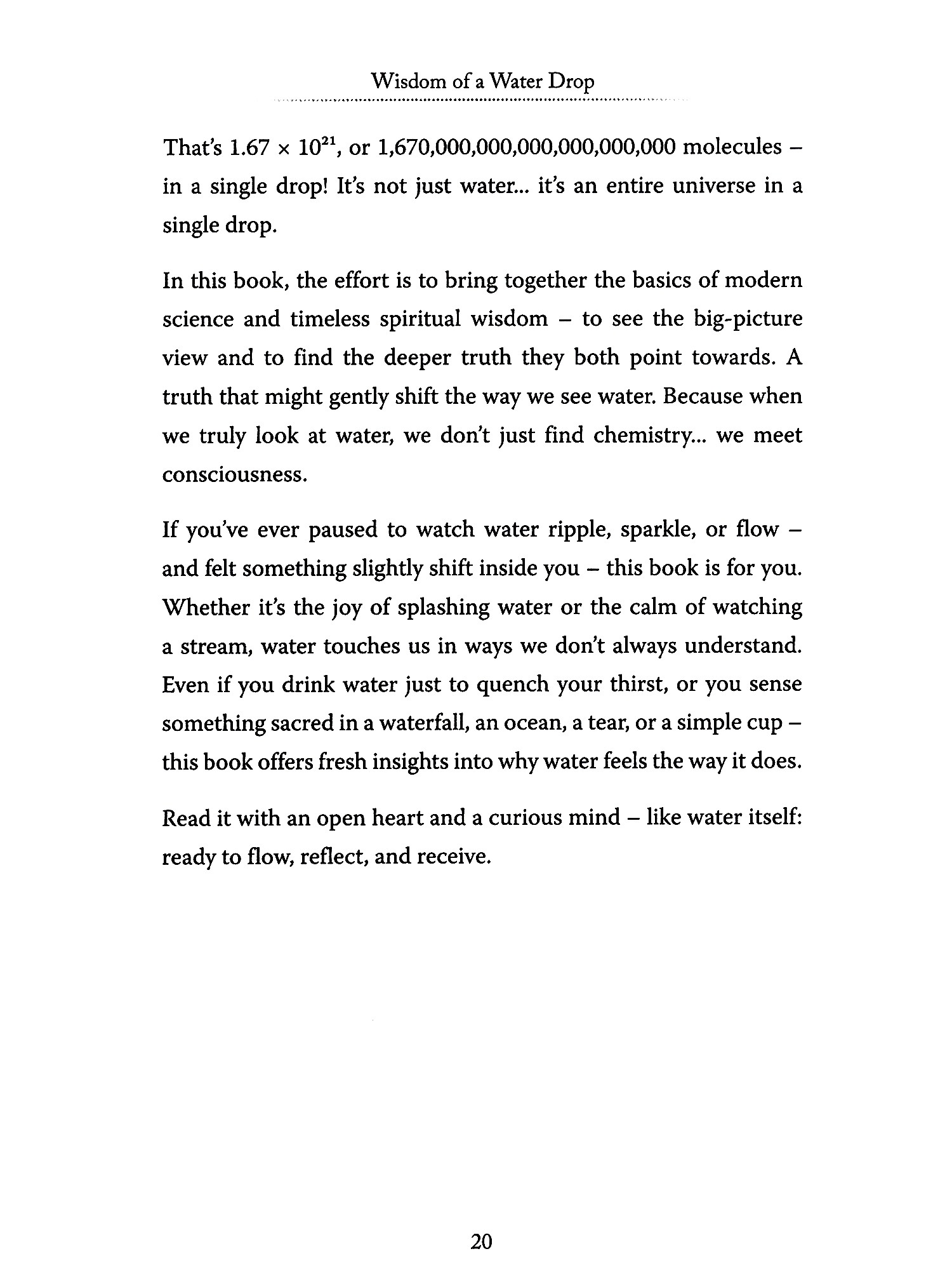It is rare to come across a work that touches both the mind Land the soul, that speaks to the scientist and the seeker alike. "Wisdom of a Water Drop" is one such offering. In these pages, Krithika Prasad brings to light the forgotten sacredness of water while weaving in the modern understandings that echo what the ancients once knew deeply: that water is not merely a substance, but a living presence intelligent, responsive, and foundational to life itself. For over three decades, I have explored water as a carrier of consciousness, a recorder of energy, and a mirror to the human soul. In my scientific endeavours and personal spiritual practice, water has always revealed itself as the most sensitive, subtle, and profound medium a messenger between the physical and the metaphysical. To see this truth reflected in Krithika's work is both affirming and deeply moving.