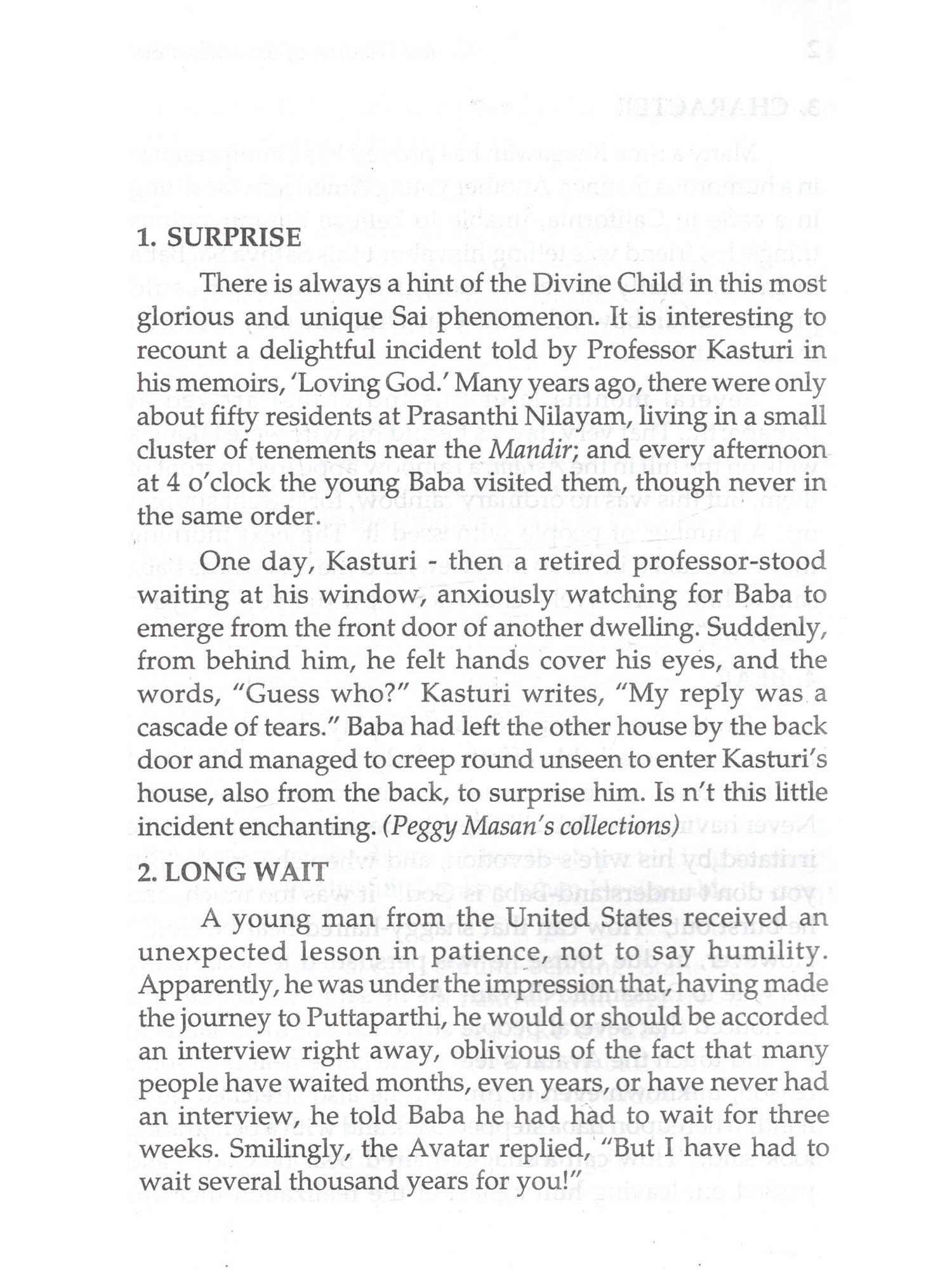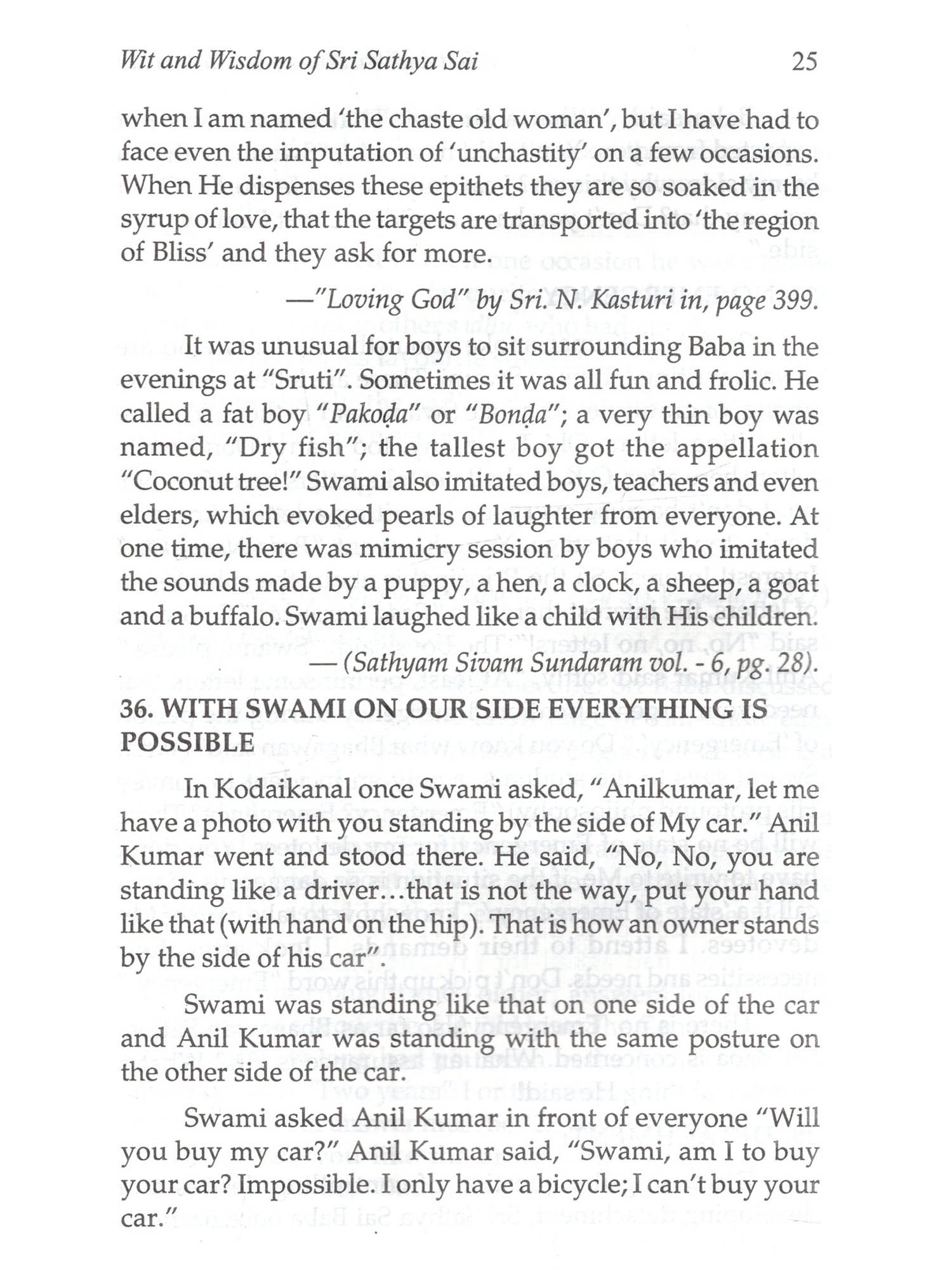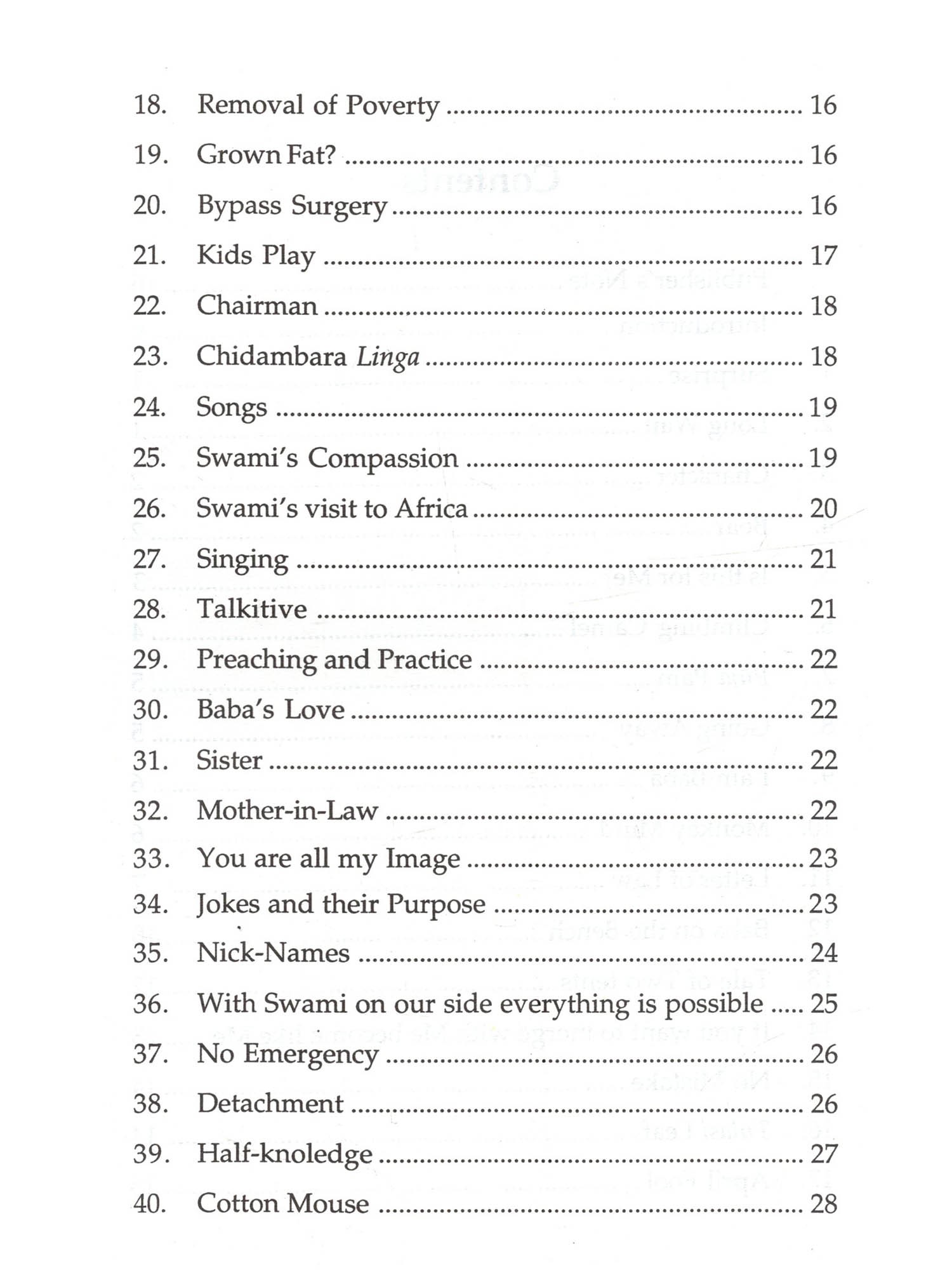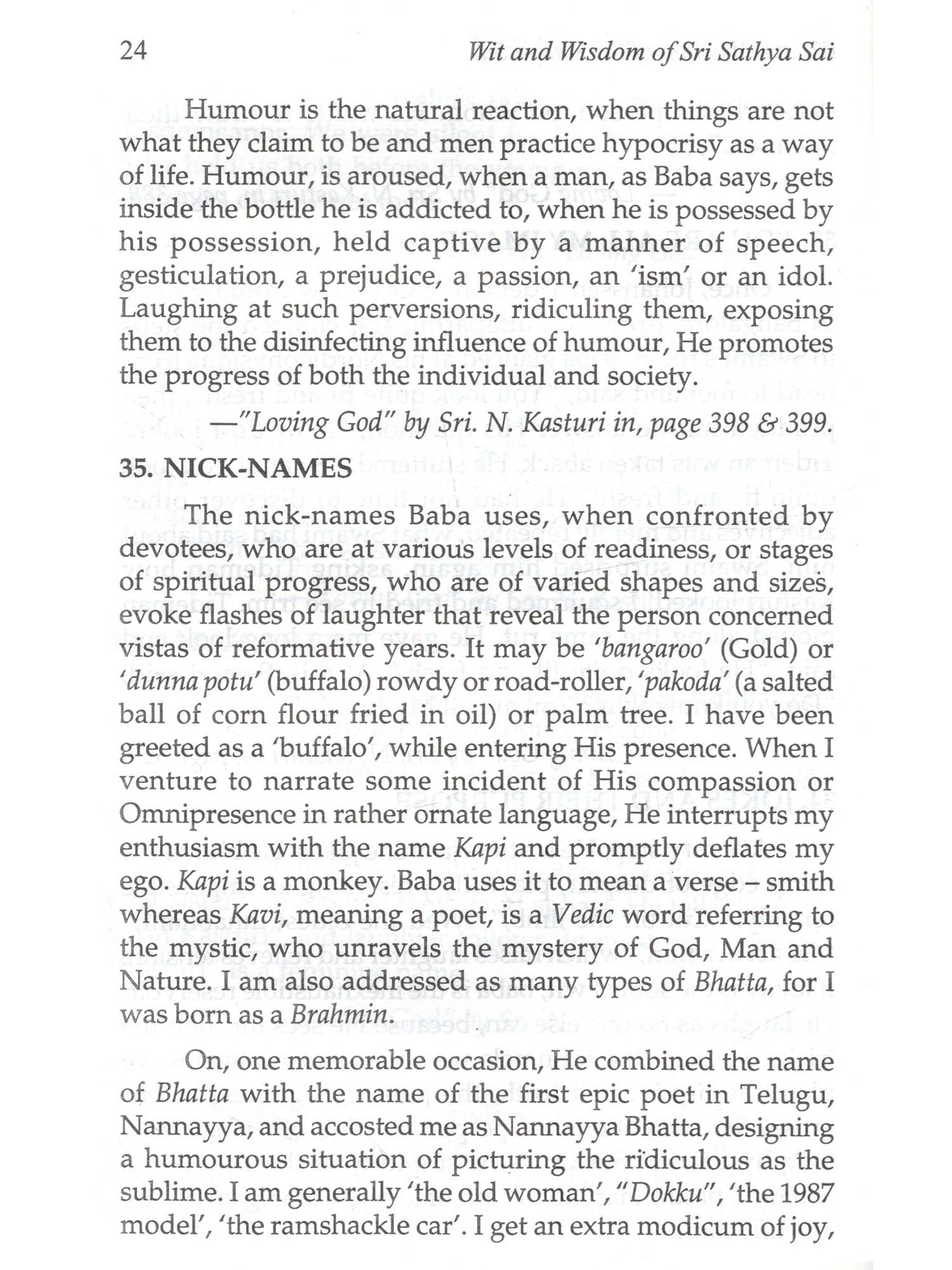 Bhagawan Sri Sathya Sai Baba's sense of Divine Humour is proverbial, as humour is a divine attribute. Bhagawan never wastes His words. Each word of Him even when it is humourous while it makes one to laugh joyfully carries an important spiritual message Swami says, "Be always happy with a smiling face." Swami illumined every occasion with a bunch of jokes, a burst of laughter, a song or a story or proverb to uplift devotees in spiritual progress towards Divinity. Baba's humour is lively and forth-right which instructs and enlivens; it never hurts but blesses all. It is Humour that provides both light and delight. This interesting collection of Divine Humours and words of wisdom, collected from various reliable sources is but a drop in the "Sai Ocean." The devotees may immerse themselves in these incidents, enjoy and get cheered to carry on their spiritual sadhana with added gusto!