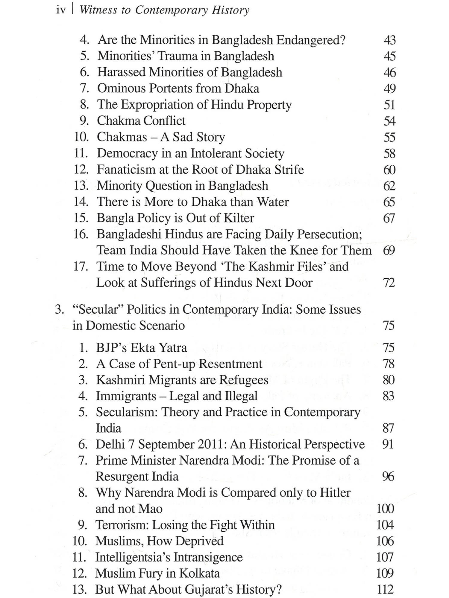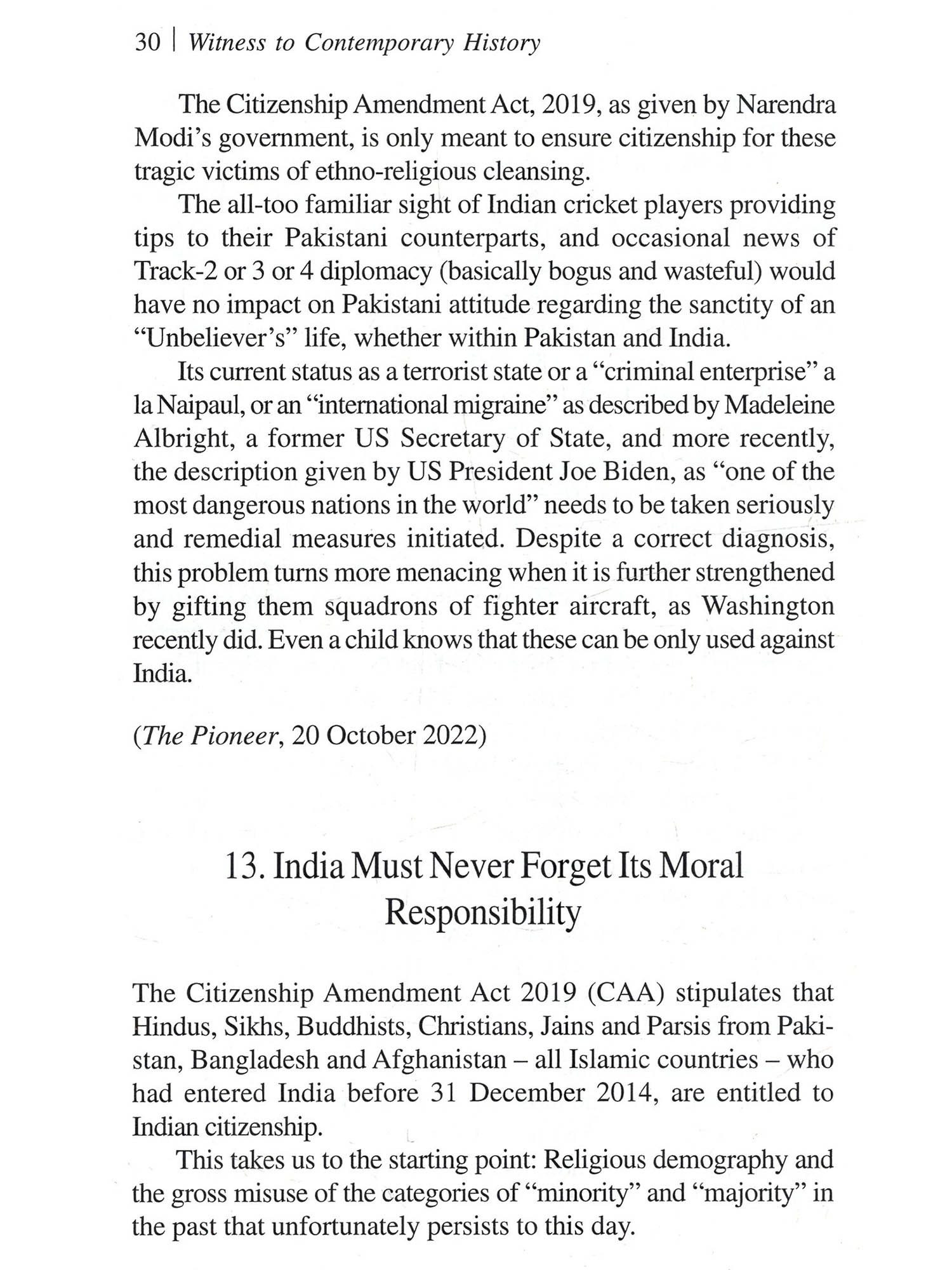 These articles were written for both the print and the digital media between 1991 and 2023, covering a wide range of themes. Broadly speaking, issues dealt here were also conveyed through my talks at various forums in India and abroad - both in mainstream academic and learned non-academic circles, meet-ings of Indian diaspora, in both friendly and hostile environment at Berlin, Birmingham, Bradford, Cardiff, Cambridge, Canberra, Chicago, Colombo, Dhaka, Dublin, Edinburgh, Frankfurt, Helsinki, Hull, London, Manchester, Munich, Nottingham, New York, New Jersey, Oxford, Philadelphia, Rugby, Singapore, Tokyo, Villanova, Warsaw, Washington, Swansea and various places. The condition of the persecuted religious minorities in Paki-stan and Bangladesh, and the urgency of some meaningful reme-dial measures by the international community, especially by the Government of India was high on my priority. India's political and social background that had always influenced government think-ing on such matters provided the necessary backdrop. Hence, it was a matter of fulfilment for many of us, writing/campaigning on the tragic plight of Hindus in the neighbouring Islamic countries, and most certainly for thousands, perhaps mil-lions of such refugees waiting for securing Indian citizenship, when the Indian Parliament enacted the Citizenship Amendment Act in 2019. We all know the stellar role played by the NDA government and particularly the efforts of Prime Minister, Narendra Damodardas Modi and the Home Minister Amitbhai Anilchandra Shah in this path-breaking legislation.¹ The plight of the Hindu, Buddhist, Sikh, Jain, Christian, and Zoroastrian minorities in Pakistan and Bangladesh, and India's relations with those countries (Chapters 1 and 2) accounts for thirty (30) articles out of a total of ninety three (93). Many of these articles obviously also dealt with the nature of the state-system of these two countries, especially, their religious and cul-tural policies. The piece on BJP's Foreign Policy when the former's first-ever website was launched in 1998 was based on the experience I had gathered in writing these articles. After all, a nation's external relations to a large extent are also conditioned by the local milieu. In Chapter 3, "Secular" Politics in Contemporary India. Some Issues in Domestic Scenario, there are sixteen (16) articles on the theory and practice of "secularism" in India, 1947 onwards, well reflected in its political system/culture, and in the conduct of its external relations. In these articles, I have repeatedly brought up various fault lines in contemporary India's body politic, includ-ing the necessity of scrapping Article 370, the plight of the Hindu refugees from our own Kashmir valley and the imperative neces-sity of sending them back and their proper rehabilitation. Though Article 370 was made void by the BJP led NDA Government, but no solution has been found for the Hindu refugees from the Kashmir valley. I had also raised the issue of Waqf. The latest legislative measures appear to have taken care of many anoma-lies in the system; may be more is expected. The next chapter - "Another Facet: "Secular" Distortions in India's Foreign Policy: Price We Pay", logically complementary to the previous chapter, covers through the nineteen articles (19) some of the major policy decisions in the realm of India's exter-nal relations and its implementation - its success and failure. This section has also taken up some important regional satraps and their views regarding India's external relations. One can clearly notice how often it was shaped by their narrow understanding of national issues that obfuscates the dividing line between domestic and foreign policy domains.