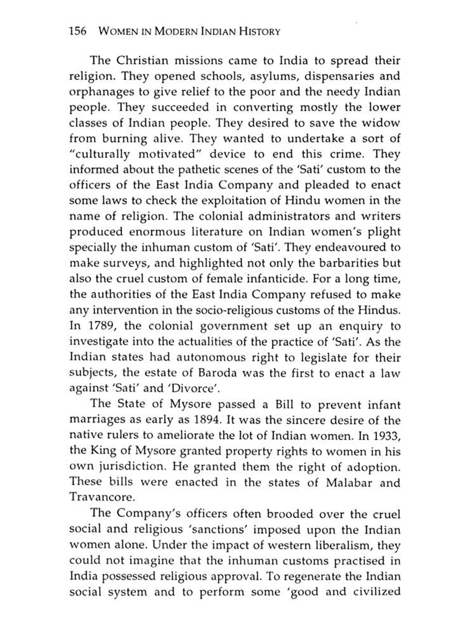 Women in Modern Indian History delineates the story of Indian womanhood after the renaissance of the 19th century. He traces the influence of the new education upon the 'cribbed and cabined' women in Indian society. Prof. Anand tells us about the changes in attitude and aptitude of urban women. The awakening of modern Indian women was not only amazing but also satisfying as the men reformers attempted to ameliorate their socio-economic lot. Rammohun Roy began the crusade against the practice of Sati. In 1829, the British enacted the Sati Abolition Act. Many others took up the women's issues and helped the British to pass legal enactments for the socially crippled women of India. Labour organisations came into existence to facilitate the working class women in industries, mines and factories.