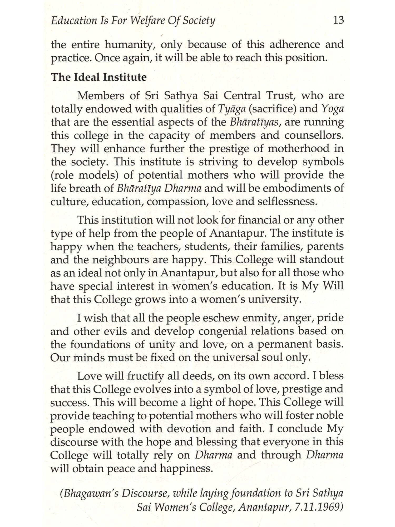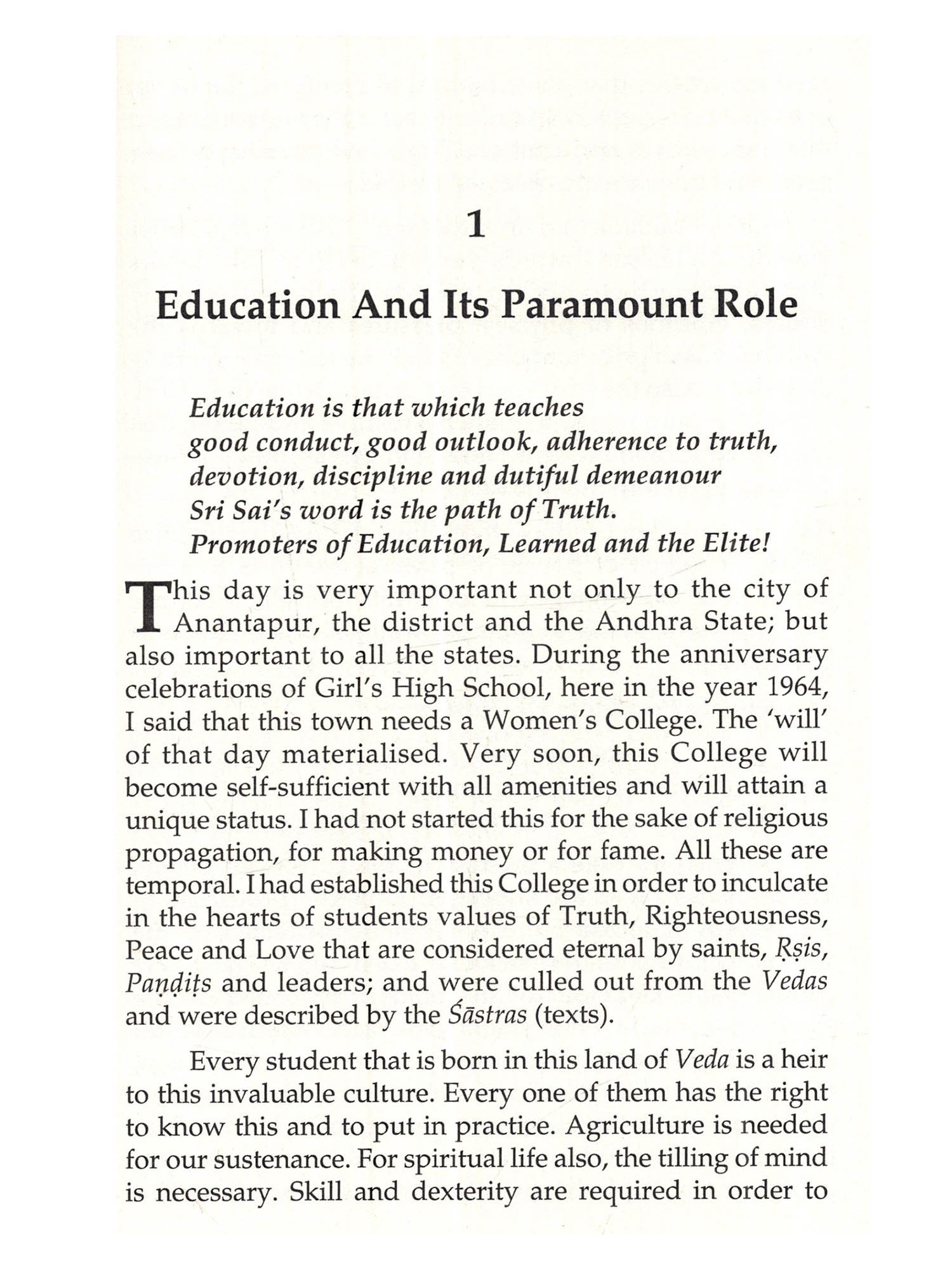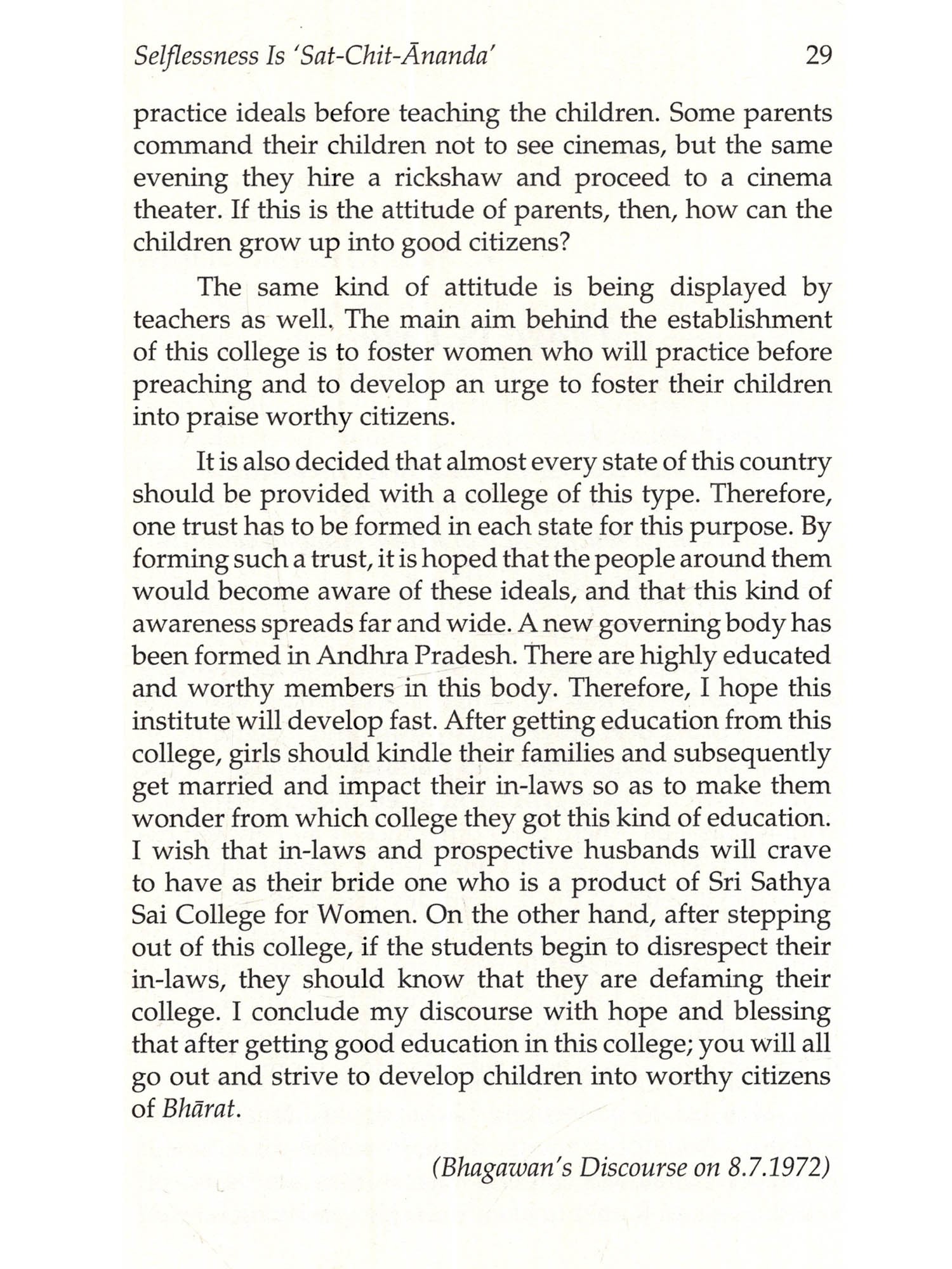 The sweetest feeling in this world is that of a mother. If one has to know the culture of a country, one must observe the traits of mothers of that country", says Bhaga-wan Baba. The Bharatiya Culture proclaims 'Vidya' as that which liberates man from the vicious cycle of births and deaths. Women should imbibe this kind of education and must spread the effulgence of selfless love and pristine human qualities to the family and the society at large. A student's foremost duty is to respect the parents. The girl students should develop self confidence and must become self reliant. Women are not weaklings; they are mighty, says Baba.