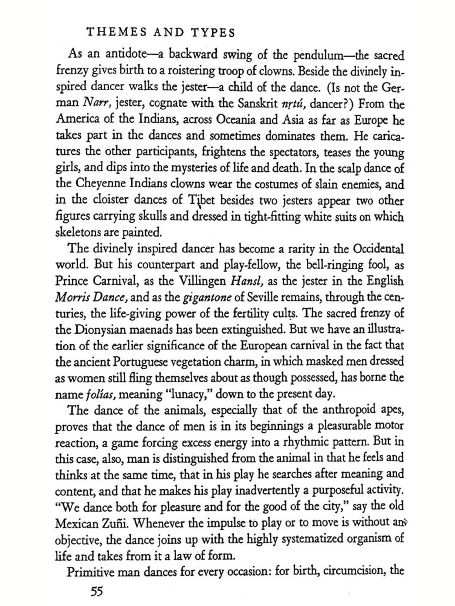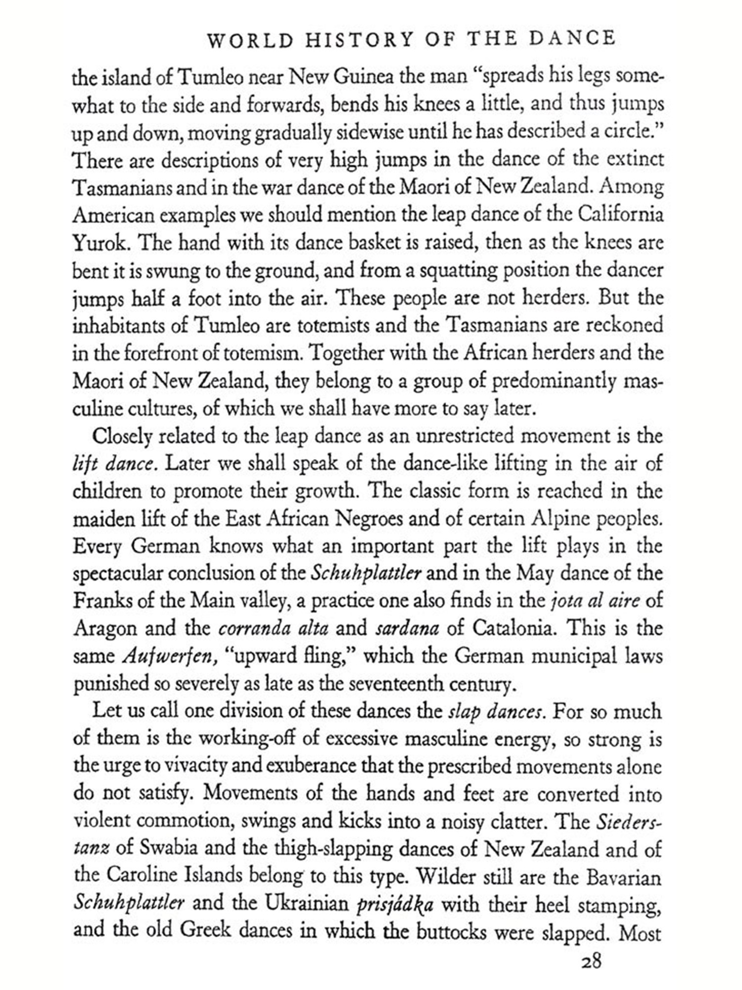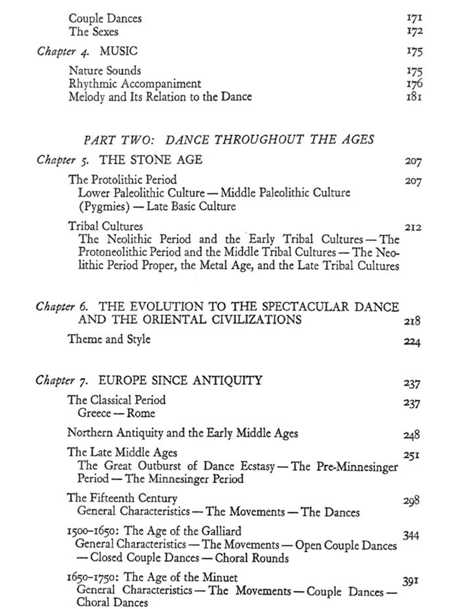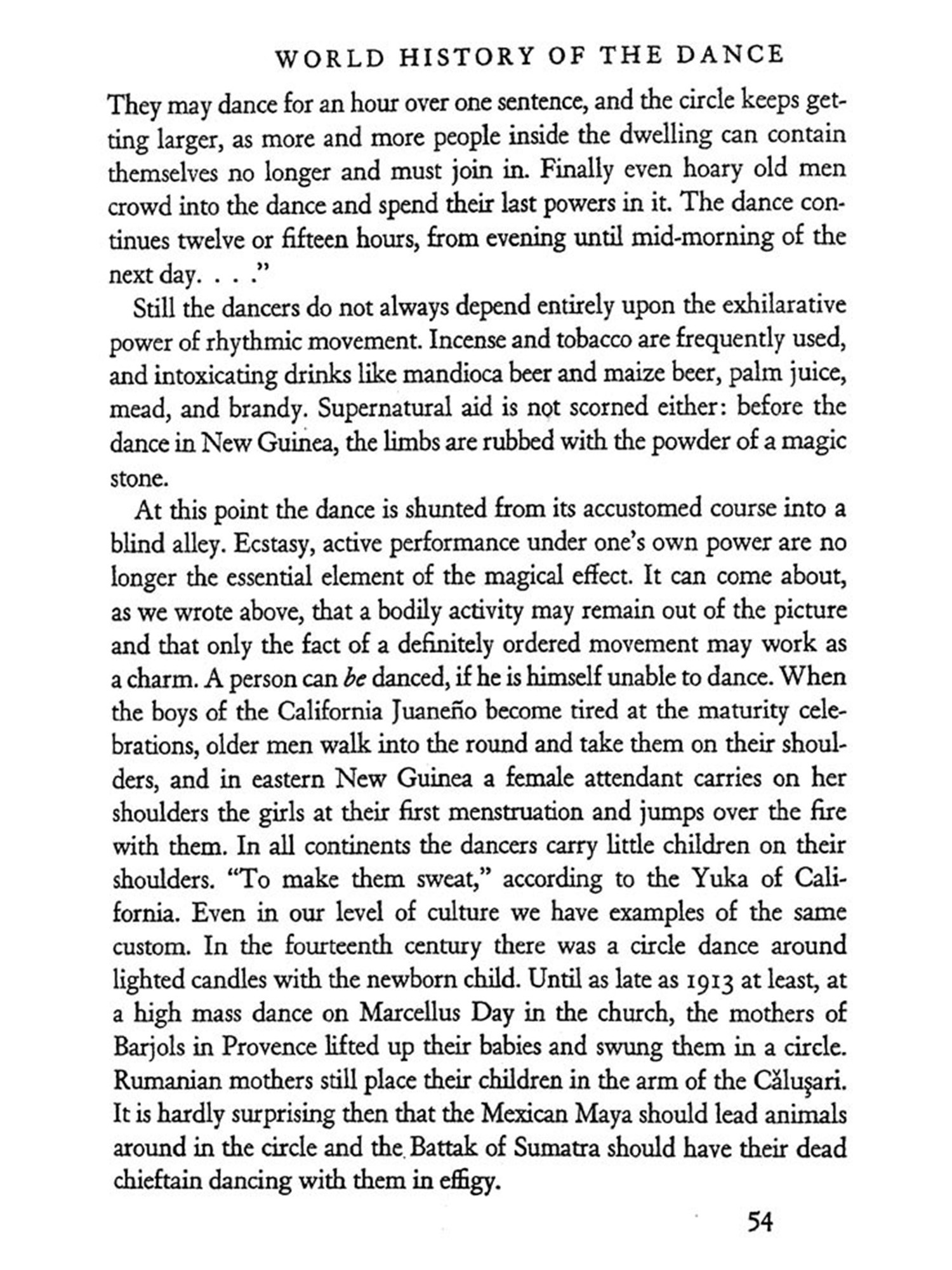THE dance is the mother of the arts. Music and poetry exist in T time; painting and architecture in space. But the dance lives at once in time and space. The creator and the thing created, the artist and the work are still one and the same thing. Rhythmical patterns of movement, the plastic sense of space, the vivid representation of a world seen and imagined-these things man creates in his own body in the dance before he uses substance and stone and word to give expression to his inner experiences. The word art does not altogether express this idea. Indeed, one almost fears to use the word, for its present-day significance, exaggerated and at the same time circumscribed, is not sufficient to explain what the dance in all its richness really is. The dance breaks down the distinctions of body and soul, of abandoned expression of the emotions and controlled behavior, of social life and the expression of individuality, of play, re-ligion, battle, and drama-all the distinctions that a more advanced civilization has established. The body, which in ecstasy is conquered and forgotten and which becomes merely a receptacle for the super-human power of the soul, and the soul, which achieves happiness and bliss in the accelerated movements of a body freed of its own weight; the need to dance, because an effervescent zest for life forces the limbs from sloth, and the desire to dance, because the dancer gains magic powers, which bring him victory, health, life; a mystic tie binding the tribe when it joins hands in the choral dance, and the unconstrained dance of the individual in utter devotion to self-there is no "art" which includes so much, Repressed powers are loosed and seek free expression; an innate sense of rhythm orders them into lively harmony. Harmony deadens and dis sipates the will. Delivered then from his will, the dancer gives himself over to the supreme delight of play prescribed by custon, gives himself over to the exhilaration, which carries him away from the monotony of everyday life, from palpable reality, from the sober facts of his ex-perience-thither where imagination, fancy, and vision waken and become creative. In the ecstasy of the dance man bridges the chasm between this and the other world, to the realm of demons, spirits, and God. Captivated and entranced he bursts his earthly chains and trembling feels himself in tune with all the world. "Whosoever knoweth the power of the dance, dwelleth in God," cries the Persian dervish poet Rumi im-pulsively. The dance, inherited from savage ancestors as an ordered expression in motion of the exhilaration of the soul, develops and broadens into the search for God, into a conscious effort to become a part of those powers beyond the might of man which control our destinies. The dance becomes a sacrificial rite, a charm, a prayer, and a prophetic vision. It summons and dispels the forces of nature, heals the sick, links the dead to the chain of their descendants; it assures sustenance, luck in the chase, victory in battle; it blesses the fields and the tribe. It is creator, preserver, steward, and guardian. From its deep and far-reaching influence it will be apparent that in the life of primitive peoples and of ancient civilizations scarcely any-thing approaches the dance in importance. It is no art that disregards bread; on the contrary, it provides bread and everything else that is needed to sustain life. It is not a sin, proscribed by the priest or at best merely accepted by him, but rather a sacred act and priestly office; not a pastime to be tolerated only, but a very serious activity of the entire tribe.