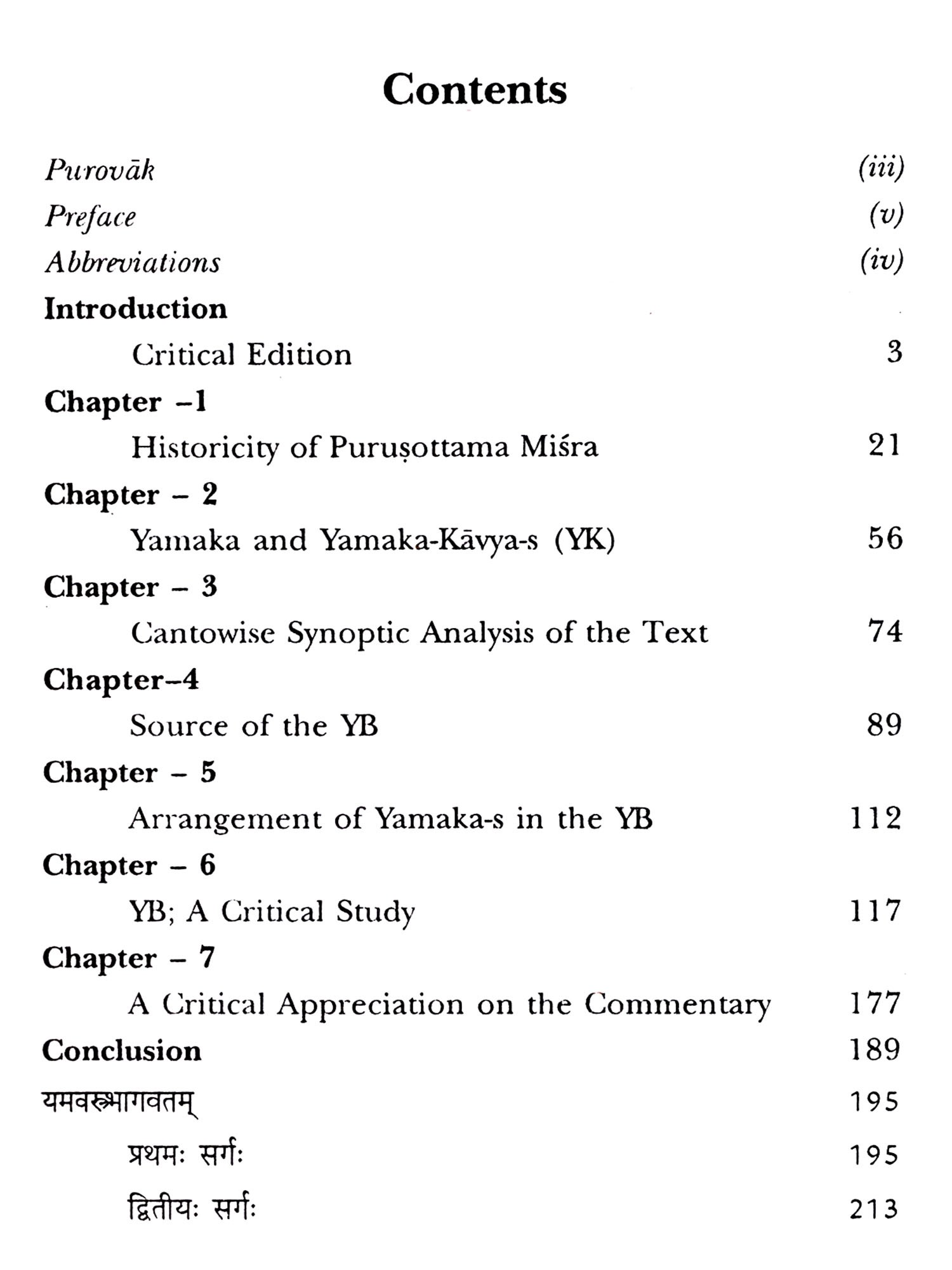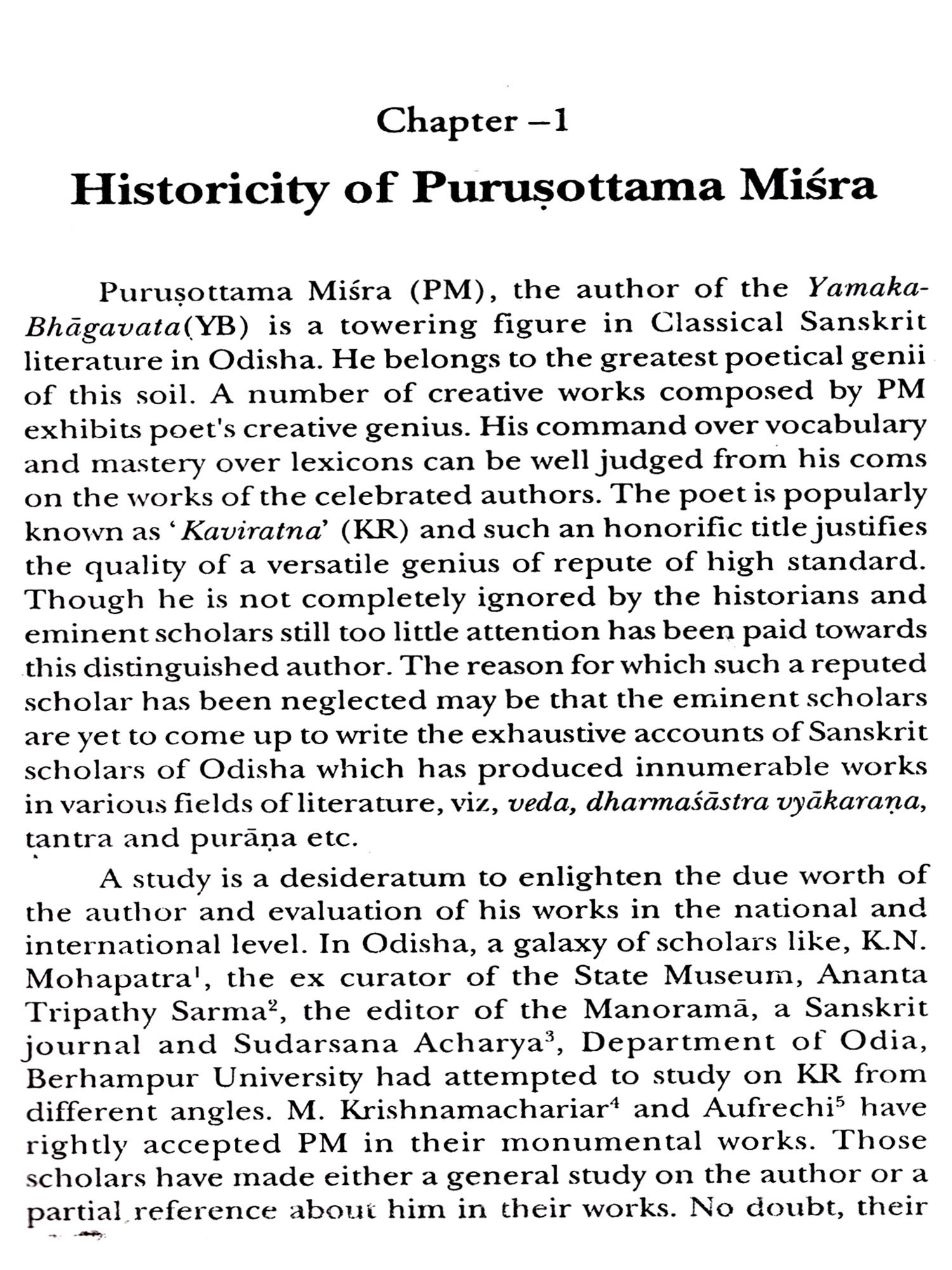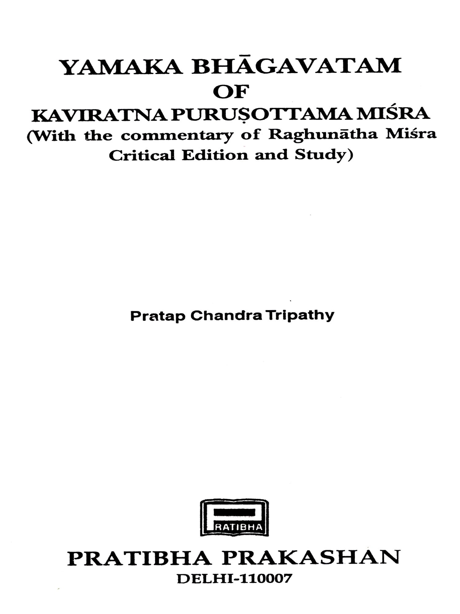 The present text Yamaka Bhagavata of Purusottama Misra is not an exception. The work deals with the sports (lila) of Krsna in chiming verses throughout. The present work is a critical study and edition of the text written by Purusottama Misra (17th CAD), an Odishan Poet. The interesting features of the text, apart from its literary form are its linguistic peculiarities and the fact that it reflects a variety of Krsna traditions. Purusottama Misra selects his episode from the tenth skandha of the Bhagavata Purana, one of the accepted traditional Hindu texts and summerises it within 501 verses in eight cantos.
