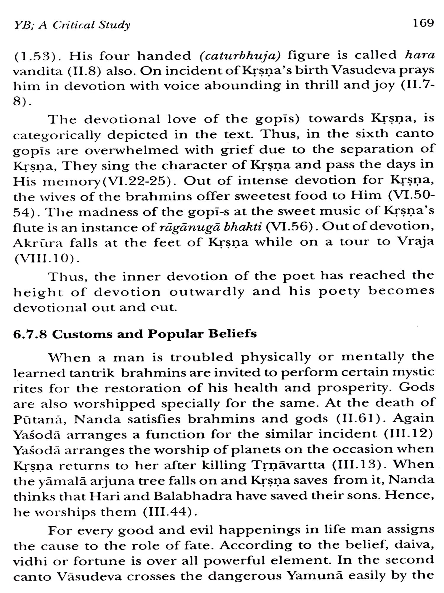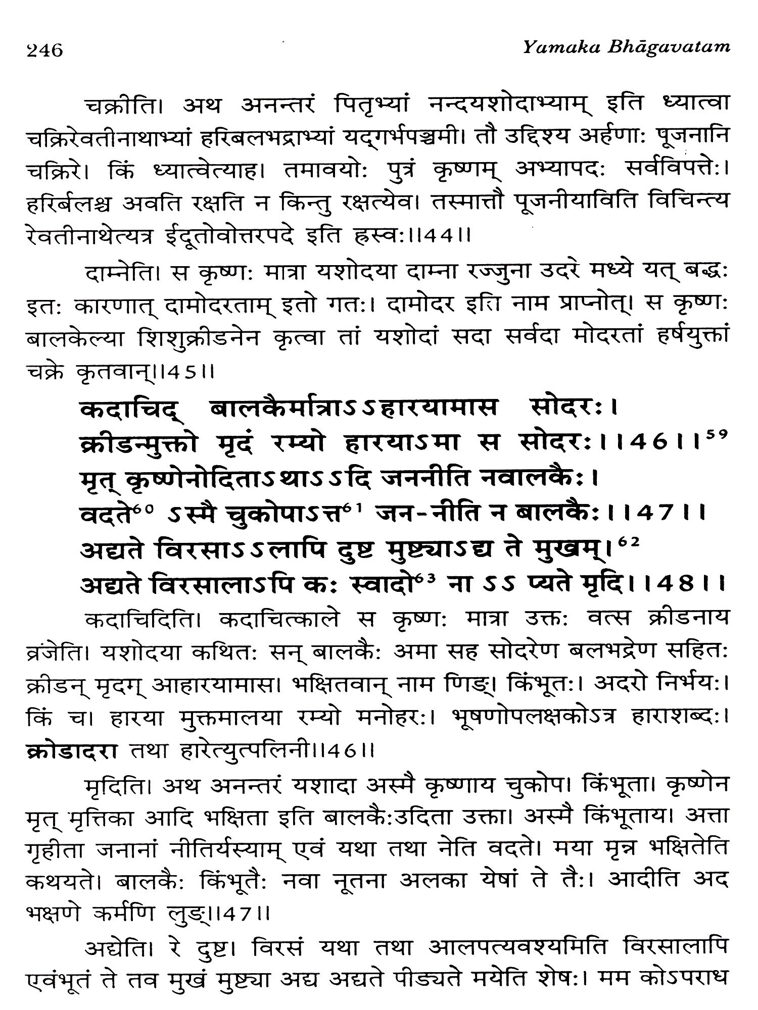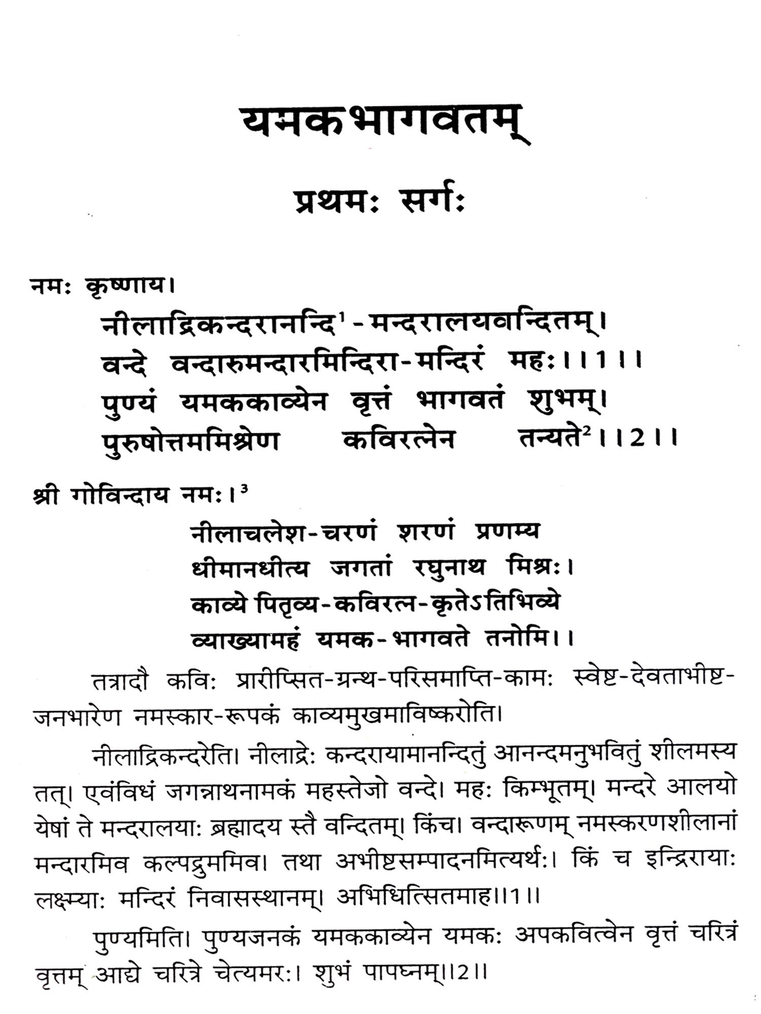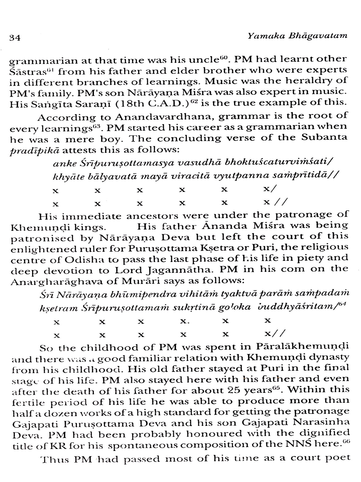 The present text Yamaka Bhagavata of Purusottama Misra is not an exception. The work deals with the sports (lila) of Krsna in chiming verses throughout. The present work is a critical study and edition of the text written by Purusottama Misra (17th CAD), an Odishan Poet. The interesting features of the text, apart from its literary form are its linguistic peculiarities and the fact that it reflects a variety of Krsna traditions. Purusottama Misra selects his episode from the tenth skandha of the Bhagavata Purana, one of the accepted traditional Hindu texts and summerises it within 501 verses in eight cantos.