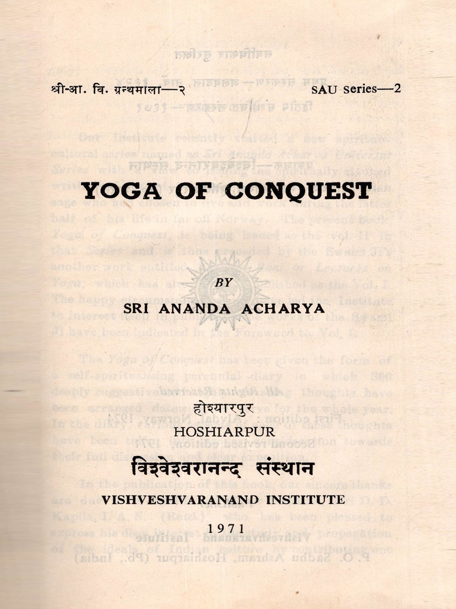 Our Institute recently started a new spirituo-cultural series named as Sri Ananda Acharya Universal Series with a view to issuing the spiritually attuned writings of Swami Sri Ananda Acharya, an Indian sage who had chosen to live and work during the latter half of his life in far off Norway. The present book, Yoga of Conquest, is being issued as the vol. II in that Series and is thus preceded by the Swami Ji's another work entitled Karlima Rani or Lectures on Yoga, which has already been published as the Vol. I. The happy circumstances which have led the Institute to interest itself in publishing the works of the Swami Ji have been indicated in the Foreword to Vol. I.