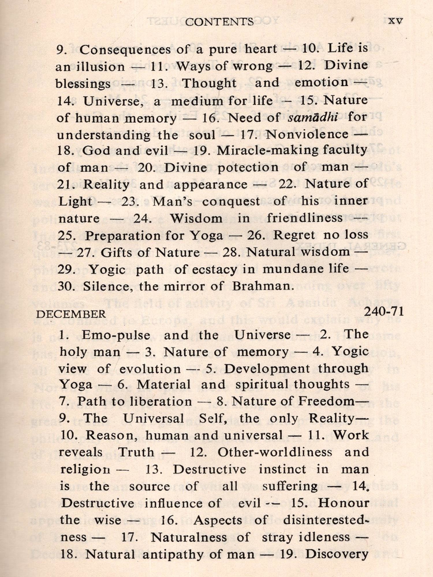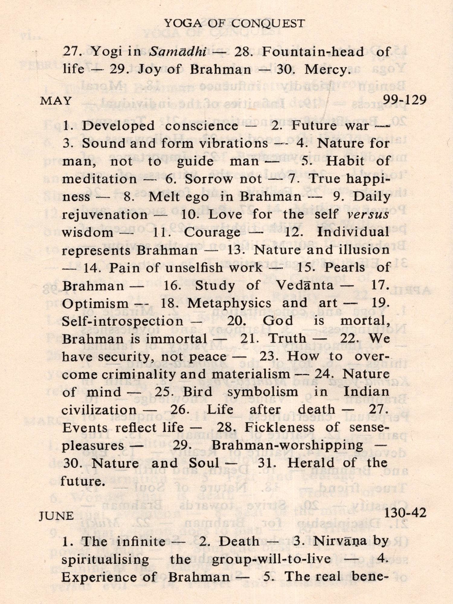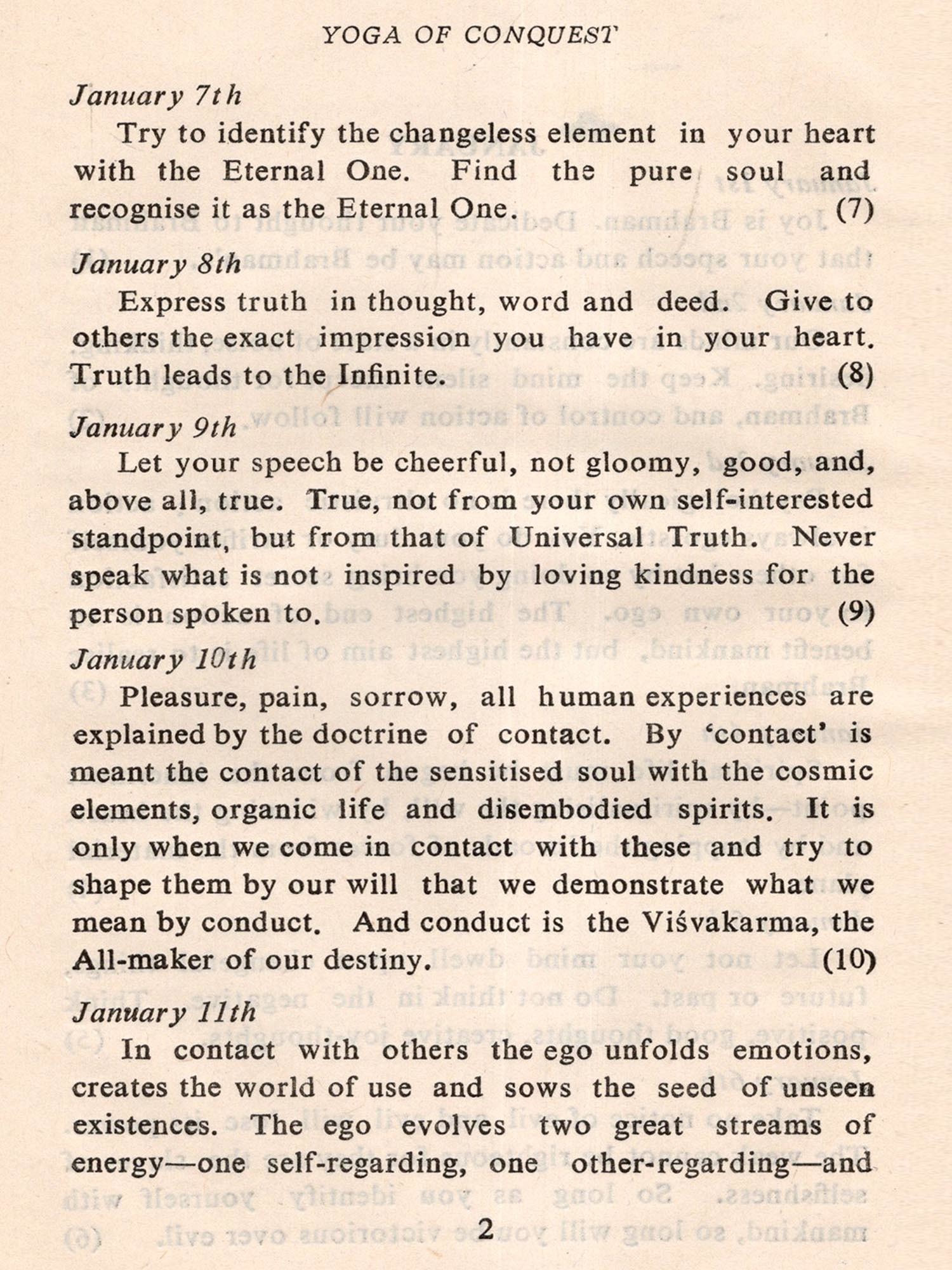 The Yoga of Conquest has been given the form of a self-spiritualising perennial diary in which 366 deeply suggestive and highly elevating thoughts have been arranged datewise, to serve for the whole year. In the diary, various aspects of each of these thoughts have been taken into proper consideration towards their full discussion and clear exposition.