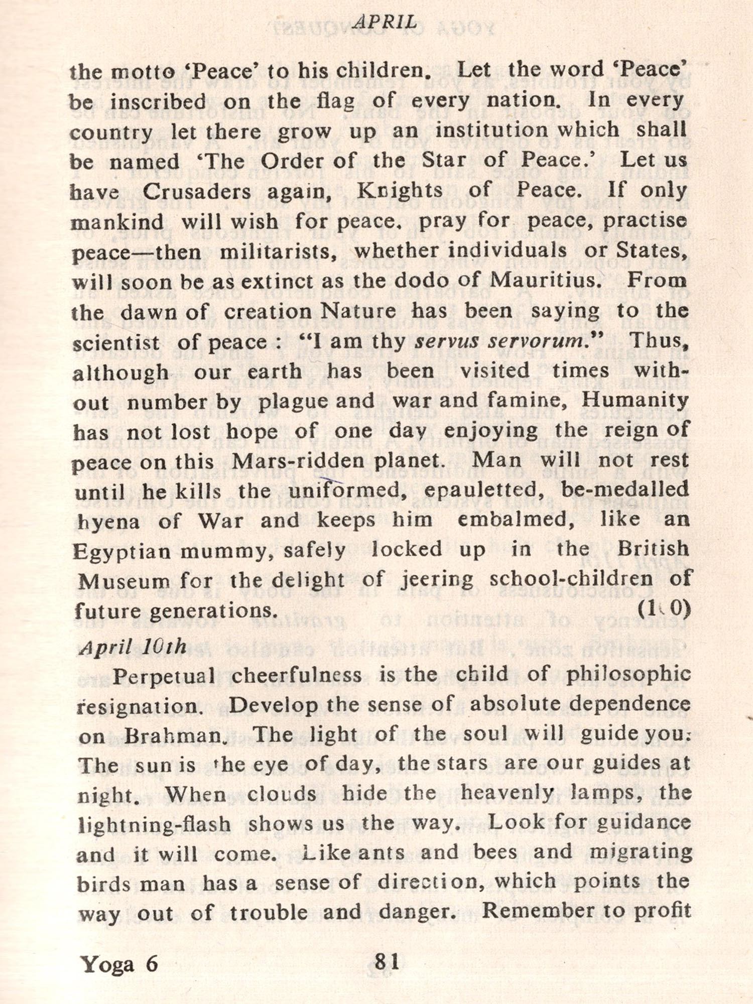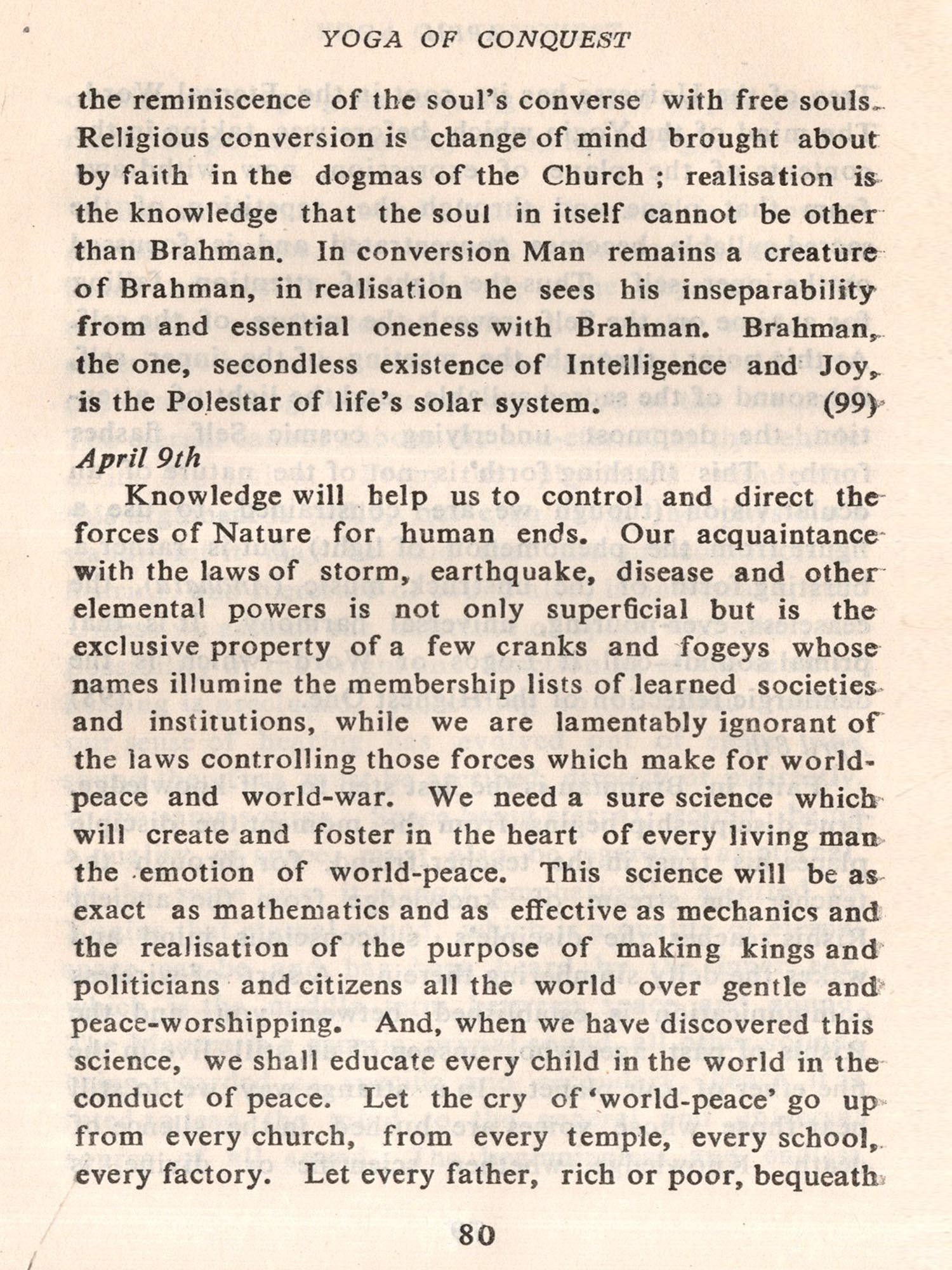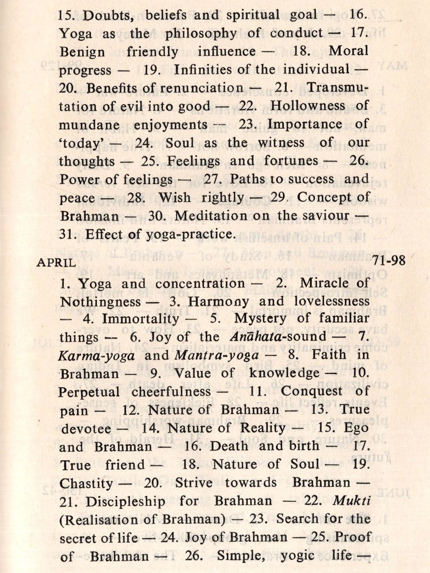 The Yoga of Conquest has been given the form of a self-spiritualising perennial diary in which 366 deeply suggestive and highly elevating thoughts have been arranged datewise, to serve for the whole year. In the diary, various aspects of each of these thoughts have been taken into proper consideration towards their full discussion and clear exposition.