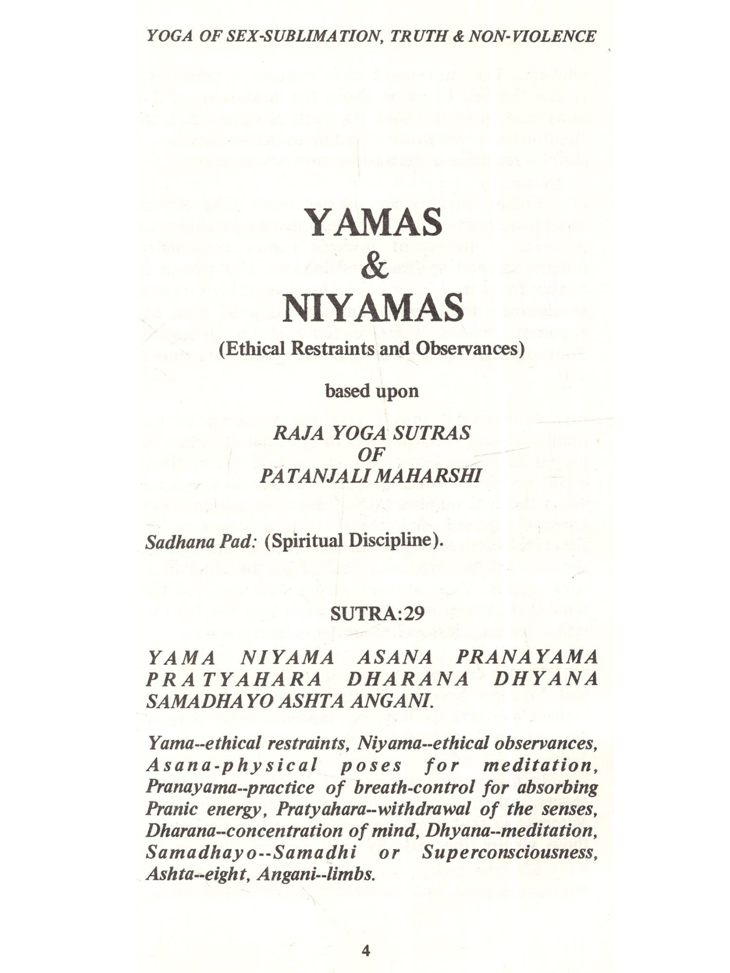All religious movements, spiritual disciplines, and mystic advancements are founded on the understanding of Dharma or the ethical value of life. It is Dharma that sustains all forms of human self-effort towards material security (Artha) and vital pleasures (Kama) in human life. And finally, it enables a person to reach out for the ultimate goal of existence, Moksha or Liberation which is the Infinite Spiritual Value of life. Therefore, it is very important for an aspirant to understand the subtle implications of practising the basic ethical qualities that are universally adopted by all religions of the world. Yamas Raja Yoga Sutras of Patanjali Maharshi present in brief aphorisms the basic ethical qualities which every aspirant must practise in his day to day life. These qualities are described in two groups (restraints) and Niyamas (observances). These two groups form the basic foundation of the advanced practices of Yoga in the form of Asana (physical posture), Pranayama (control of vital forces), Pratyahara (withdrawal of the senses), Dharana (concentration), Dhyana (meditation) and Samadhi (superconsciousness). Yamas emphasize the negation of immoral traits in human personality such as violence, falsehood, passion, greed and craving, by the practice of Ahimsa (non-violence), Satyam (truthfulness), Brahmacharya (control of passion or sex-sublimation), Asteya (non-stealing), and Aparigraha (non-covetousness). Niyamas emphasize the affirmation of positive moral virtues such as Shaucha (physical and mental purity), Santosh (contentment), Tapas (austerity), Swadhyaya (study of scriptures and repetition of Divine Name), and Ishwar Pranidhana (surrender to God). These Yamas and Niyamas constitute the basis for all ethical principles that enable a person to grow into a divine personality. All religious practices and mystic realizations are founded on these profound ethical qualities. They form the foundation not only for Raja Yoga (Yoga of Meditation), but also for all other Yogas, such as Jnana Yoga (Yoga of Wisdom), Bhakti Yoga (Yoga of Devotion), and Karma Yoga (Yoga of Action). Righteousness creates harmony in family, promotes success and prosperity in one's professional life, and establishes a higher form of culture and civilization for humanity. Different forms of moralities such as family morality, social morality, national morality, international morality, political morality, professional morality, and many others are founded on these basic principles of Dharma (righteousness) as enunciated in Yamas and Niyamas.