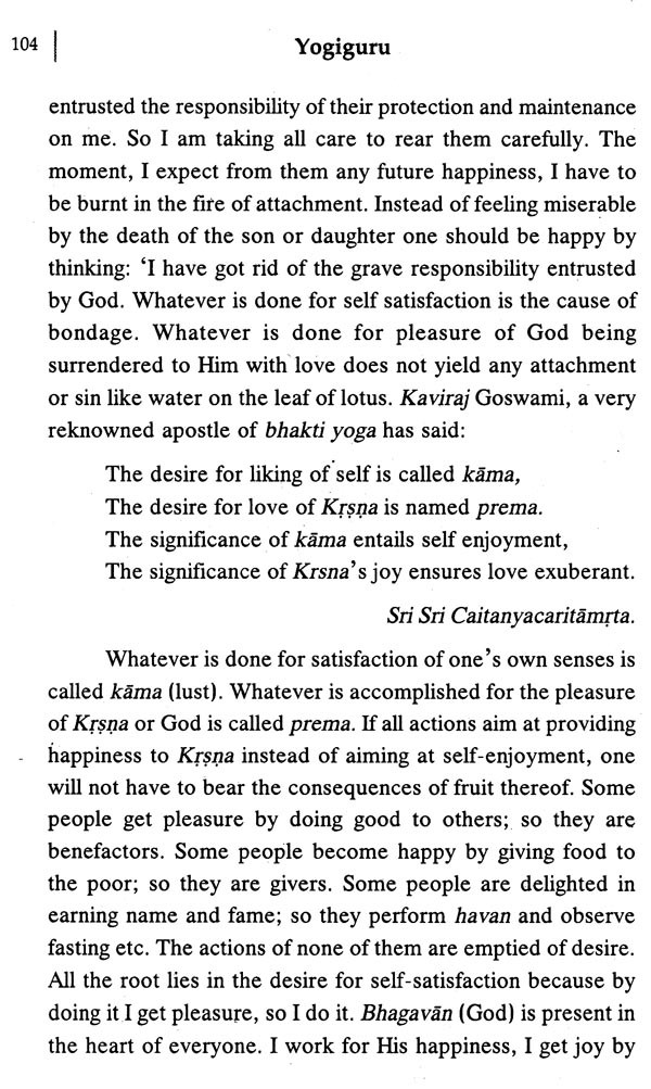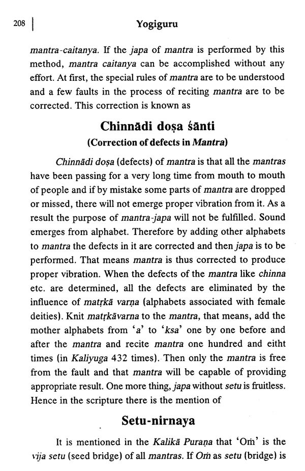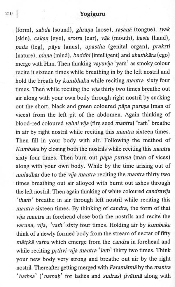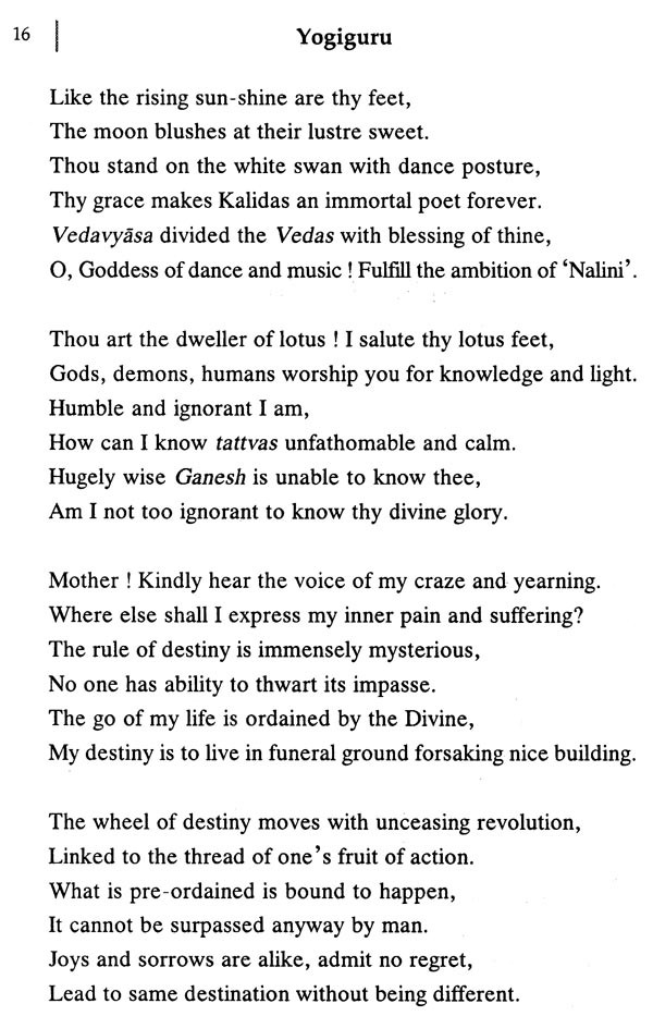 Sadguru Nigamananda paramahamsa attained puma siddhi (complete perfection) in tantra, jnana, yoga and prema. He wanted to accomplish the welfare of the world by propagating the spiritual principles of Sanatana dharma, spreading sat-siksa and serving jiva treating everyone as the manifestation of Siva. He wrote and published Yogiguru in Bengali language in the year 1906 and afterwards it was translated into various other languages. It is a unique and monumental book in the world of yoga and it has inspired a lot of people to adopt yoga as a way of life by which they have got rid of their grief and suffering. It has transformed the life of common man who walks bravely to attain his divinity within. This book discusses briefly the quintessence of yoga, the underlying tattvas of yoga, the easy and comfortable methods to practice yoga and finally the attainment of siddhi in yoga. That apart, in this book he has emphasized the role of yoga in our day to day life and established it as a positive and unfailing step for meaningful living. This book chiefly consists of four parts: Yogakalpa, Sadhanakalpa, Mantrakalpa and Svarakalpa. In Yogakalpa Sri Sri Thakur discusses the supremacy of yoga and practice of yoga; in Sadhanakalpa he describes the various methods of sadhana and the comfortable ways to perform sadhana; in Mantrakalpa he deals with the importance of mantra, mantra caitanya and performance of japa; in Svarakalpa he focuses on breath and control over breathing air so as to bring success in life. On the whole, this book initiates man to yoga and ensures enlightenment when he performs yoga with unshakable sincerity and unceasing practice relying on the grace of Sri Gurudev.