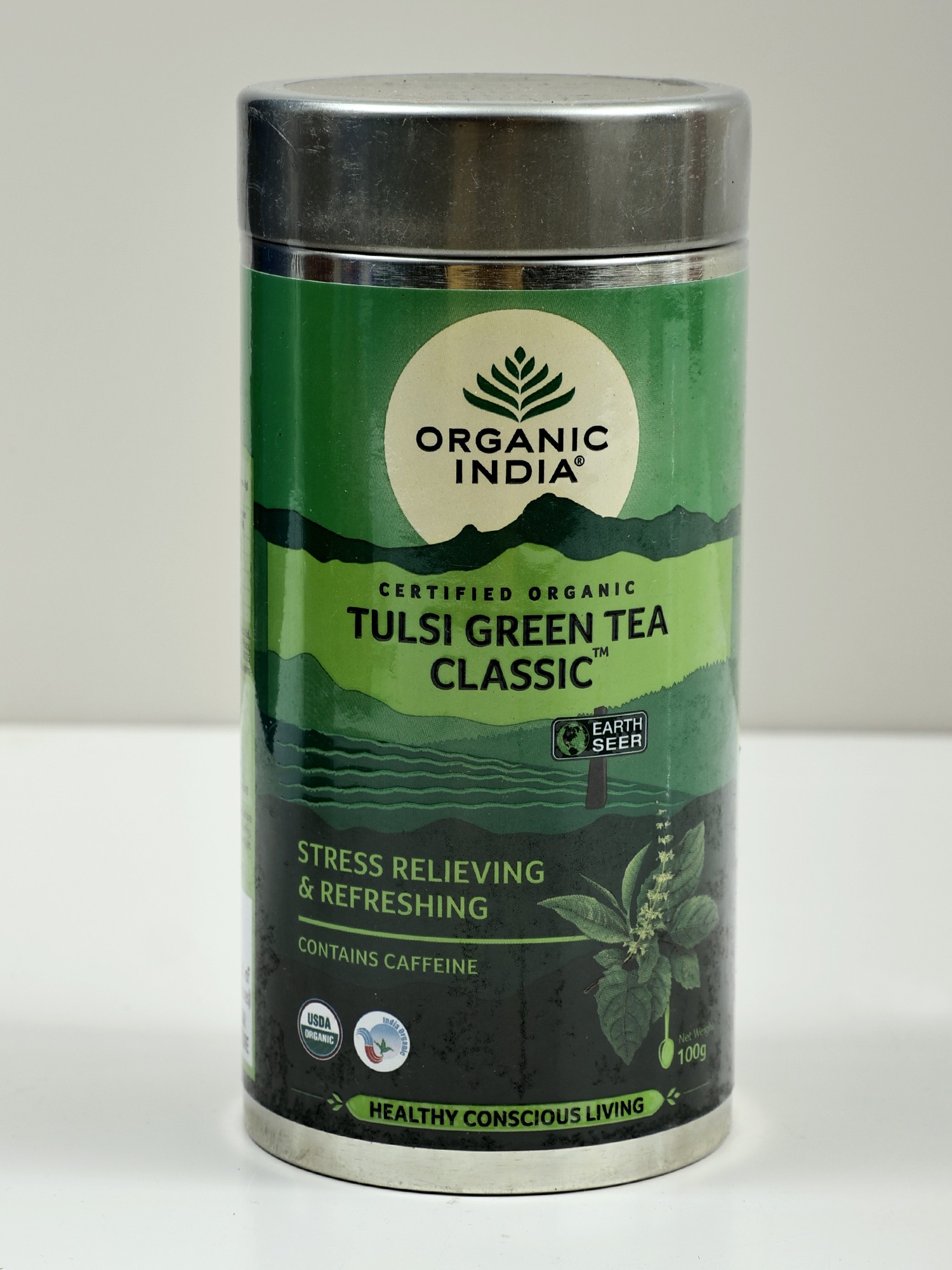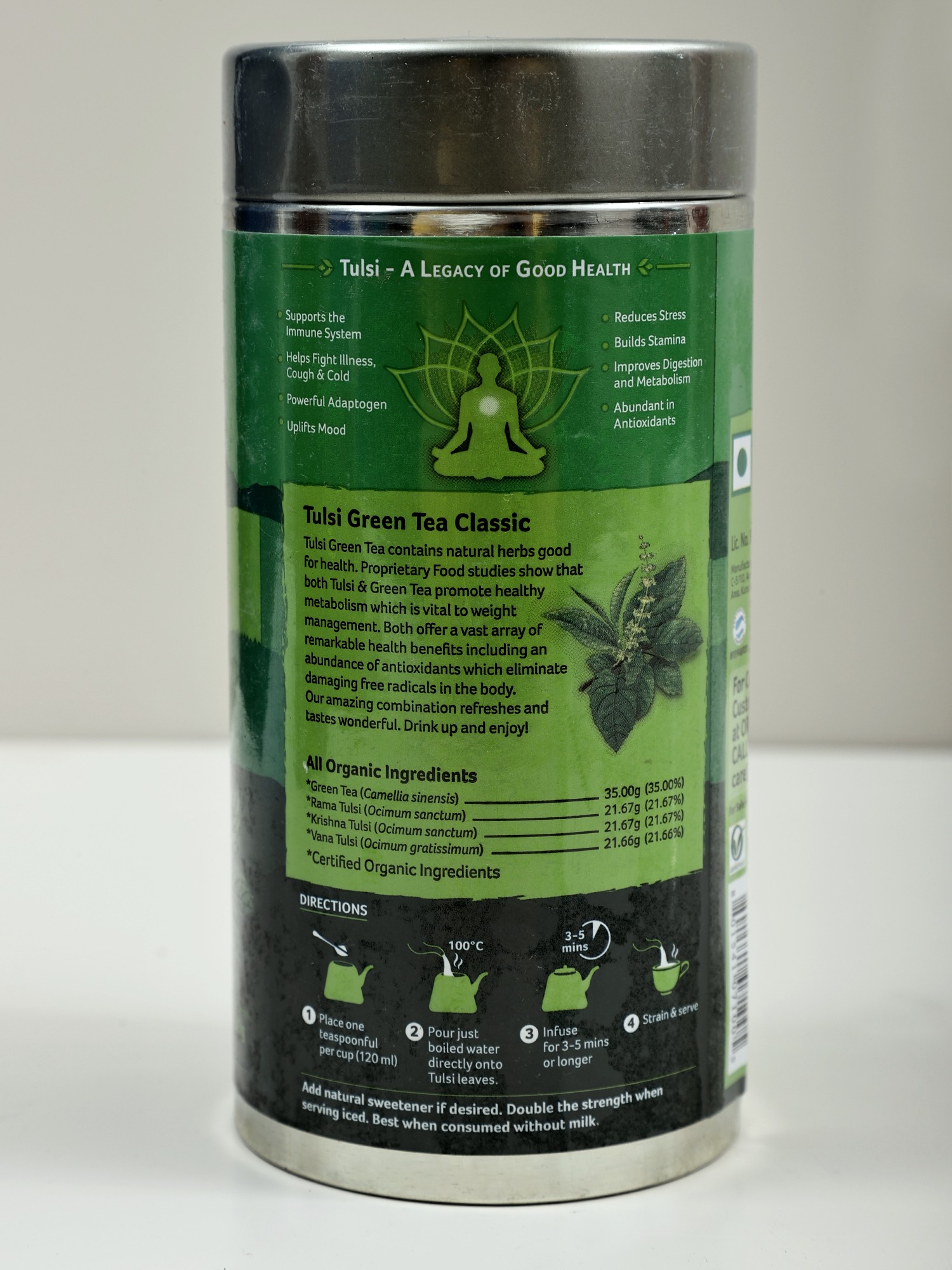 Green Tea (Camellia sinensis)- 35.00g (35%) Rama Tulsi (Ocimum sanctum)- 21.67g (21.67%) Krishna Tulsi (Ocimum sanctum)- 21.67g (21.67%) Vana Tulsi (Ocimum sanctum)- 21.67g (21.67%)