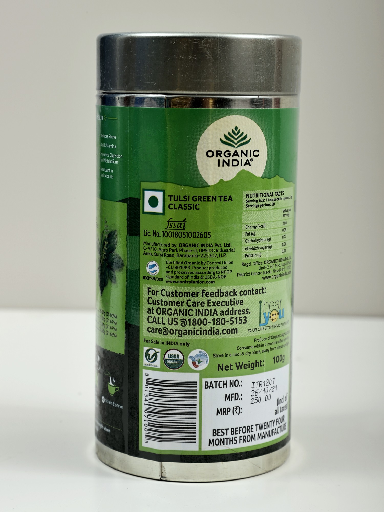 Directions: Place one teaspoonful per cup (120 ml) in Tea-pot/ cup and then pour boiling water directly on Tulsi leaves. Infuse for 3-4 minutes. Add sweetener if desired strain & serve. Double the strength when serving iced. Best when consumed without milk.