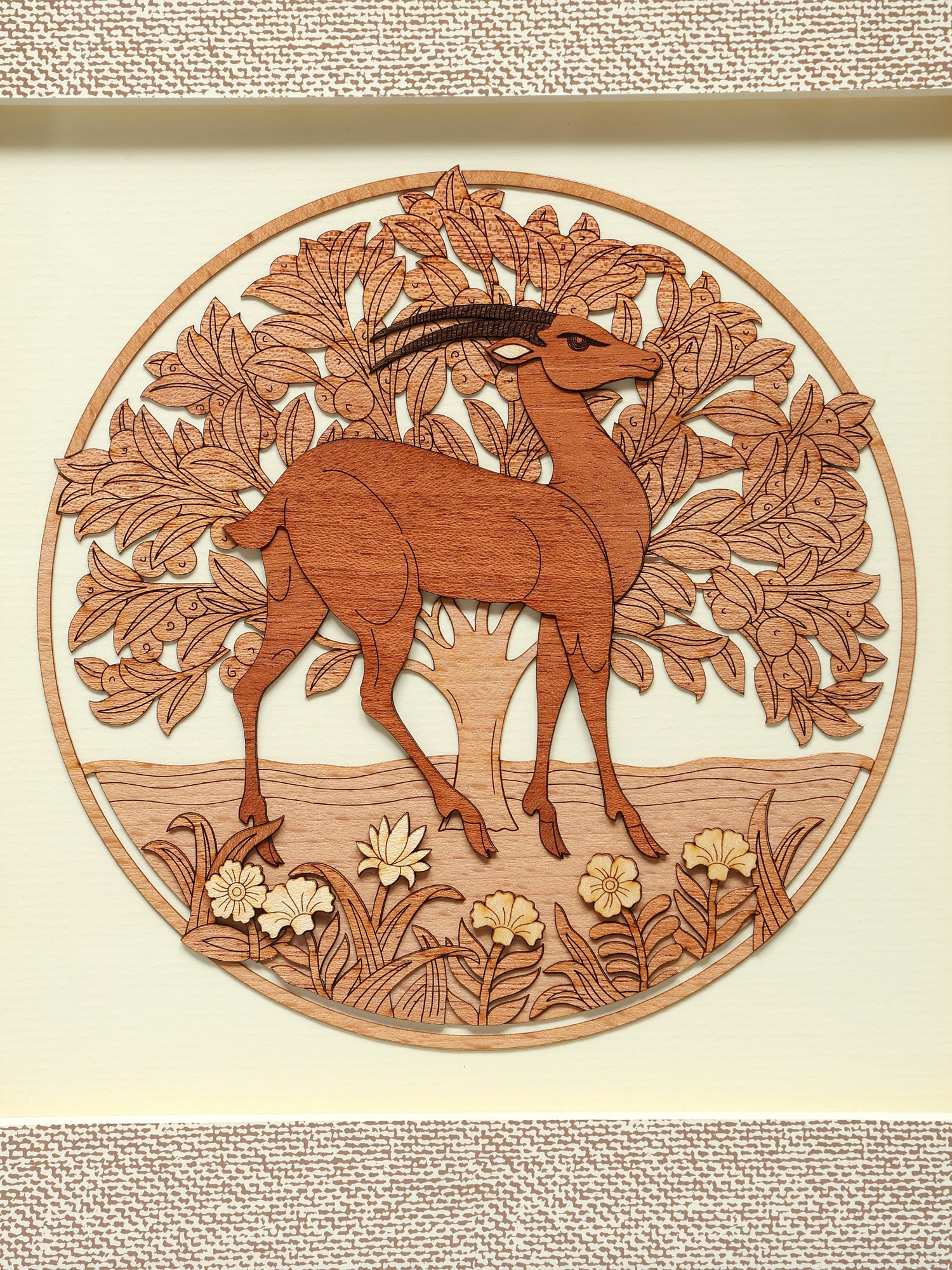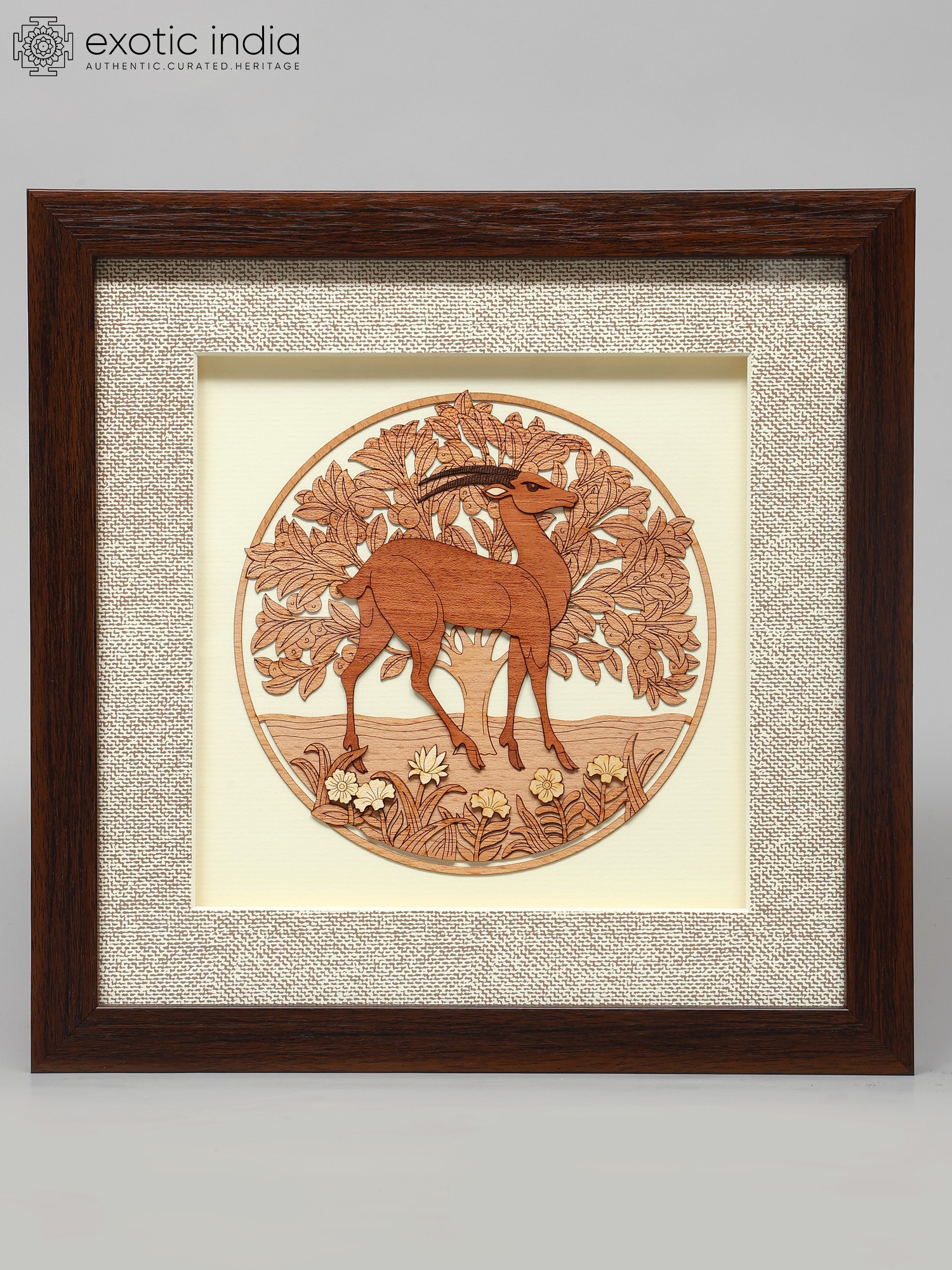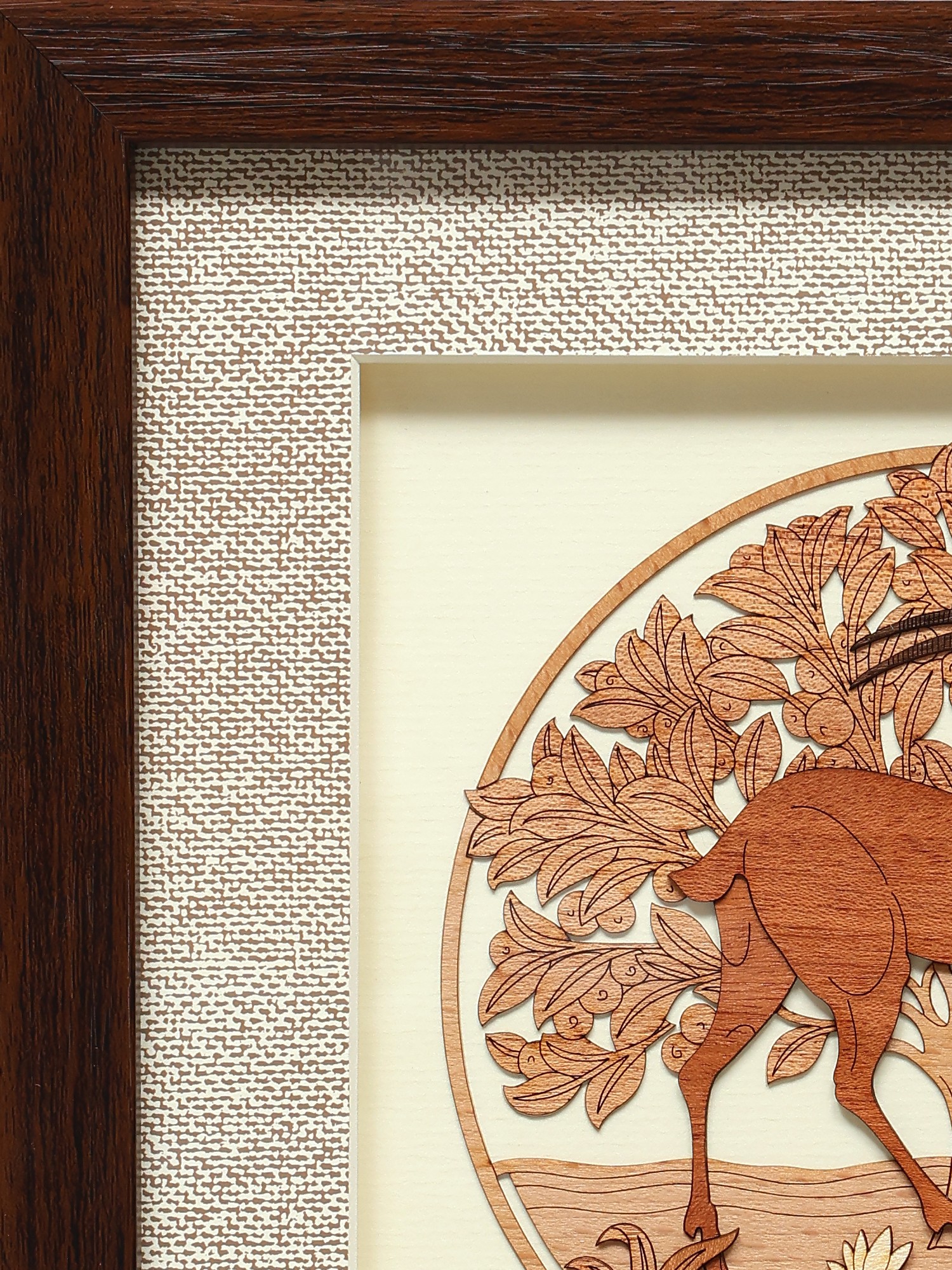 The artistry of this piece lies not only in the captivating design but also in the meticulous craftsmanship that brings it to life. The wooden carving is thoughtfully layered, creating depth and dimension that draws the eye. Each element, from the gentle curve of the deer's neck to the delicate petals of the flowers, is rendered with precision. The contrast between the light and dark tones of the wood adds visual interest and enhances the overall aesthetic appeal. Encased within a frame, the carving is set against a neutral-toned backdrop that enhances the natural warmth of the wood and ensures it complements a variety of interior styles. The frame's subtle texture further enriches the visual experience, adding a touch of understated elegance.