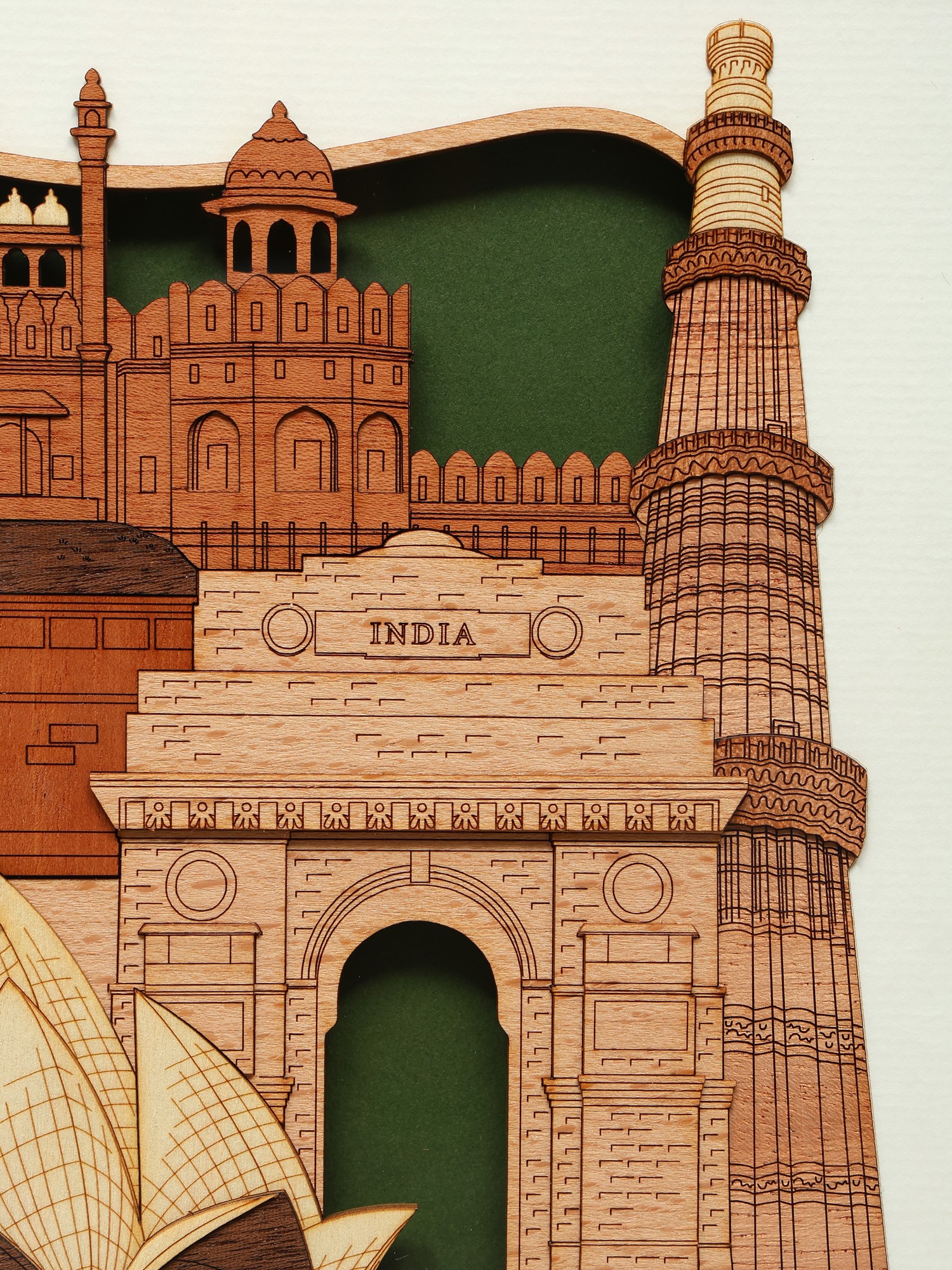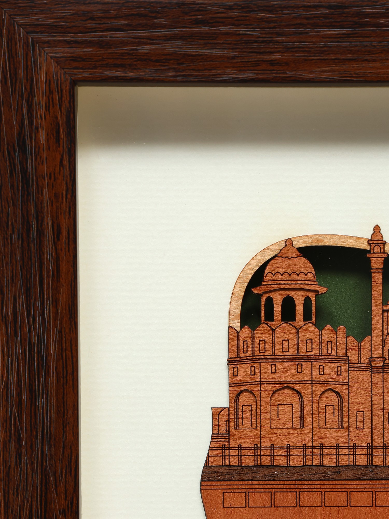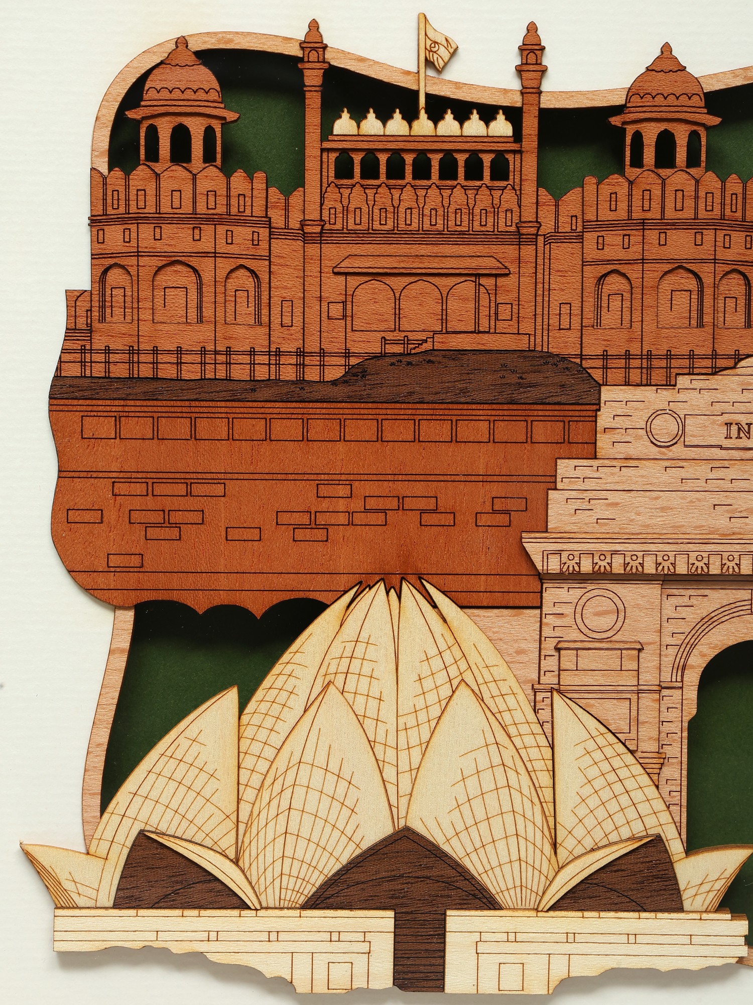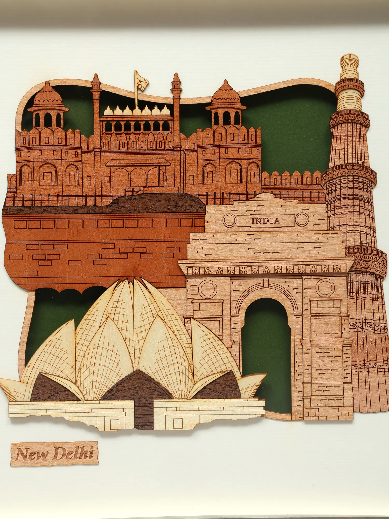 This amazing piece of art captures the spirit of Delhi’s iconic monuments, transporting you into the heart of India's capital. From the towering elegance of “Qutub Minar” to the majestic grandeur of “Lal Qila (Red Fort),” from the serene beauty of the “Lotus Temple” to the patriotic fervour of India Gate, this artwork narrates a tale of centuries past.