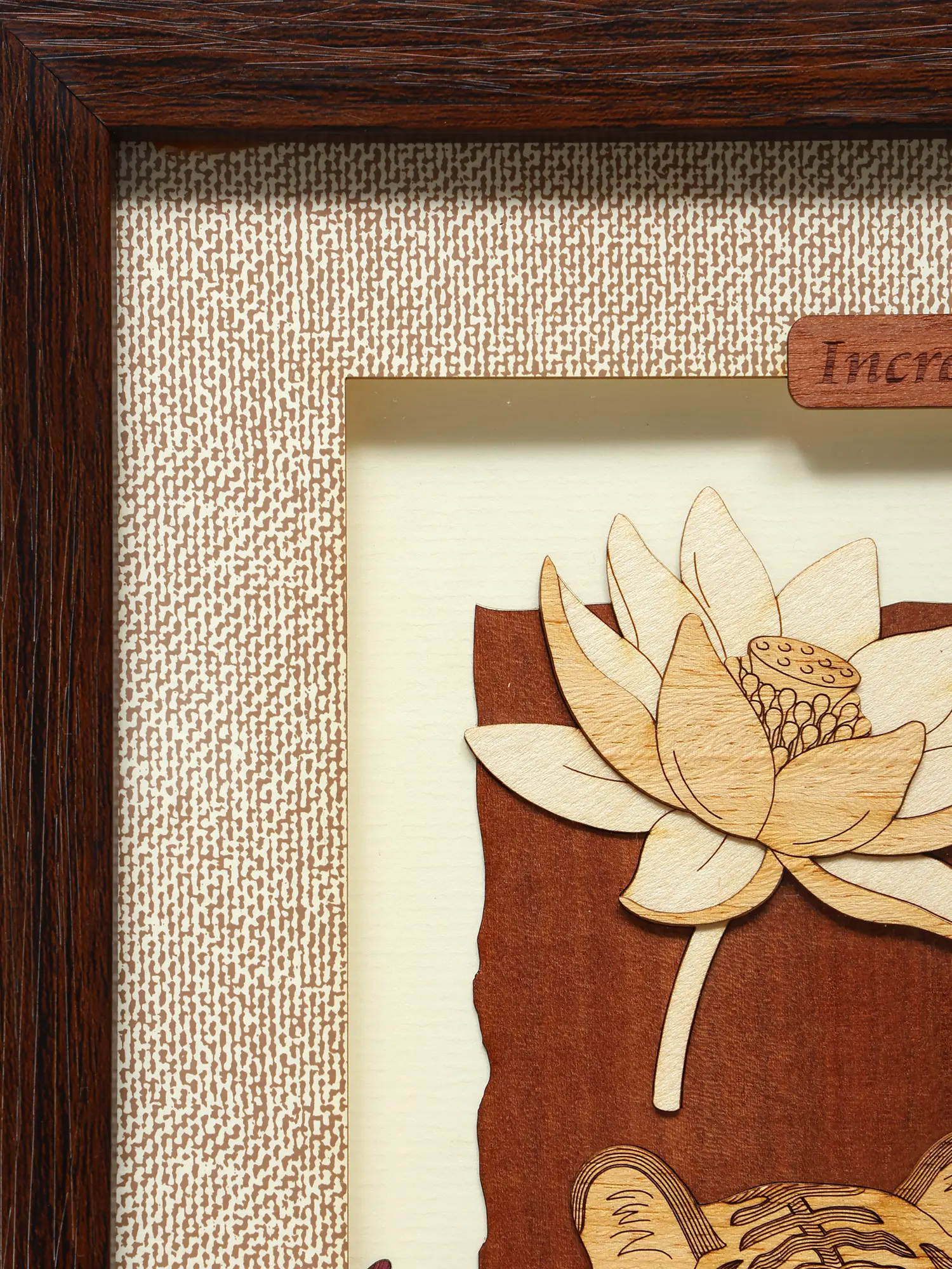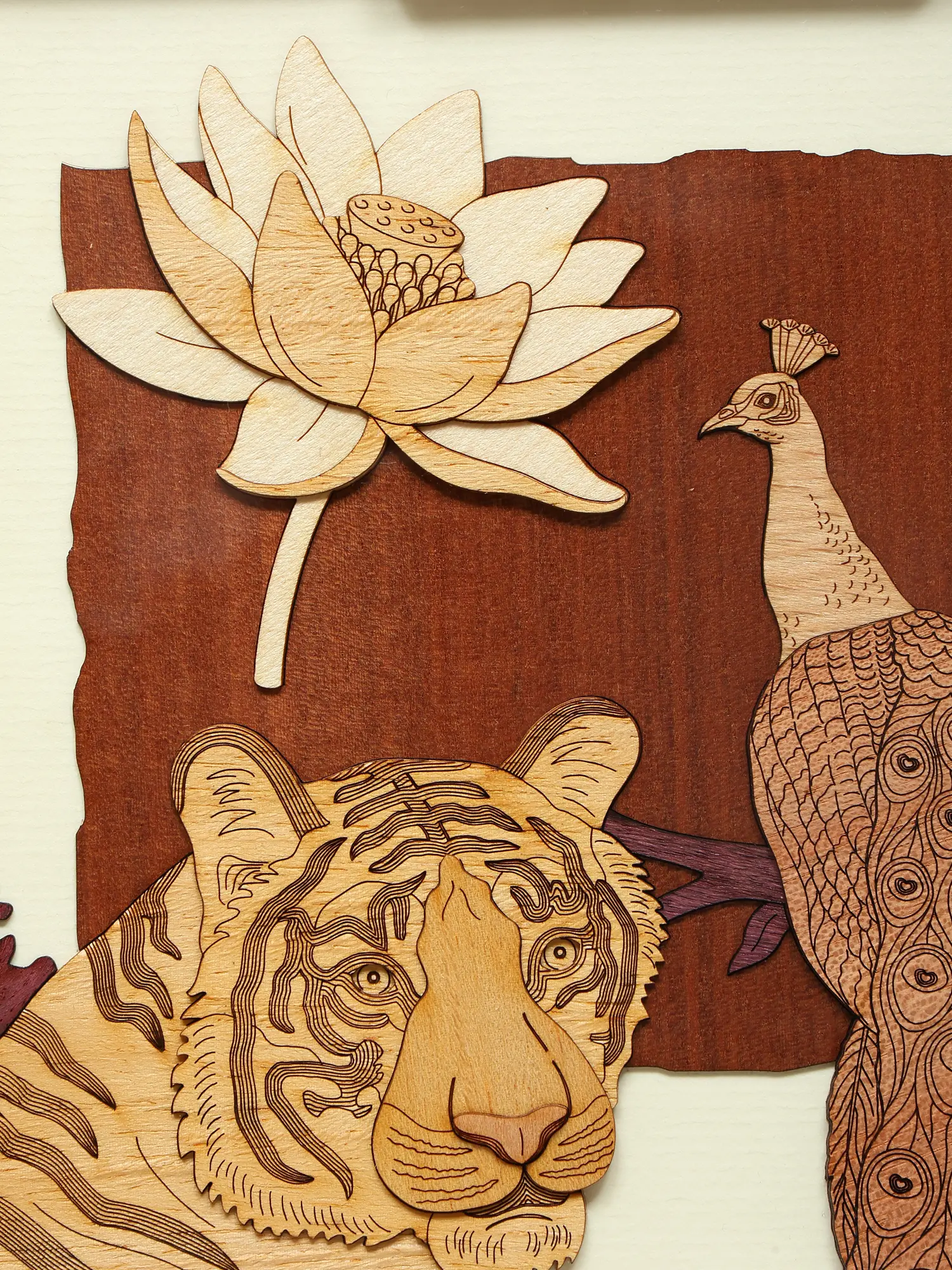 Bring a touch of India's rich heritage and vibrant culture into your home with this meticulously crafted wall hanging. This piece is more than just decor; it's a celebration of iconic symbols that define the essence of India. Each element is painstakingly carved from wood, showcasing incredible detail and artistry. The various shades and textures of the wood create a stunning visual depth, highlighting the beauty of the chosen imagery. The neutral colored mount and dark brown frame allow the artwork to take center stage.