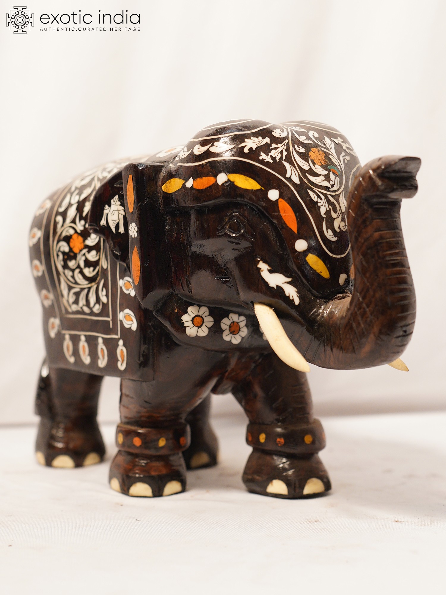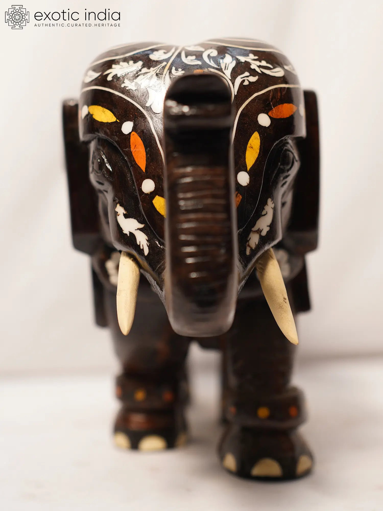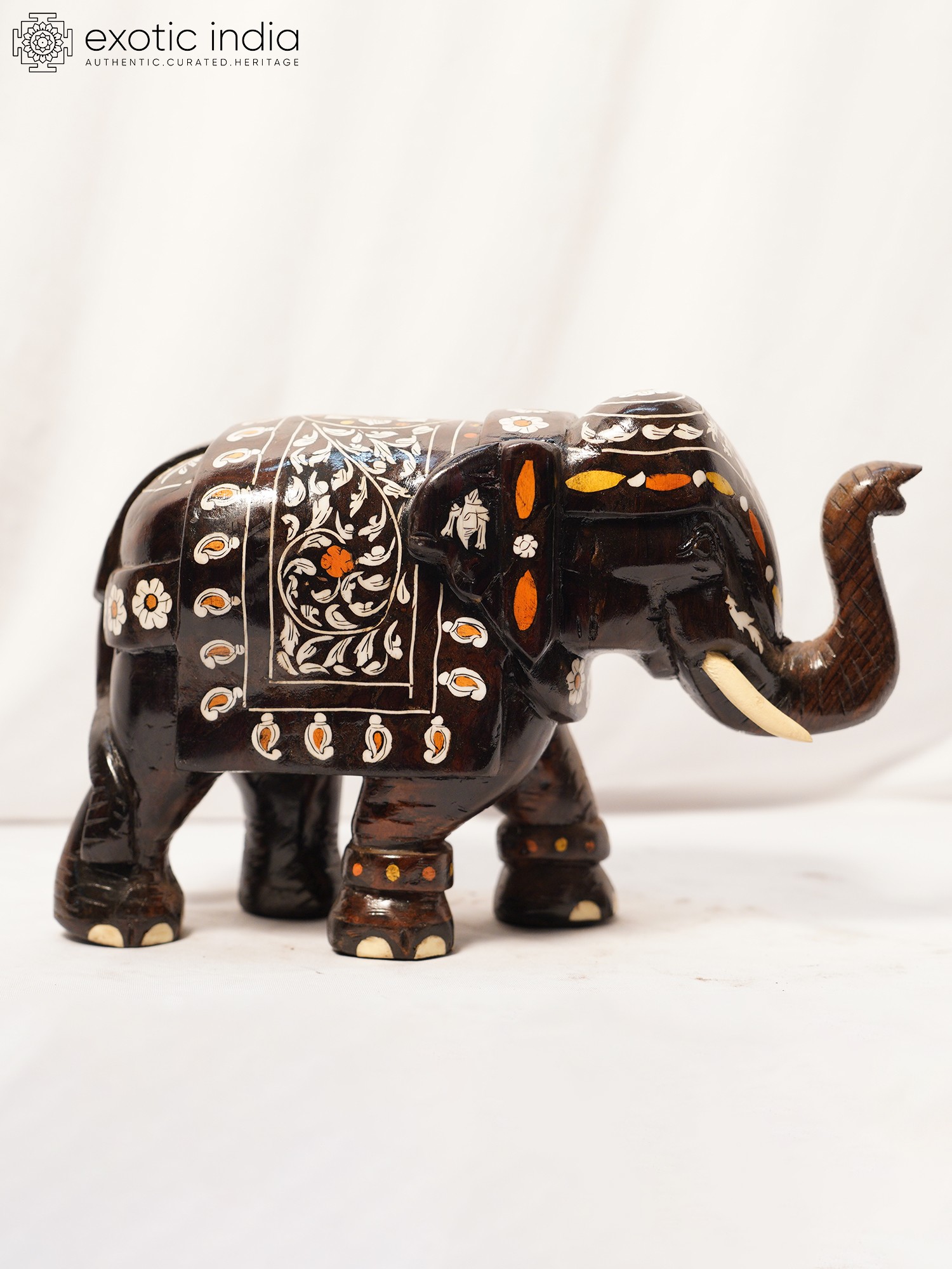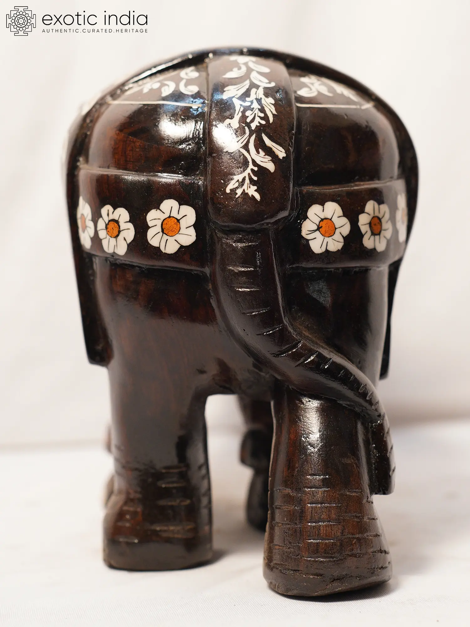 This figurine is handcrafted from rosewood, a prized material known for its durability, rich color, and fine grain. The inlay work further elevates this piece, showcasing the artist's precision and attention to detail. Each carefully placed element contributes to the overall harmony and visual interest of the sculpture. The delicate motifs enhance the texture and add a touch of opulence, making this a truly remarkable work of art. The upward-curving trunk of the elephant is considered a symbol of good luck and prosperity. The intricate details such as the toenails, the tusks, and the design on the elephant's blanket add to its unique appeal. This item is not only a beautiful decoration but also a reflection of cultural heritage and artistic skill. Place it in your living room, study, or office to infuse your space with a touch of sophistication and elegance. It also makes an ideal gift for art enthusiasts, collectors, or anyone who appreciates handcrafted treasures. The careful craftsmanship and the use of quality materials ensure that this sculpture will be a cherished addition to your home for years to come.