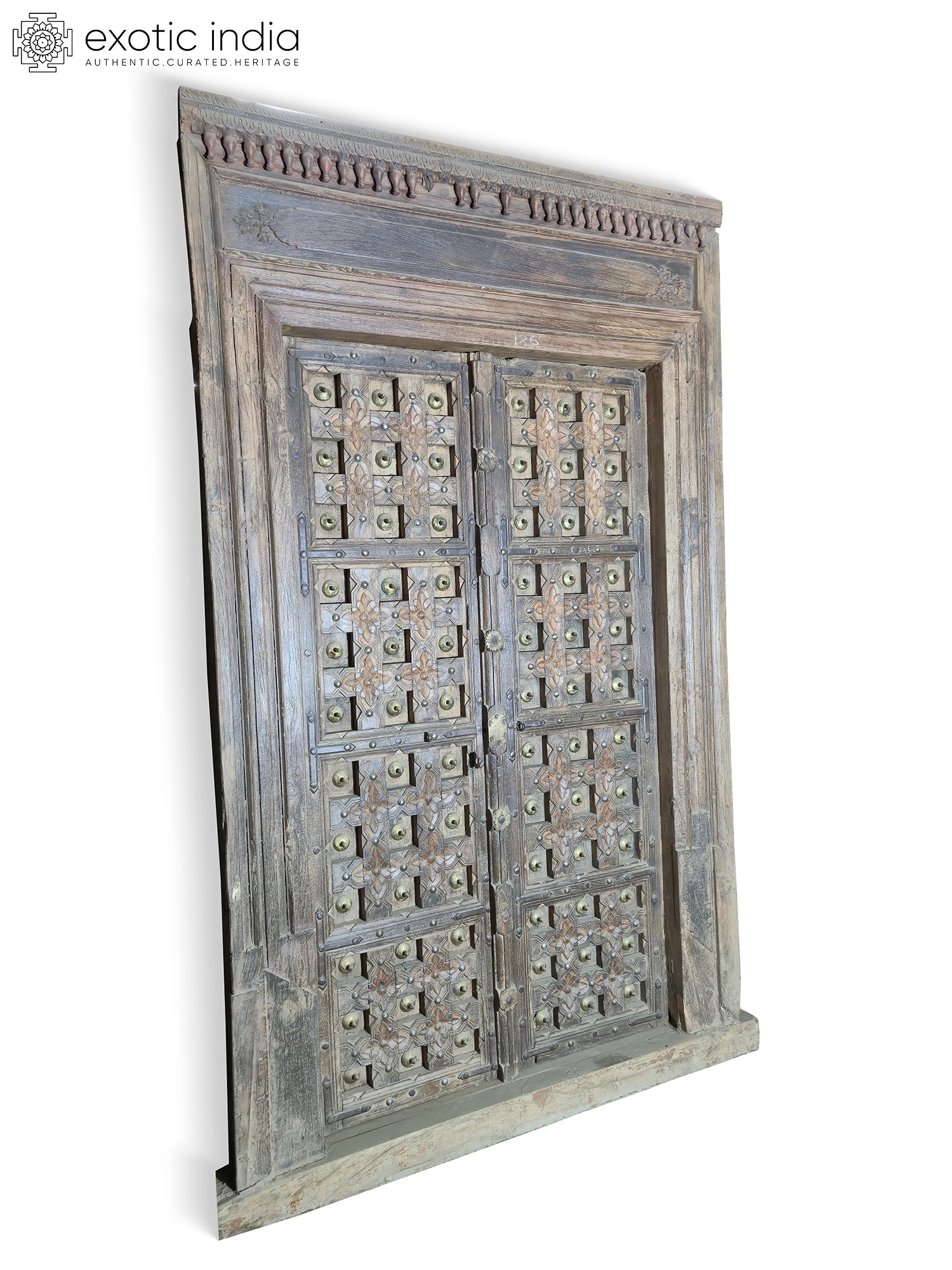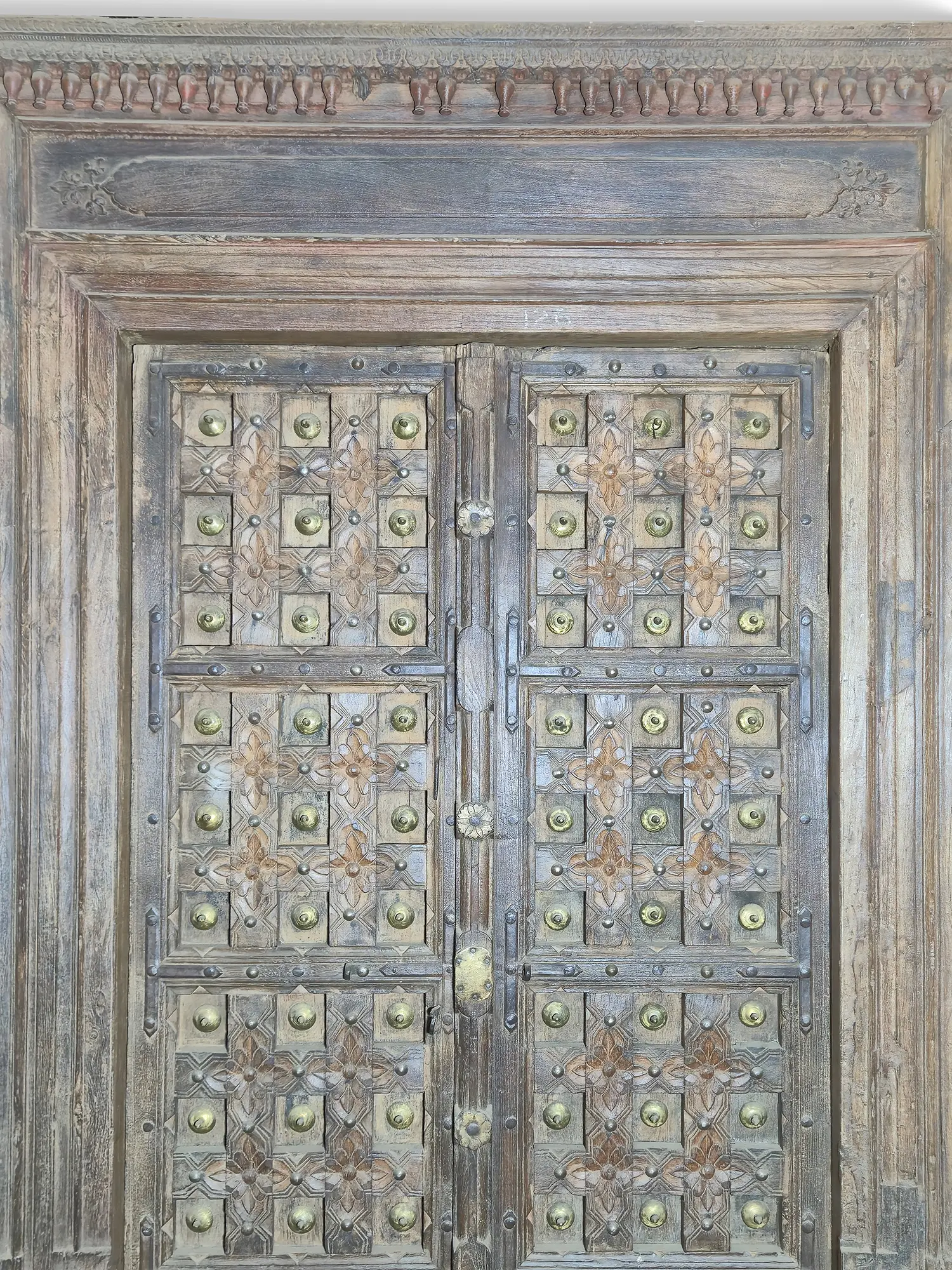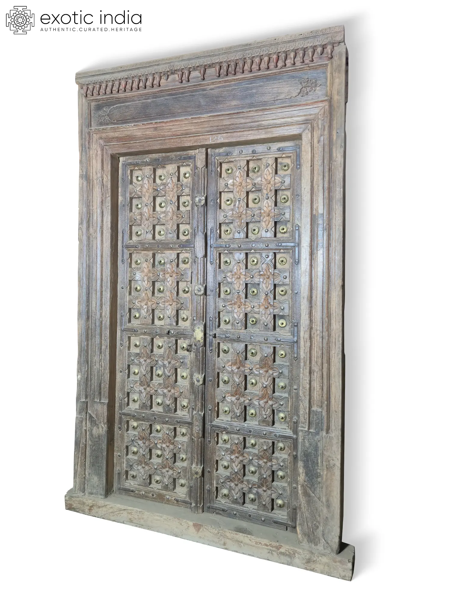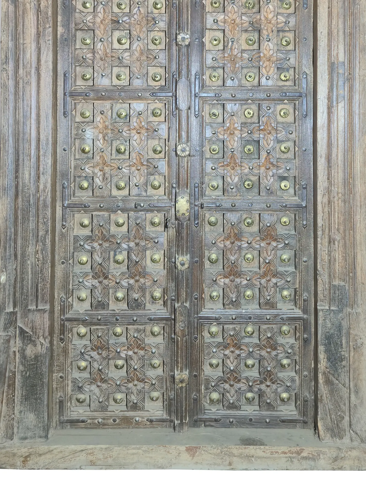 The true artistry of this door lies in its elaborate carvings. The central panels are adorned with a mesmerizing geometric pattern, reminiscent of traditional Indian motifs. Within each square, delicate floral designs bloom, meticulously hand-chiseled into the wood. These intricate floral elements are further enhanced by numerous brass studs, hammered in with precision, adding a subtle gleam and textural contrast. The juxtaposition of the deeply carved wood and the gleaming brass creates a captivating visual rhythm that draws the eye and sparks admiration. The frame itself boasts a refined carved frieze along its top, echoing the detailed work found throughout the door.