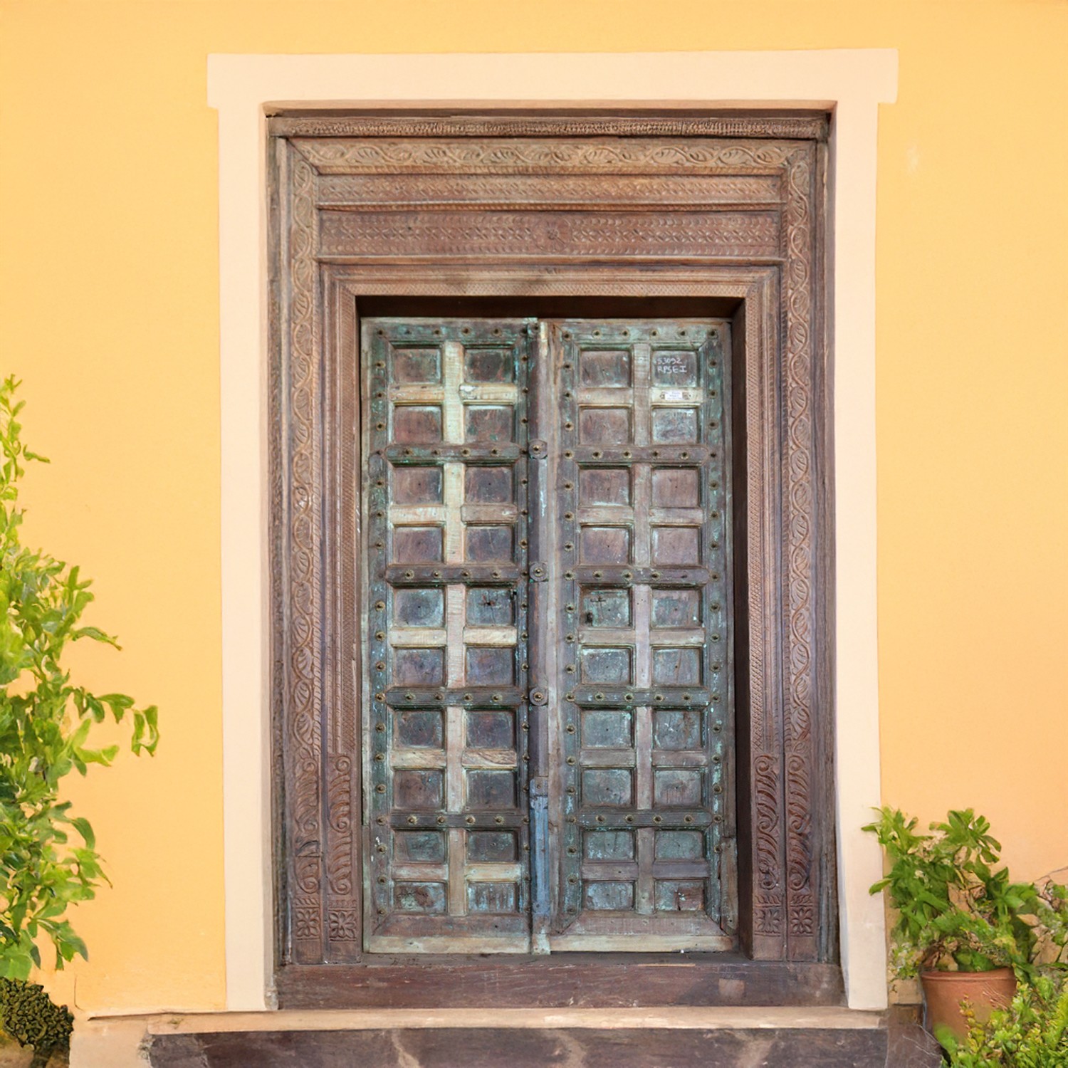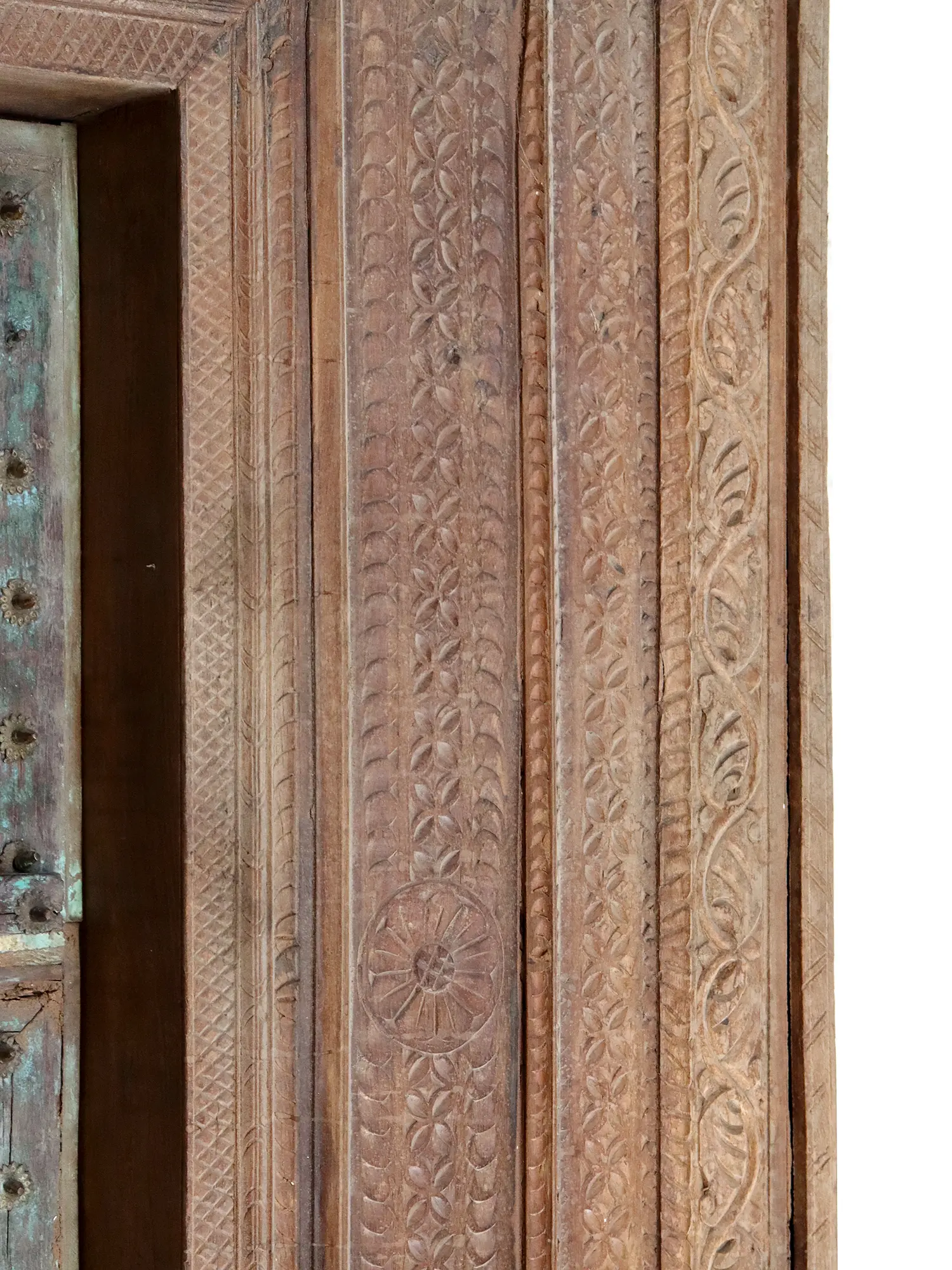 Step into a world of elegance and tradition with this exquisite 100" Large Hand Carved Wooden Door with a Frame. The door showcases mesmerizing geometrical patterns and intricate carvings along its borders, adding a touch of timeless beauty to any space. Crafted with skill and precision, this vintage Indian door brings a traditional element that transforms your house into a captivating sanctuary.