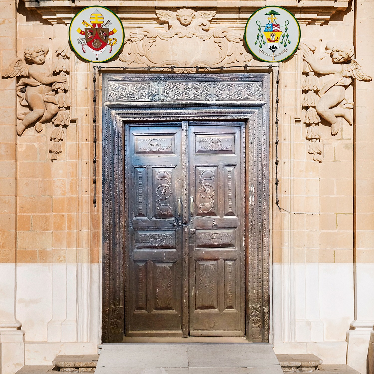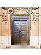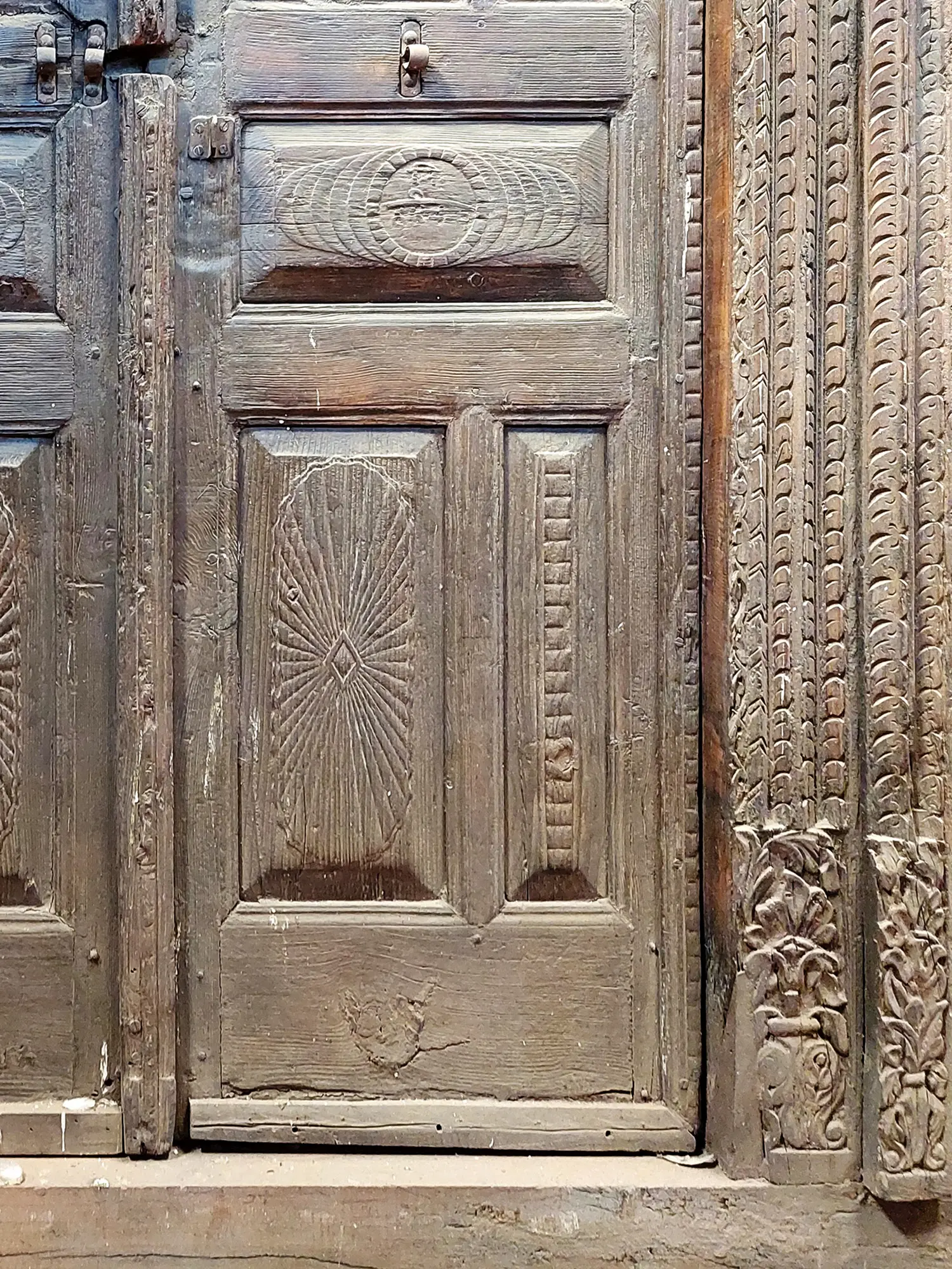 78" Floral Hand Carved And Block Design Wood Door With Vintage Style Knock