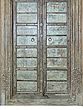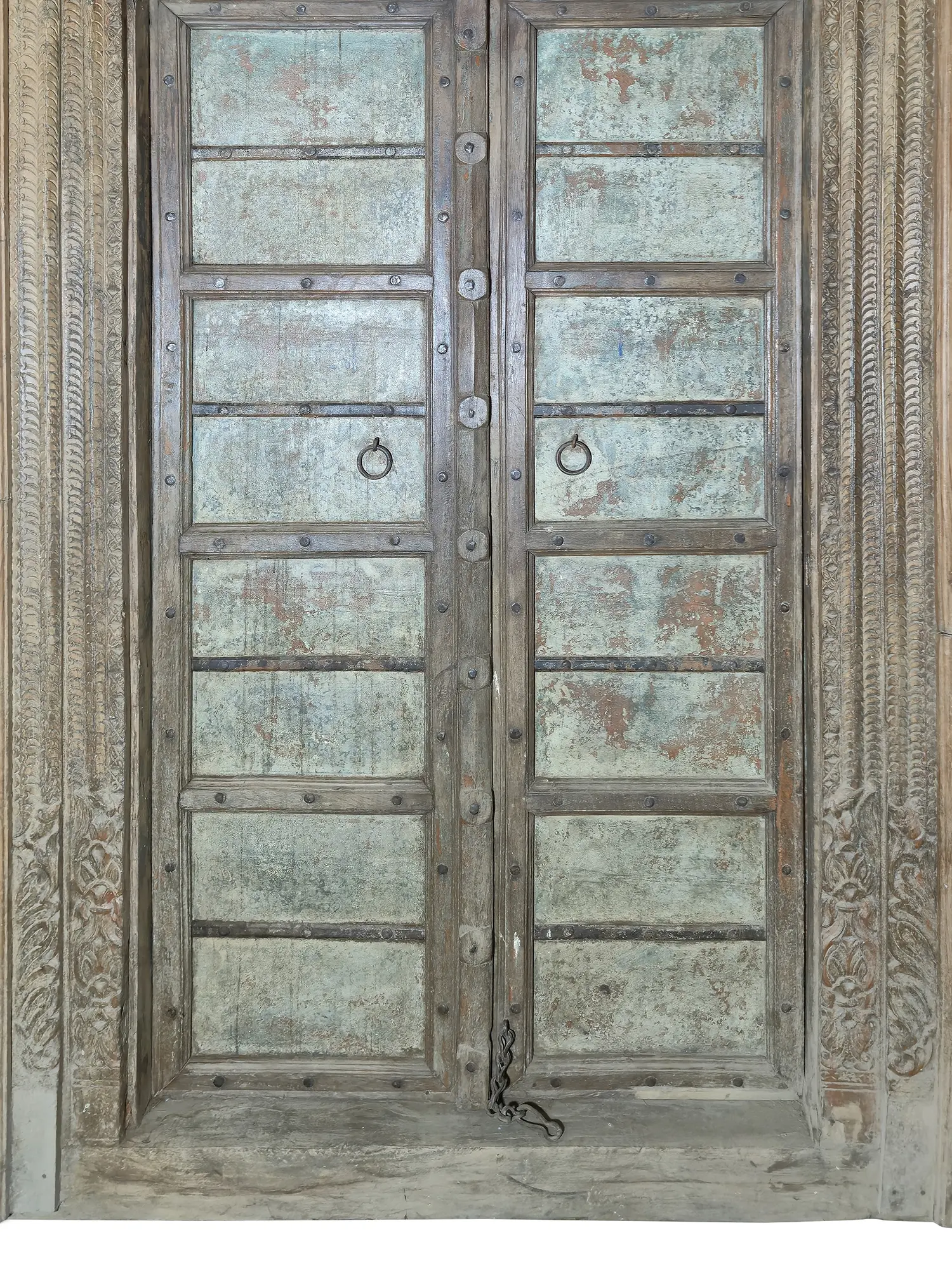 The double doors themselves are equally captivating. Constructed from solid wood, they are divided into multiple panels, each revealing a unique texture and hue. The surfaces bear the marks of time, with a beautiful, distressed finish that hints at a past life. Patches of faded turquoise and hints of rust-colored undertones peek through the aged wood, creating a visual tapestry that is both intriguing and inviting. This is not a flaw, but rather an integral part of its vintage appeal, a story of its history etched into its very being. Functional ring pulls, weathered by countless hands, add a final touch of authenticity and provide a tactile connection to the past.