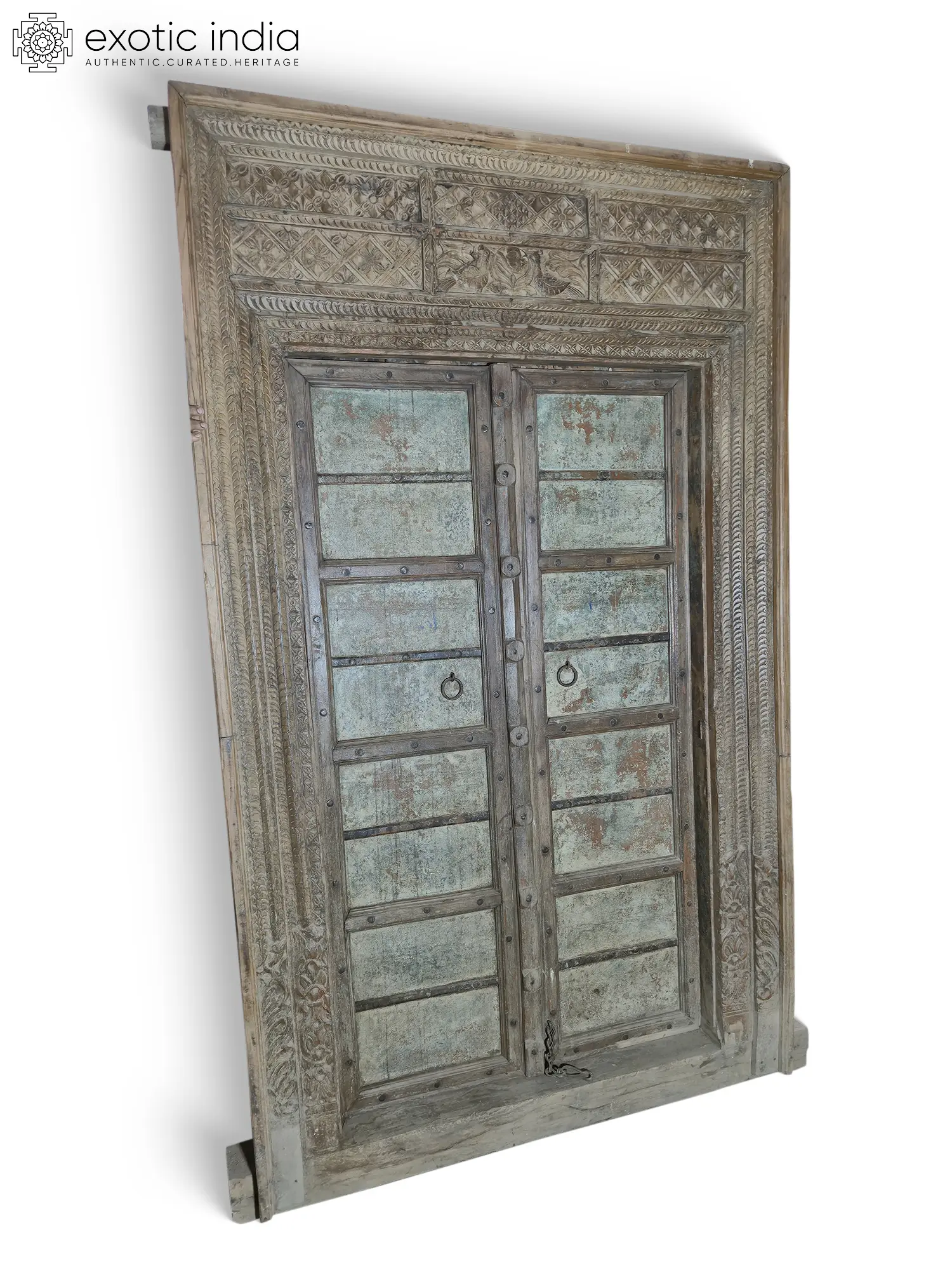 The main structure of the door is a masterpiece of traditional Indian woodworking. The frame itself is a work of art, featuring layered carvings that create a sense of depth and sophistication. Look closely, and you'll discover intricate borders and decorative panels that frame the central double doors. The subtle variations in the wood grain and the weathered patina speak volumes about its age and journey, adding to its authenticity and allure. This is not mass-produced; this is a singular creation, imbued with the soul of its maker.
