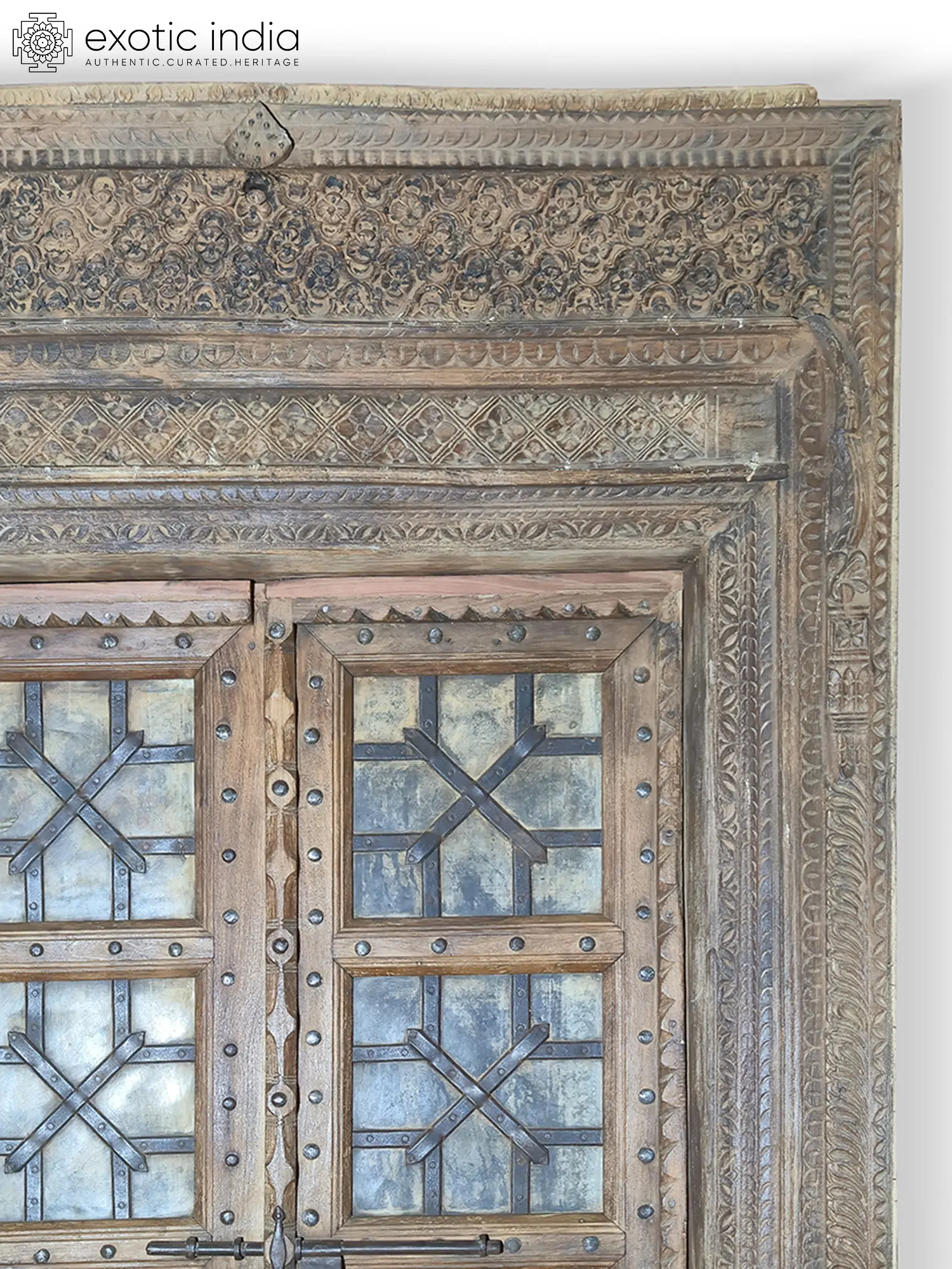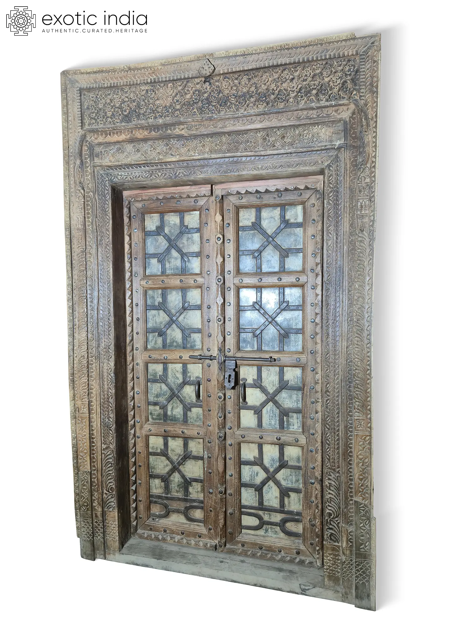 85" Large Rajasthani Traditional Wood Door With Carving Frame And Iron Strip Panel