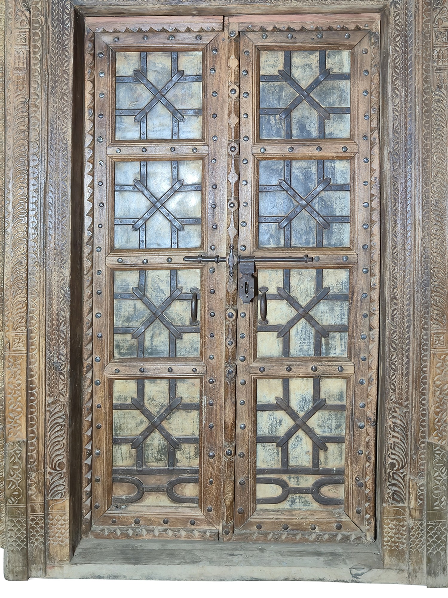 The main panels of the door are crafted from robust wood, offering a warm and inviting aesthetic. Within these wooden panels, you'll discover the striking addition of iron strips, artfully arranged to create a captivating geometric lattice. This combination of natural wood and industrial iron creates a unique visual contrast, blending rustic warmth with a touch of rugged elegance. The ironwork is not just functional, providing structural support, but also serves as a decorative element, adding a layer of intricate design that complements the wood carvings. The doors are equipped with a functional latch and handles, further enhancing their historical character and usability.