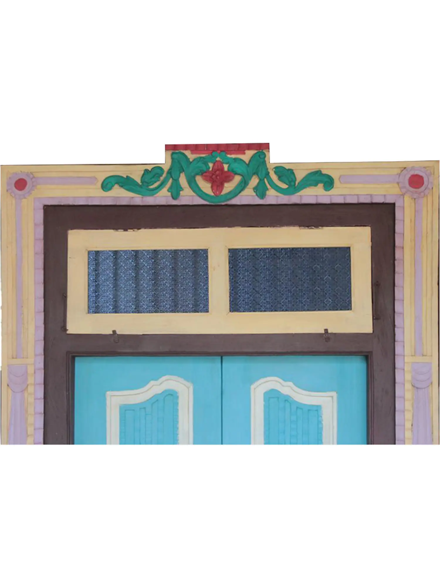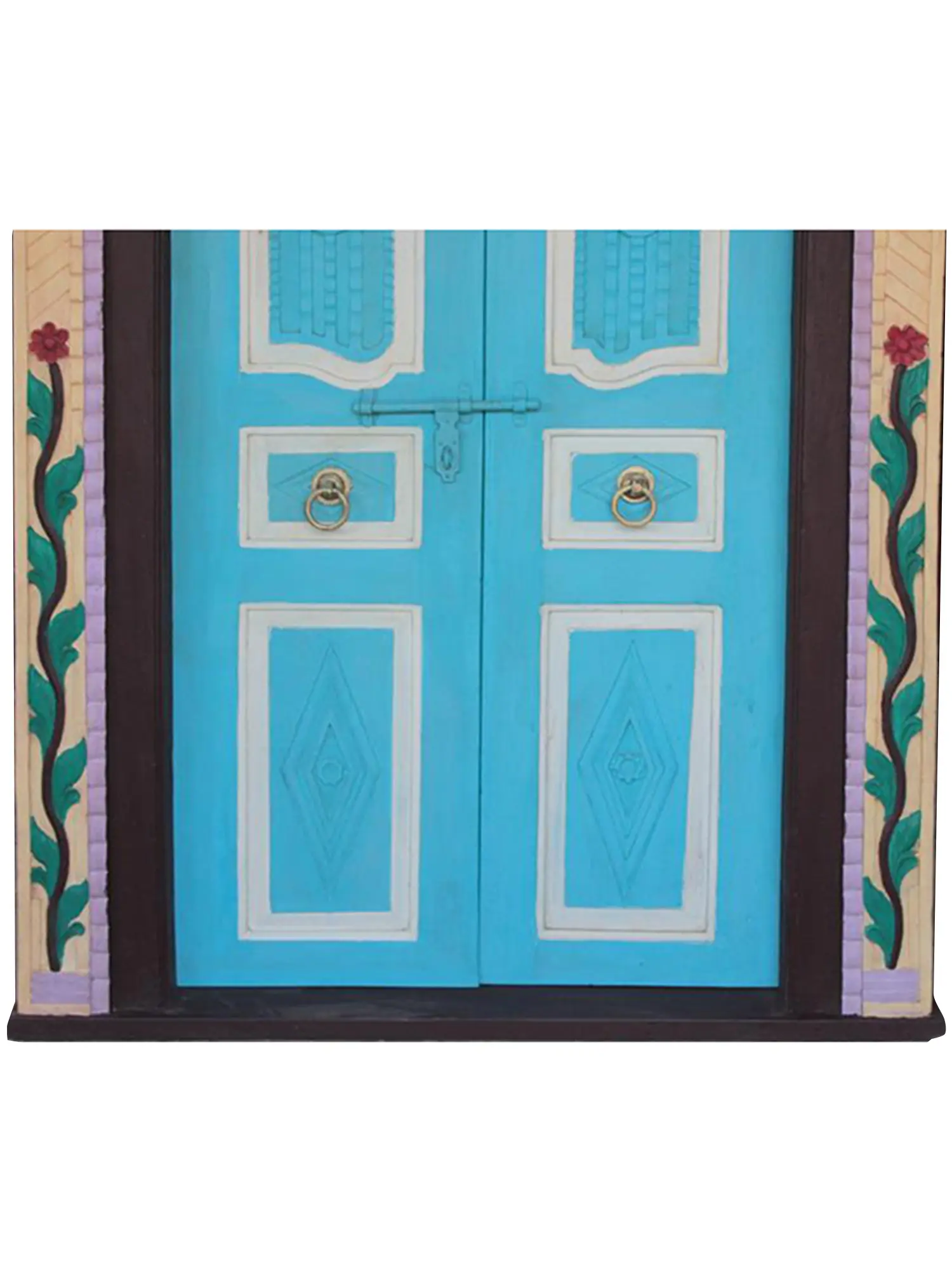 Every inch of this door speaks to the skill and dedication of the artisans who brought it to life. The use of wood creates a substantial and enduring presence, while the carefully applied colors capture the essence of traditional Indian aesthetics. Notice the playful embellishments – the floral motifs, the decorative carvings that add depth and texture, the delightful antique-style hardware. These elements blend seamlessly to create a piece that is both visually stunning and historically significant. The frame itself is an integral part of the design, enhancing the door's overall impact and providing a cohesive, finished look. Embrace the imperfections and variations that are inherent in handcrafted items; they are not flaws, but rather marks of authenticity that add to its unique charm.