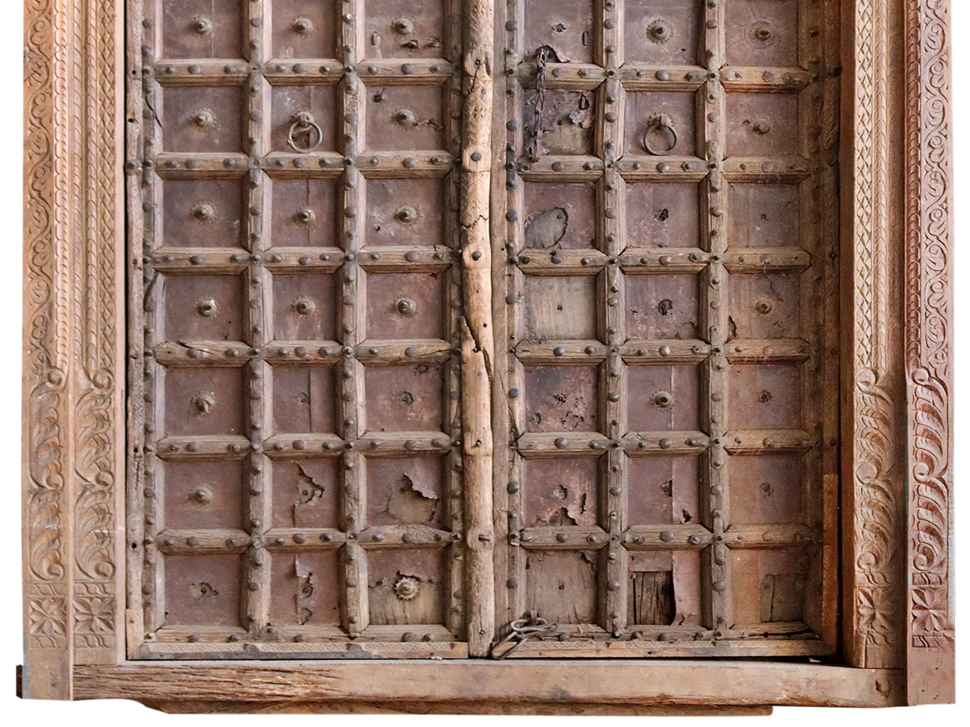 The 109" Large Wooden Carved Rajasthani Gate with Frame is a captivating vintage Indian door that has the power to aesthetically transform any house and add a major traditional element. Crafted with intricate detailing and exquisite carvings, this door carries the essence of traditional Rajasthani art and architecture. It brings a touch of folk heritage and cultural richness to any space it adorns. The grandeur of the gate instantly elevates the overall ambiance, adding a regal charm and a sense of history. This magnificent door serves as a focal point, captivating attention and creating a mesmerizing entrance. Its presence evokes a feeling of nostalgia while infusing warmth and authenticity into the surroundings.