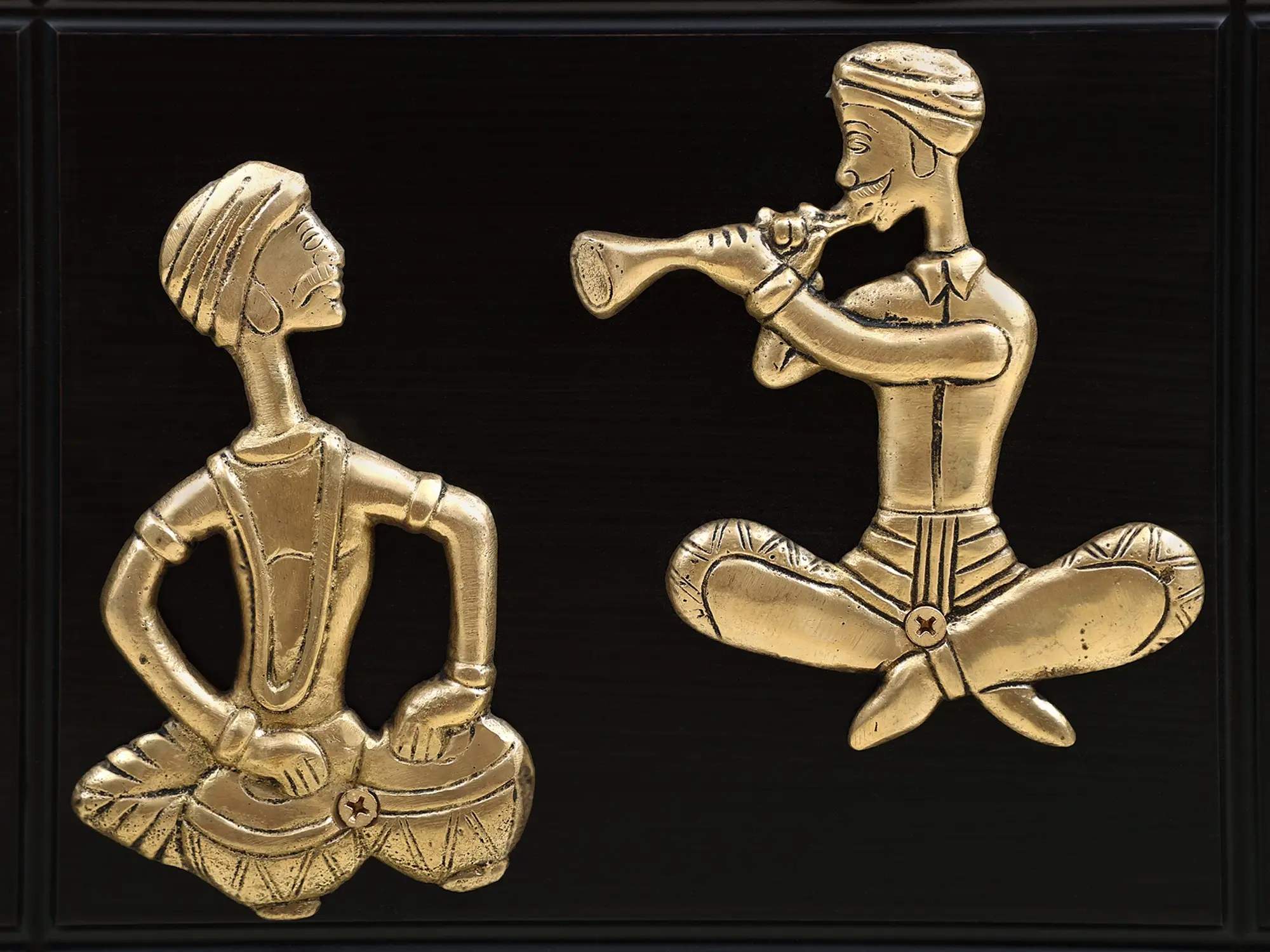 Music is not just a kind of entertainment in India, but it is also an element of the spiritual connecting process. This lovely brass wall hanging with portraits of musicians is an homage to the rich tradition and melody of this music. With numerous musical traditions, this country has been and continues to be a music lover's heaven. The matt black finish frame allows the golden figures to shine and become the main point of the artwork. This wall hanging is designed to brighten up any dull wall and is also a great gift for music lovers.