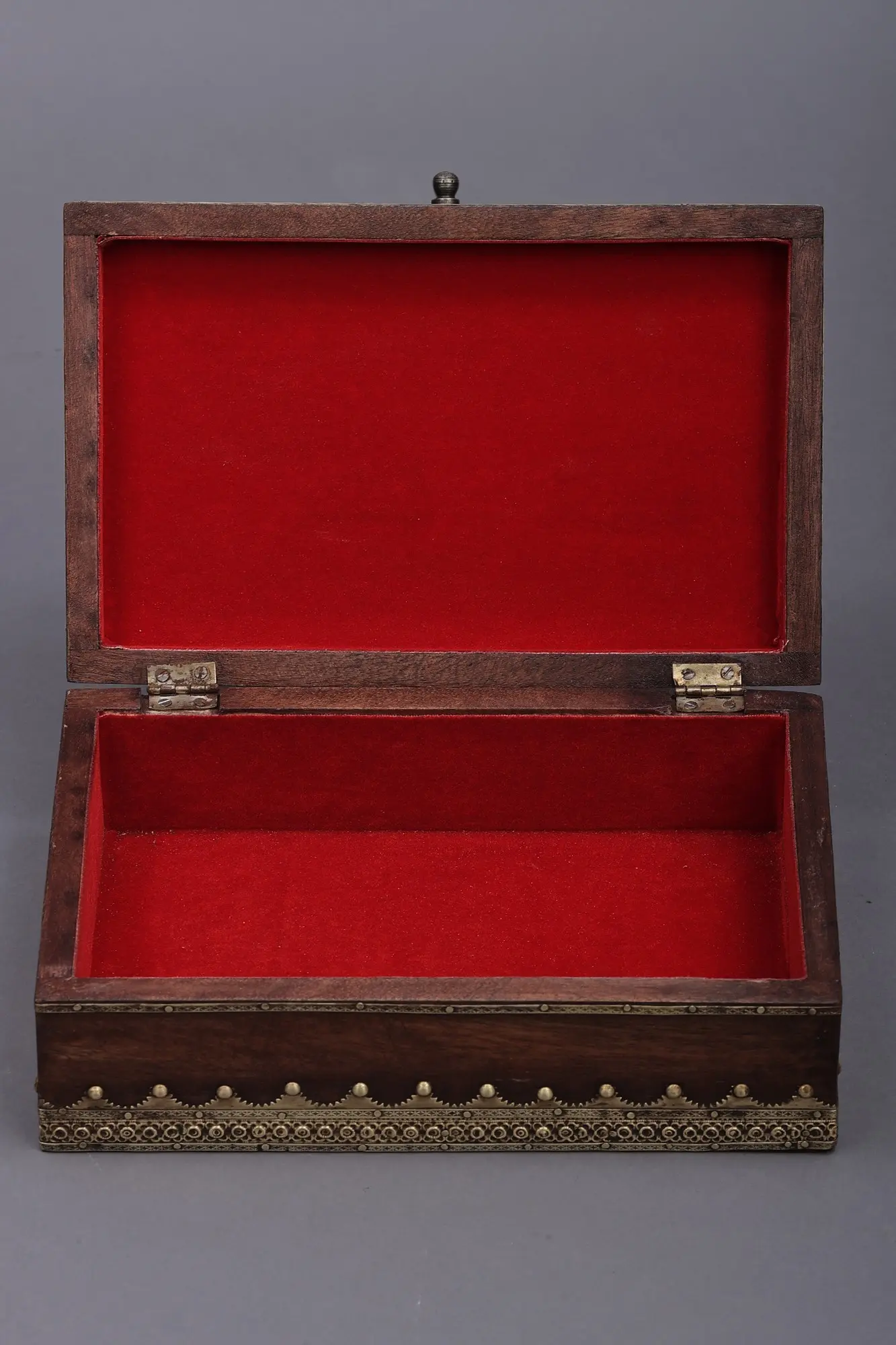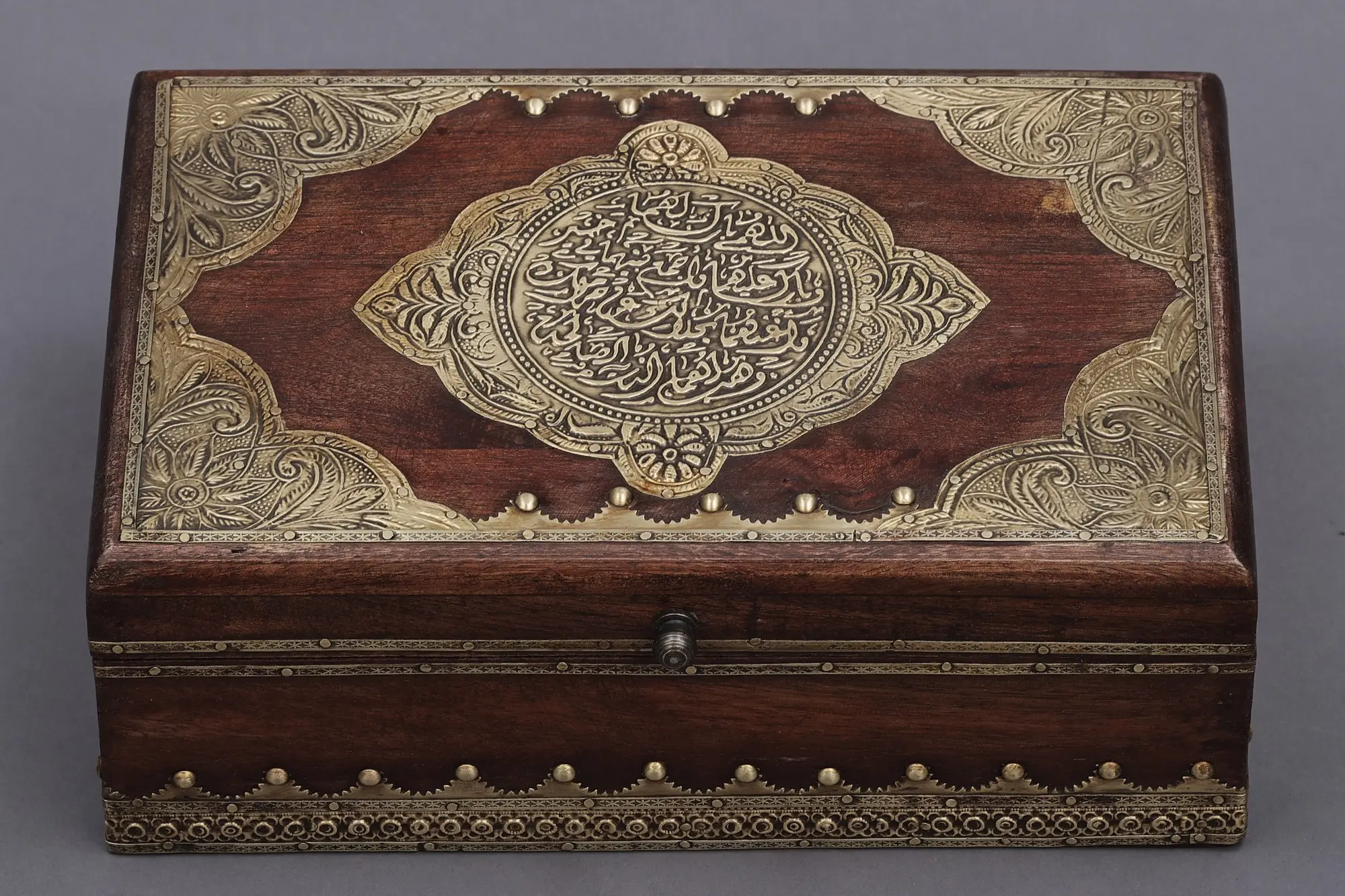 Brass embossing is a technique that adds a regal charm to any item. This Decorated box featuring Islamic Calligraphy is a fusion of Wood and Brass that captures the essence of opulence, enriched with brass embossing. Enveloped in a rich dark brown wooden finish, these boxes stand as timeless treasures. The allure lies in the intricate brass embossing meticulously adorning the center and corners. The marriage of wood and brass creates a harmonious symphony where the elegance of Islamic calligraphy meets the resilience of craftsmanship. Unveil these boxes to step into a world where beauty and tradition find a seamless embrace.
