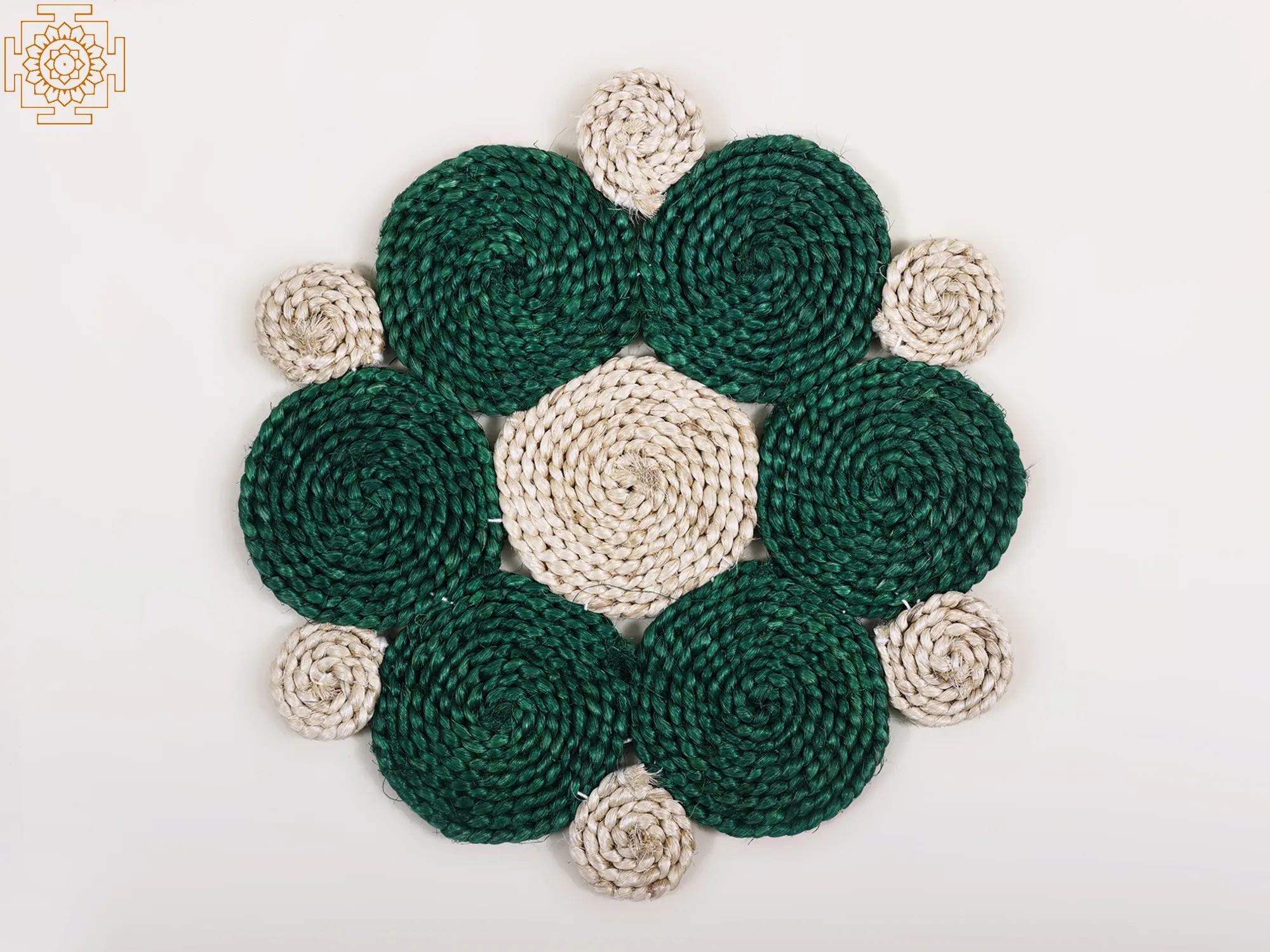 The fibre table mat, adorned with intricate patterns, weaves a tale of elegance beneath the touch of craftsmanship.