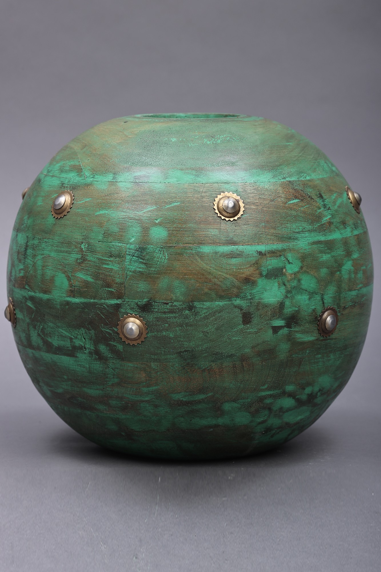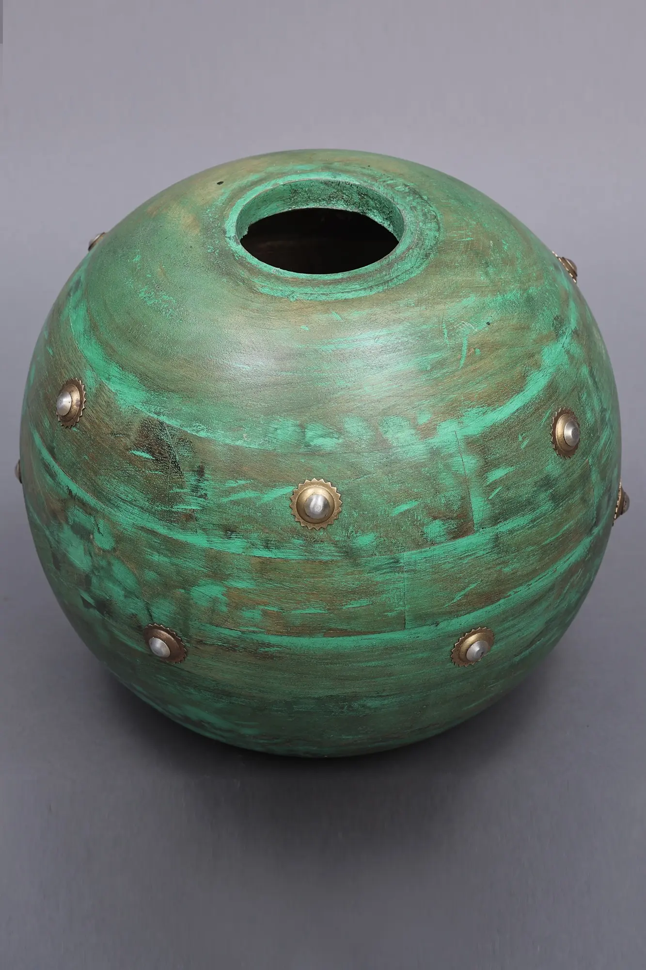 It is a sphere-shaped flower pot crossbred with green and brown colour which brings out a chic eggshell colour. The unfinished brushstrokes of the flower pot produce a rare find décor. It is a great piece that would enhance the aesthetic of your living room. It is carved with high-quality mango trees which would expose your décor style. It is festooned with bronze so the shelf quality of this rusted and earliest would stand out for a longer time.