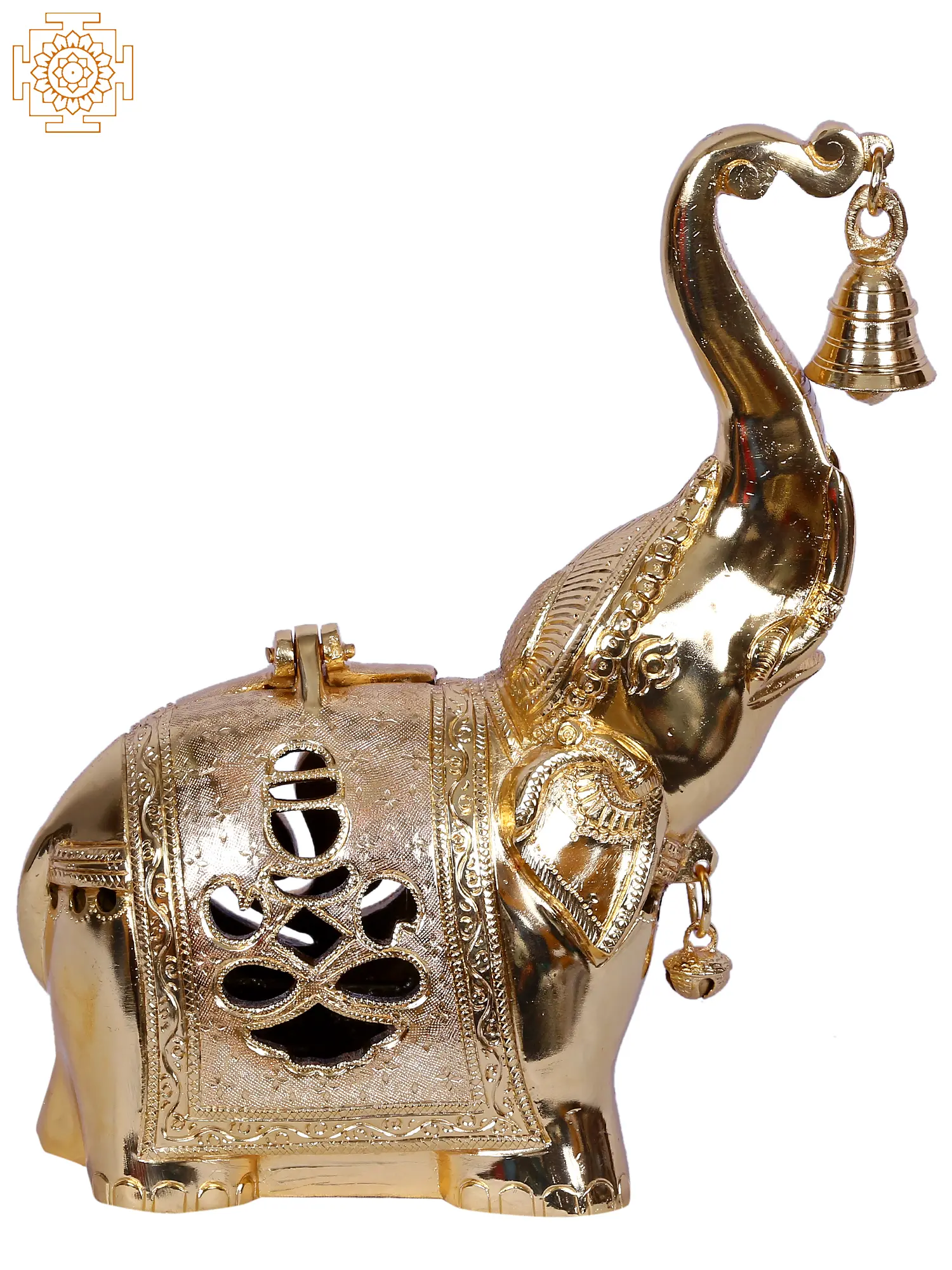 11'' Ganesha Engraved Elephant Statue Carrying Bell | Gold-Plated Brass Idol