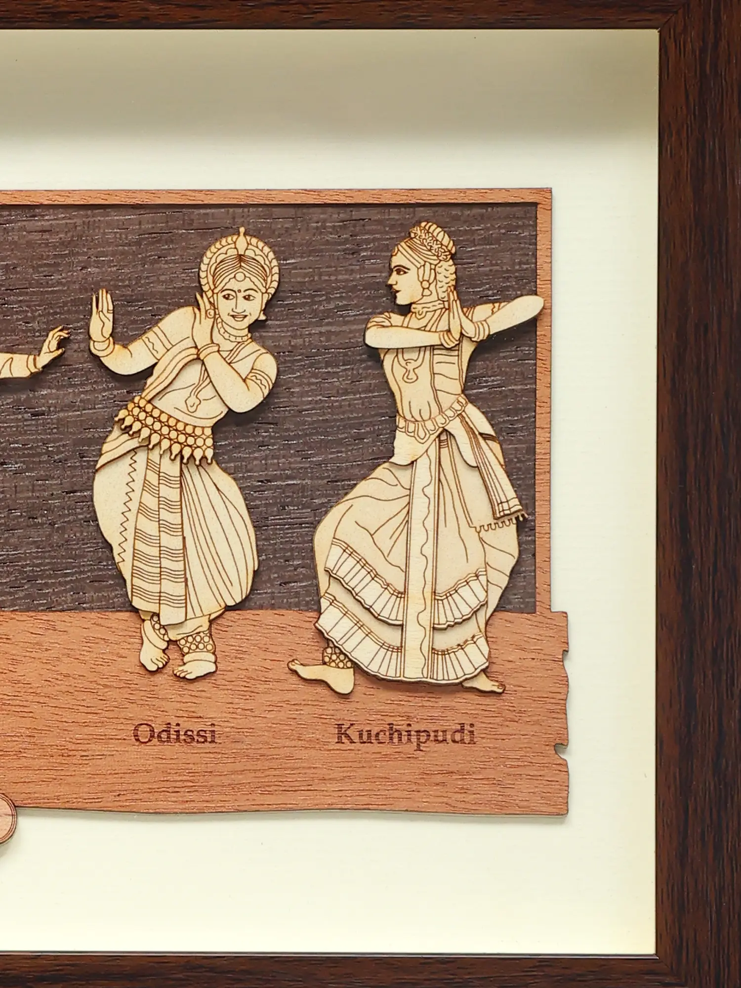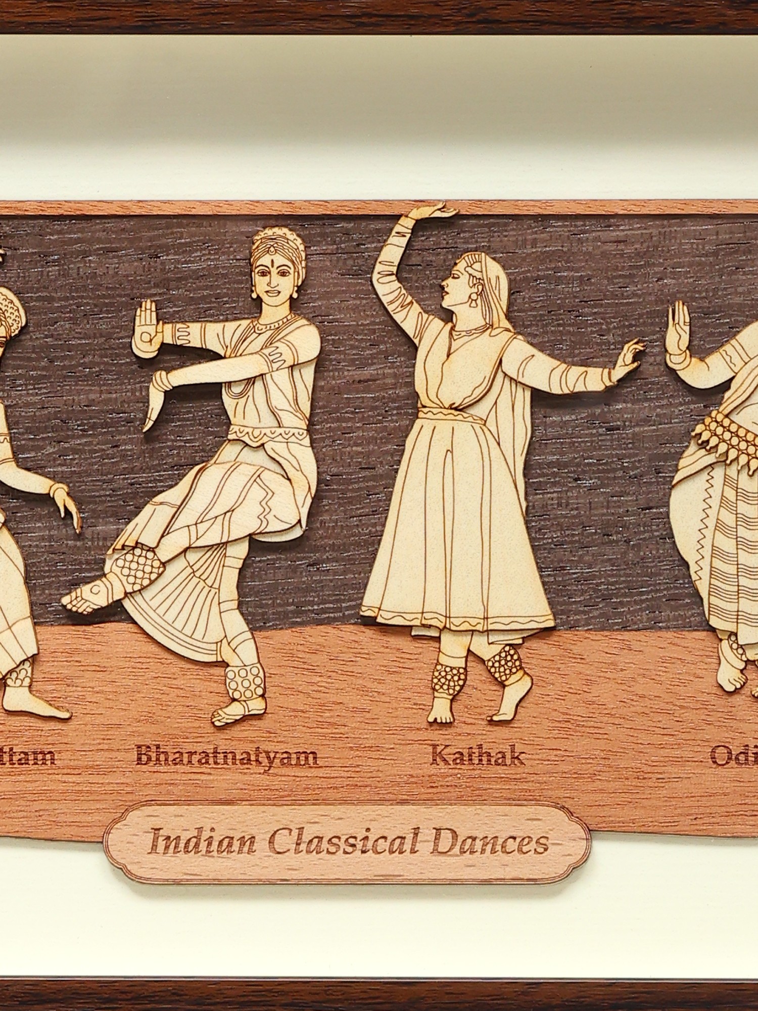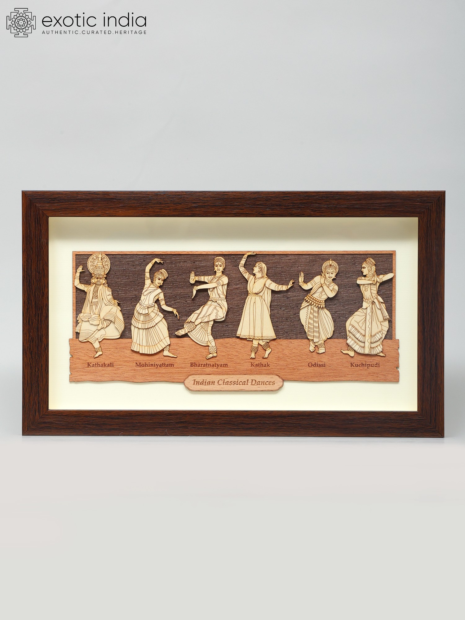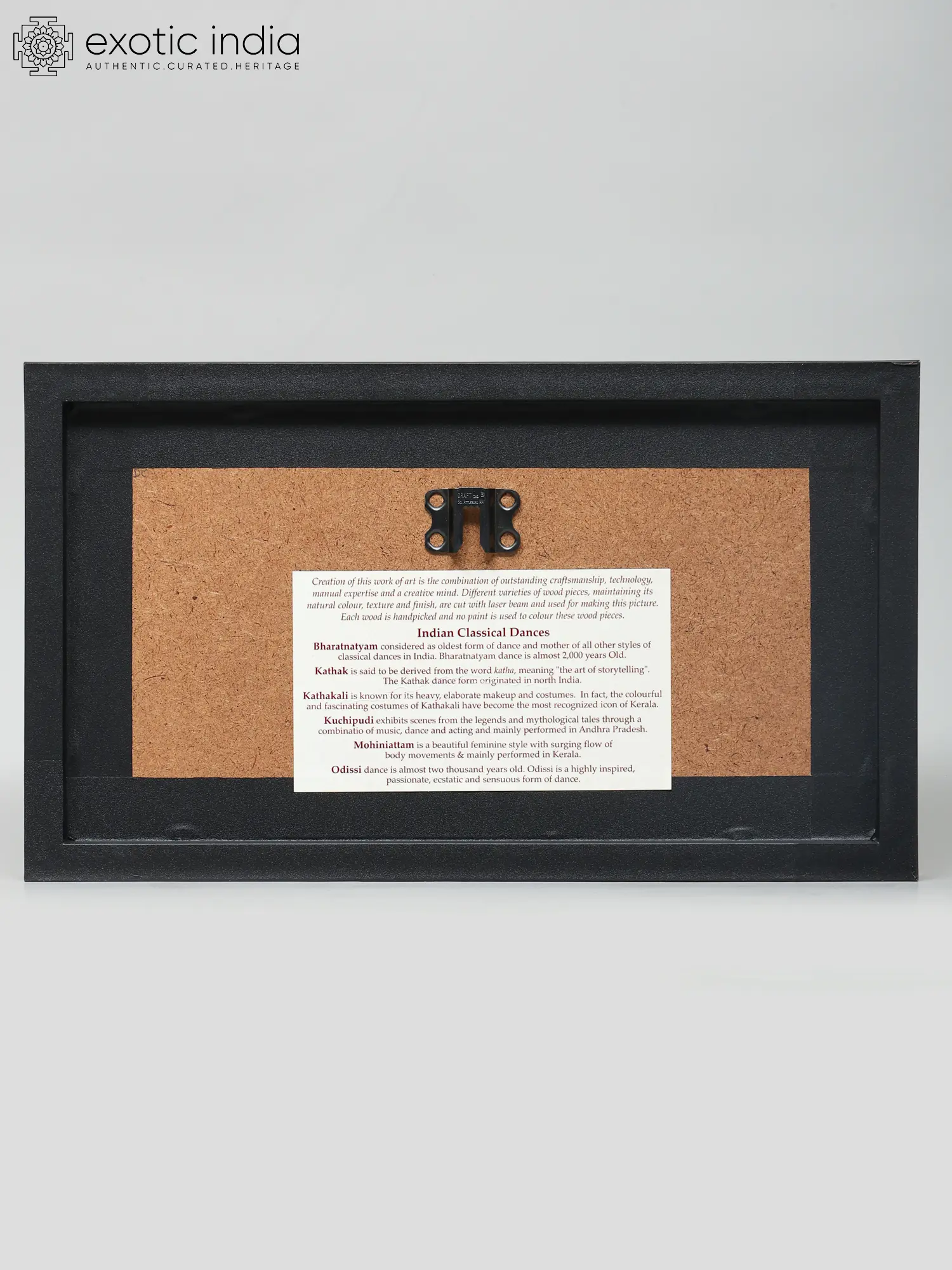 The beauty of this piece lies not only in its subject matter but also in the skill of its creation. The wood carving technique lends a sense of depth and texture, bringing each dancer to life with remarkable detail. The warm tones of the wood create a sense of timelessness and authenticity, perfectly complementing the rich cultural heritage it represents. The frame adds a touch of sophistication, making it a seamless addition to any decor style. This wall hanging is designed to be a cherished addition to your home for years to come. Its intricate details will captivate the eye and spark curiosity, making it a conversation starter for visitors and a source of daily inspiration for you. It is a unique way to celebrate Indian culture and add a touch of elegance to your living space. Whether you are a seasoned art collector or simply appreciate the beauty of handcrafted objects, this piece is sure to impress.