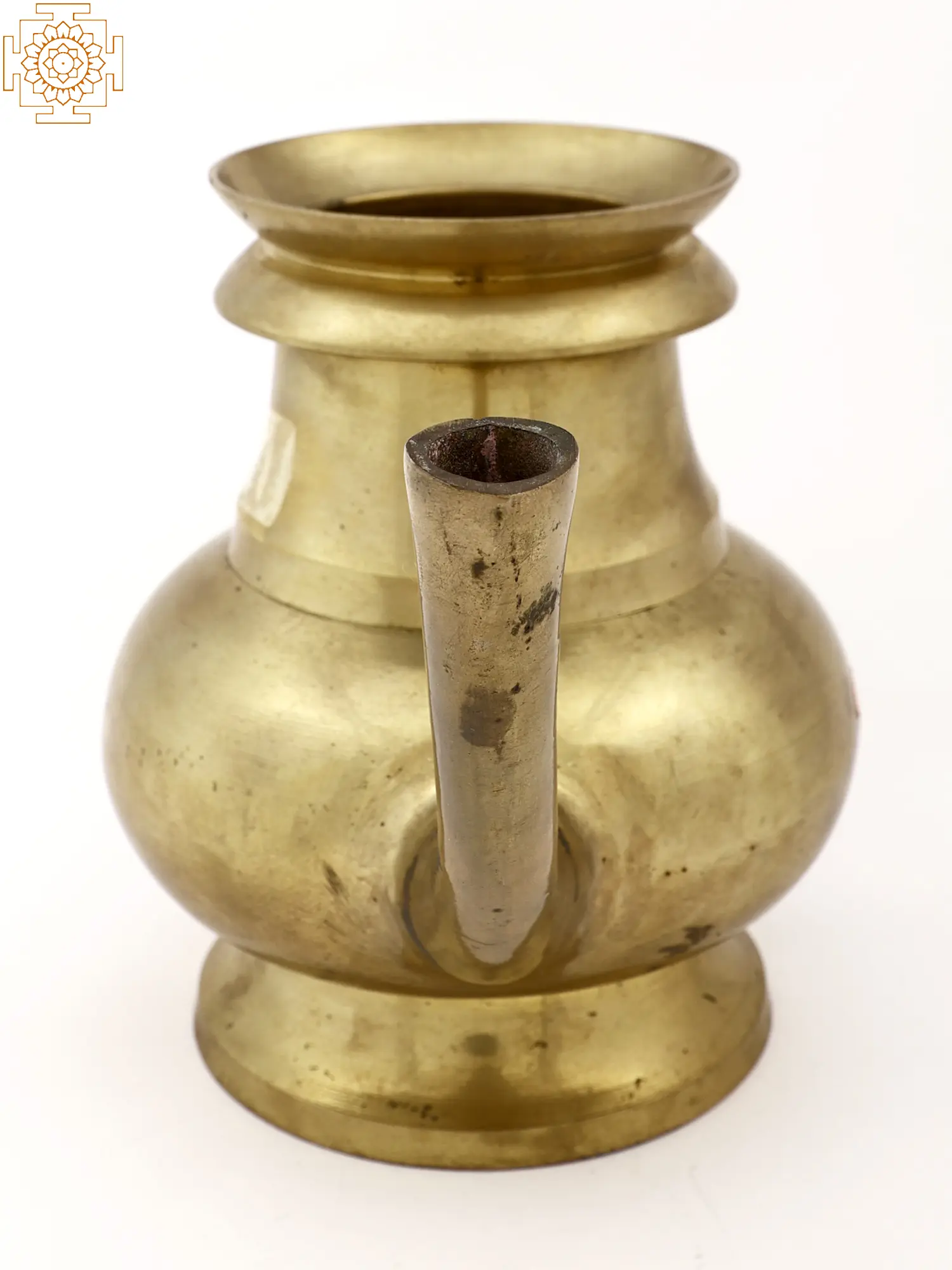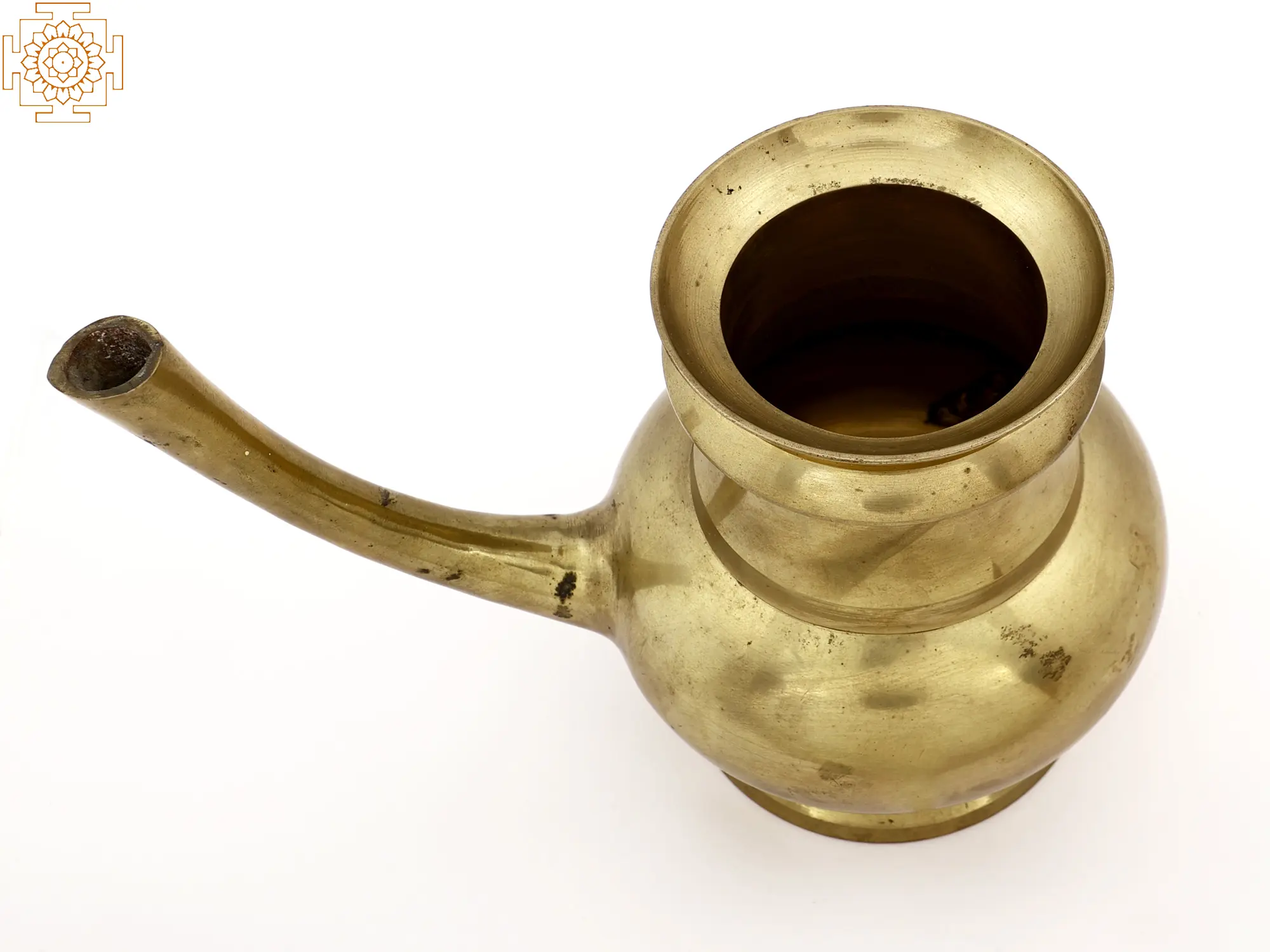 This brass Kindi is a traditional jar used for storing and pouring water. These brass Kindis are used in both household and ceremonial contexts. The Kindi's belly is spherical and develops into a gently grooved, tall, and shapely neck. The most distinctive feature of this jar is the inverted pouring spout attached to the belly. The spout is long and tapered. There is a channeled rim around the neck for decorative purposes. The stand is a flared foot ring that balances the pot's rather round shape. This Kindi is an essential ritual artifact that Sadhus commonly carry on their journeys.