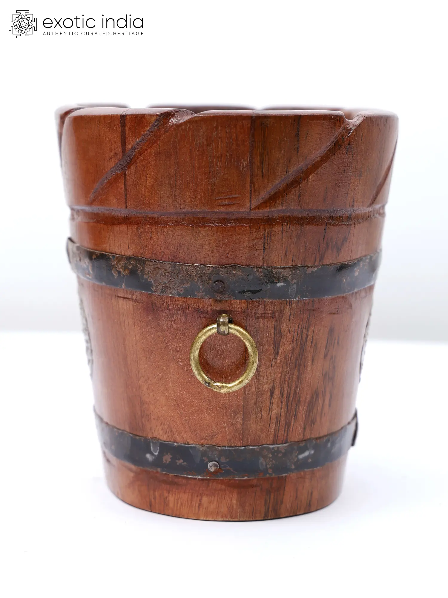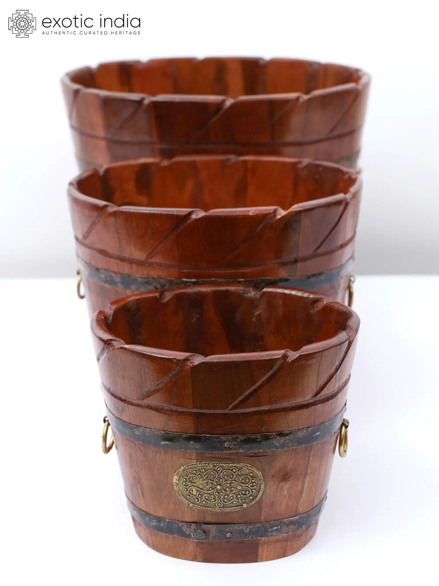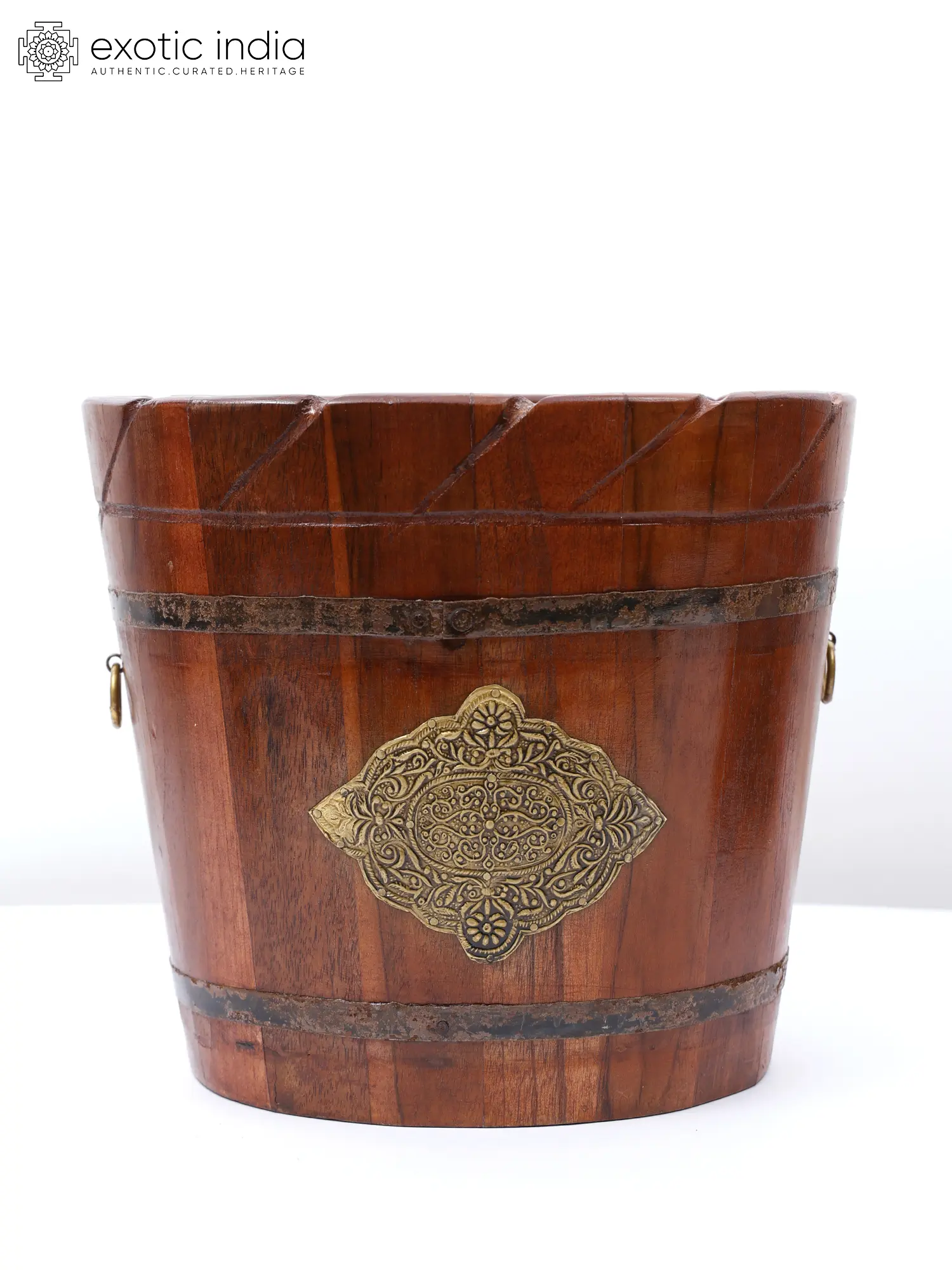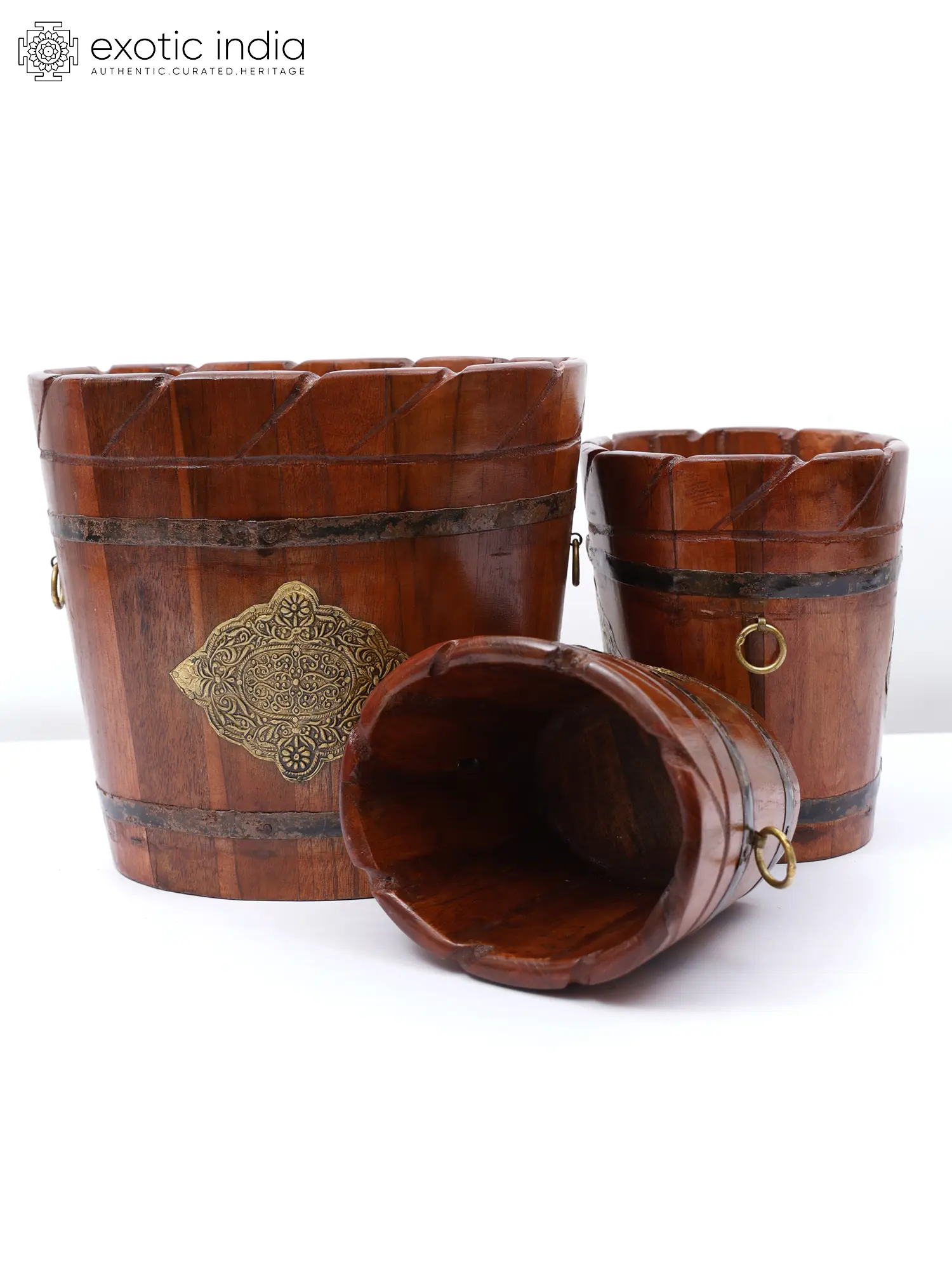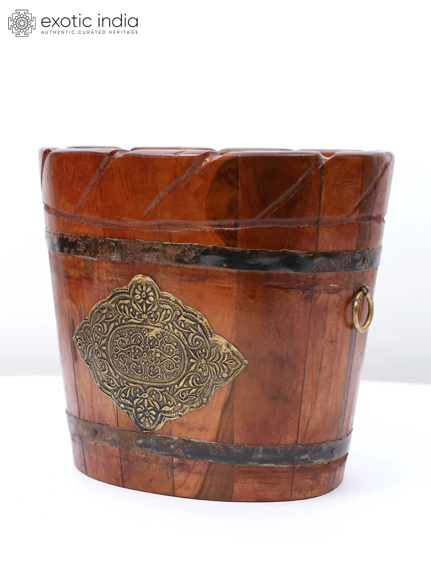These planter pots are made of high-quality wood chosen for their durability and natural beauty. Its smooth, polished surface highlights the wood's rich grain patterns and warm tones, bringing a touch of rustic charm to any area. Its bucket shape gives an antique and vintage look with iron embellishments, which lend a touch of grandeur and sophistication.