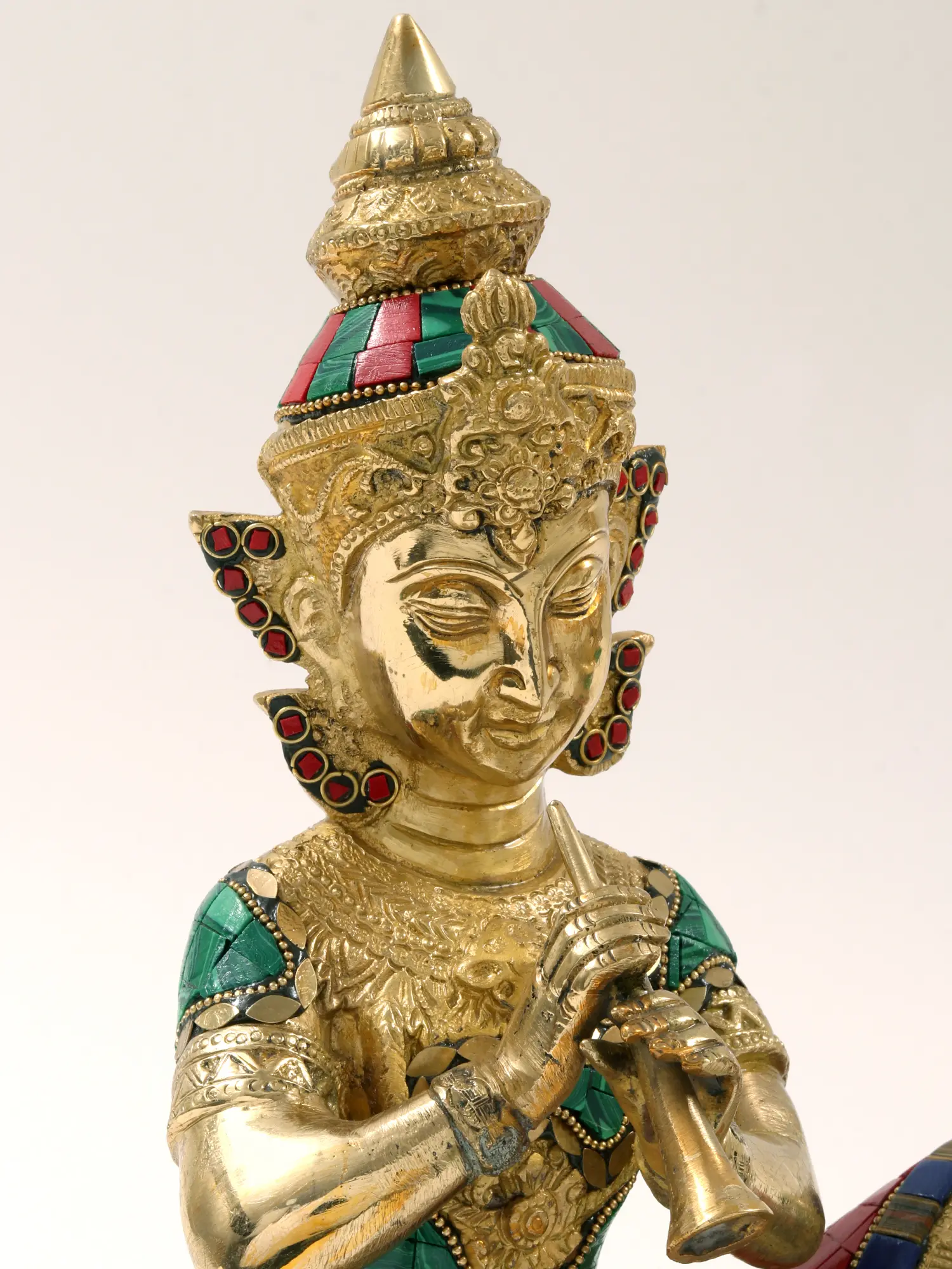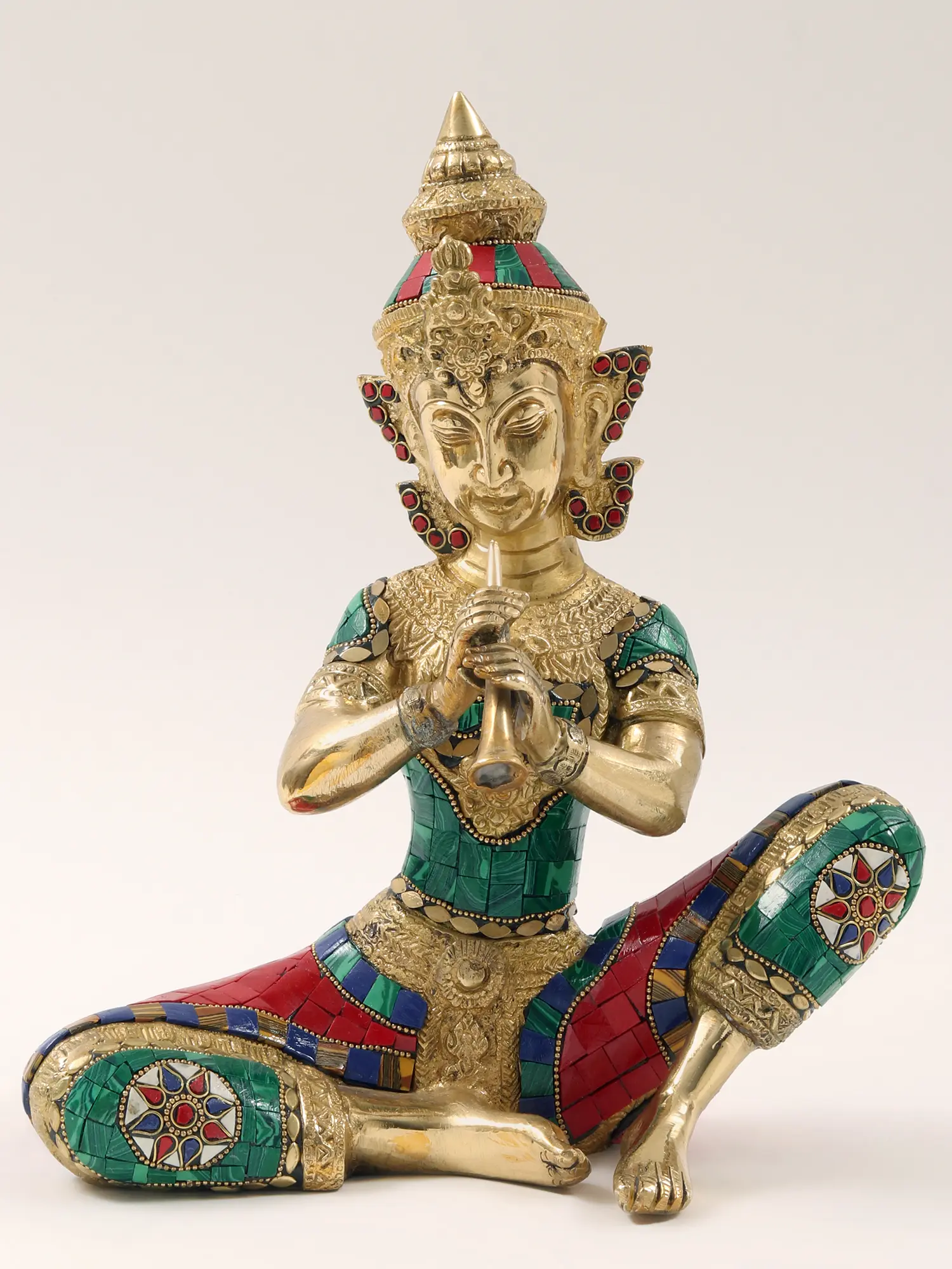 What truly sets this set apart is the elaborate inlay work that adorns their garments. The mosaic-like detailing features an array of colors, creating a vibrant and eye-catching effect. Notice the careful placement of each individual piece, a demonstration of the artisan's skill and attention to detail. The brass material itself is expertly worked, showcasing the beauty of the metal and complementing the inlaid sections perfectly. The facial features of each musician are delicately sculpted, conveying a sense of peace and concentration. These details, combined with the vibrant inlay, make these figures truly exceptional pieces of art.