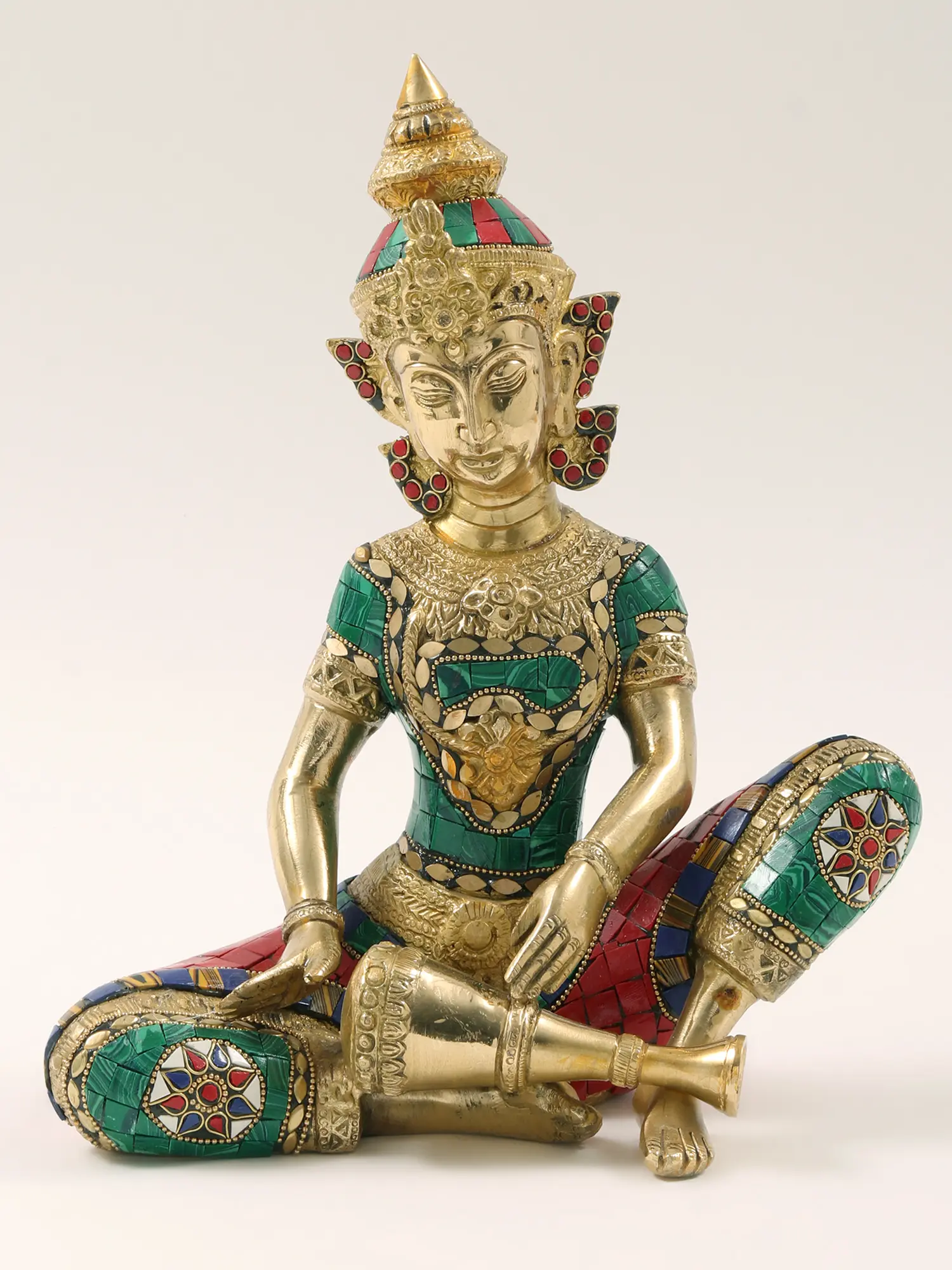 This Set of Three Musicians in Brass with Inlay Work draws inspiration from the vibrant Khon Dance Drama, presenting a trio of women playing traditional instruments. Adorned with colorful inlay work, these figurines capture the opulence associated with the traditional dance. The first musician plays the trumpet, the second skillfully handles the Khlui (traditional flute), and the third passionately engages with the Rammana (traditional drum).