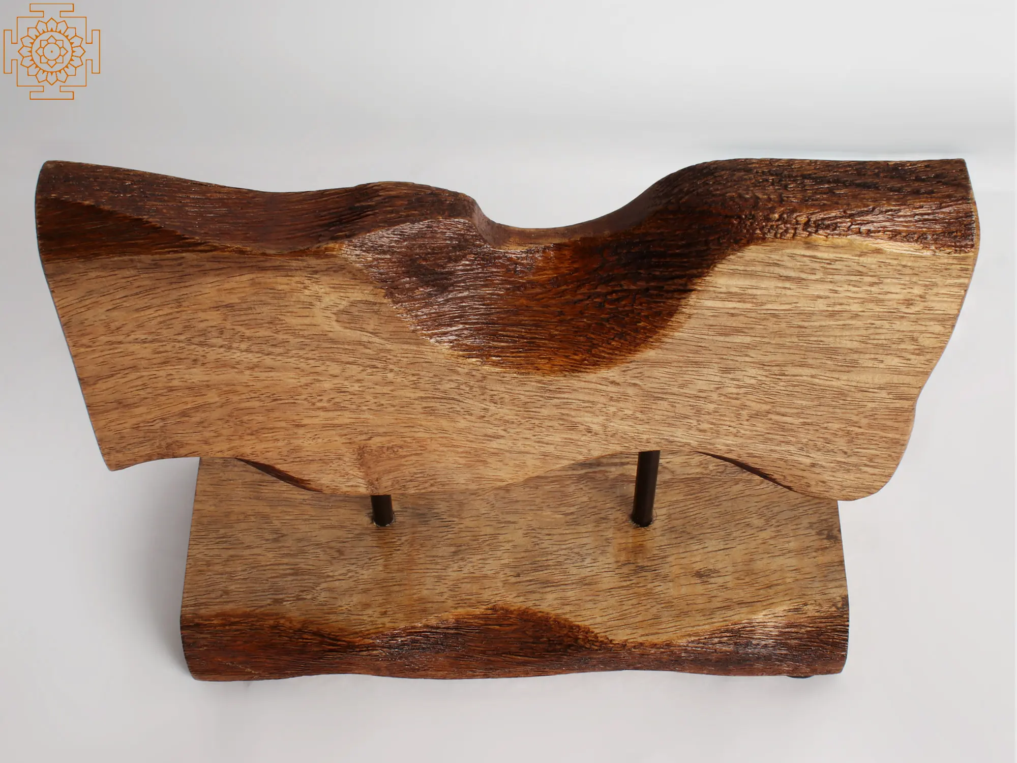 Introduce a touch of natural elegance and artistic flair to your living space with this captivating table piece. Crafted from a harmonious blend of rich wood and sturdy iron, this accent item showcases the beauty of natural materials combined with thoughtful design. The organic, flowing lines of the wooden element evoke a sense of movement and serenity, reminiscent of natural landscapes or undulating water. Each curve and contour has been expertly carved, highlighting the inherent grain and character of the wood, ensuring that no two pieces are exactly alike.