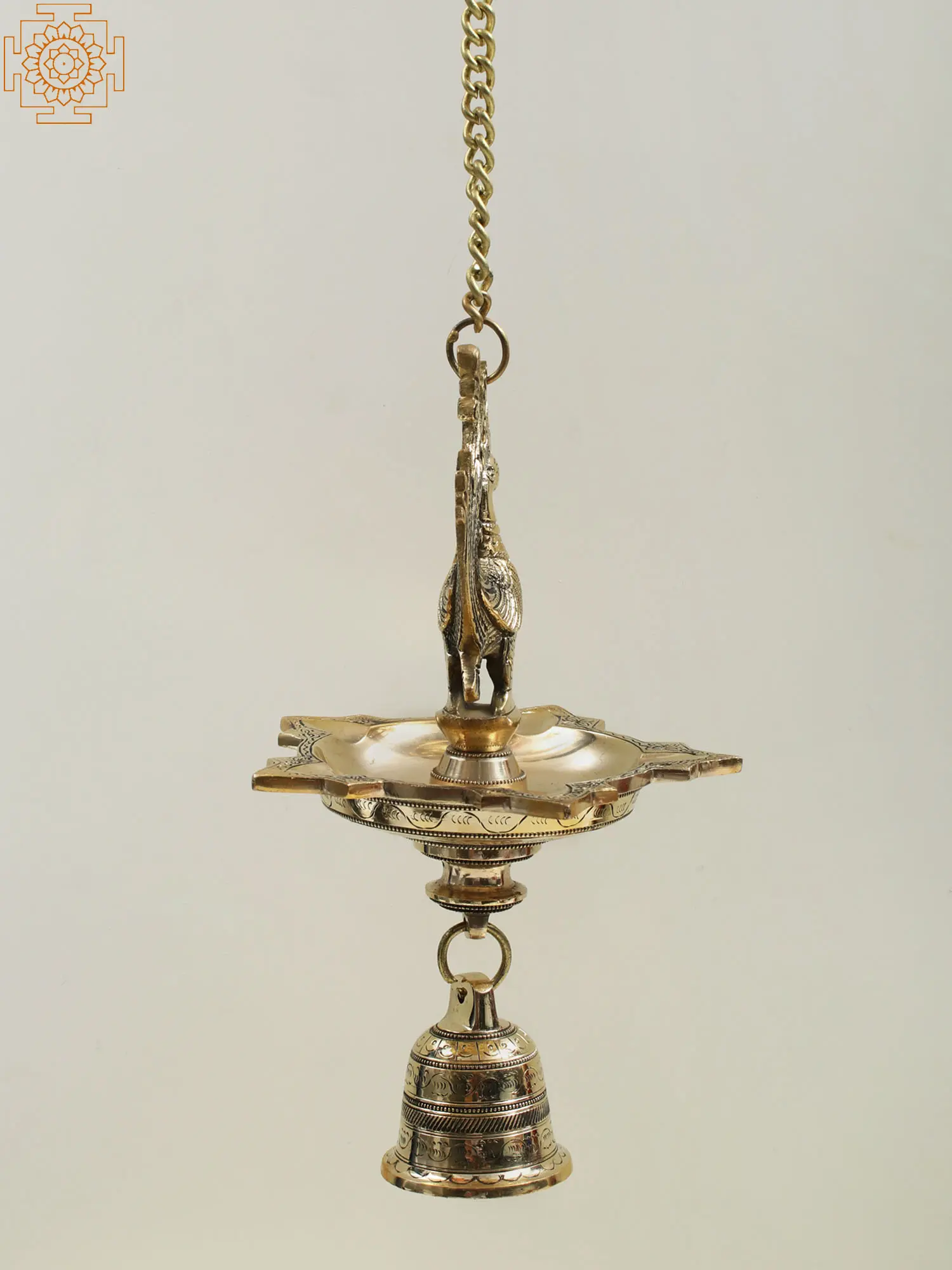 This Brass Peacock Hanging Diya with Bell is a Thooku Viallku specially designed to enlighten the area above the ground. They are traditionally hung from the ceiling. is a stunning fusion of artistry and functionality. It is made of Brass and carries a majestic peacock design, radiating elegance and cultural symbolism. The intricate details of the peacock's feathers add a touch of sophistication. Suspended beneath the diya is a bell, enhancing the aesthetic appeal with its melodic charm. The brass construction ensures durability, making it a captivating and enduring addition to any space, seamlessly blending tradition with timeless design.