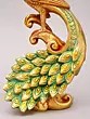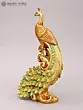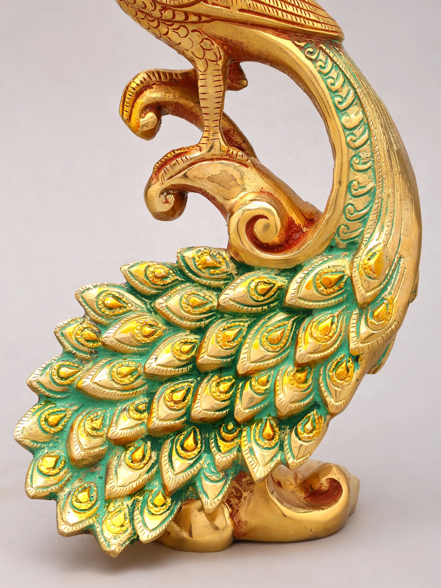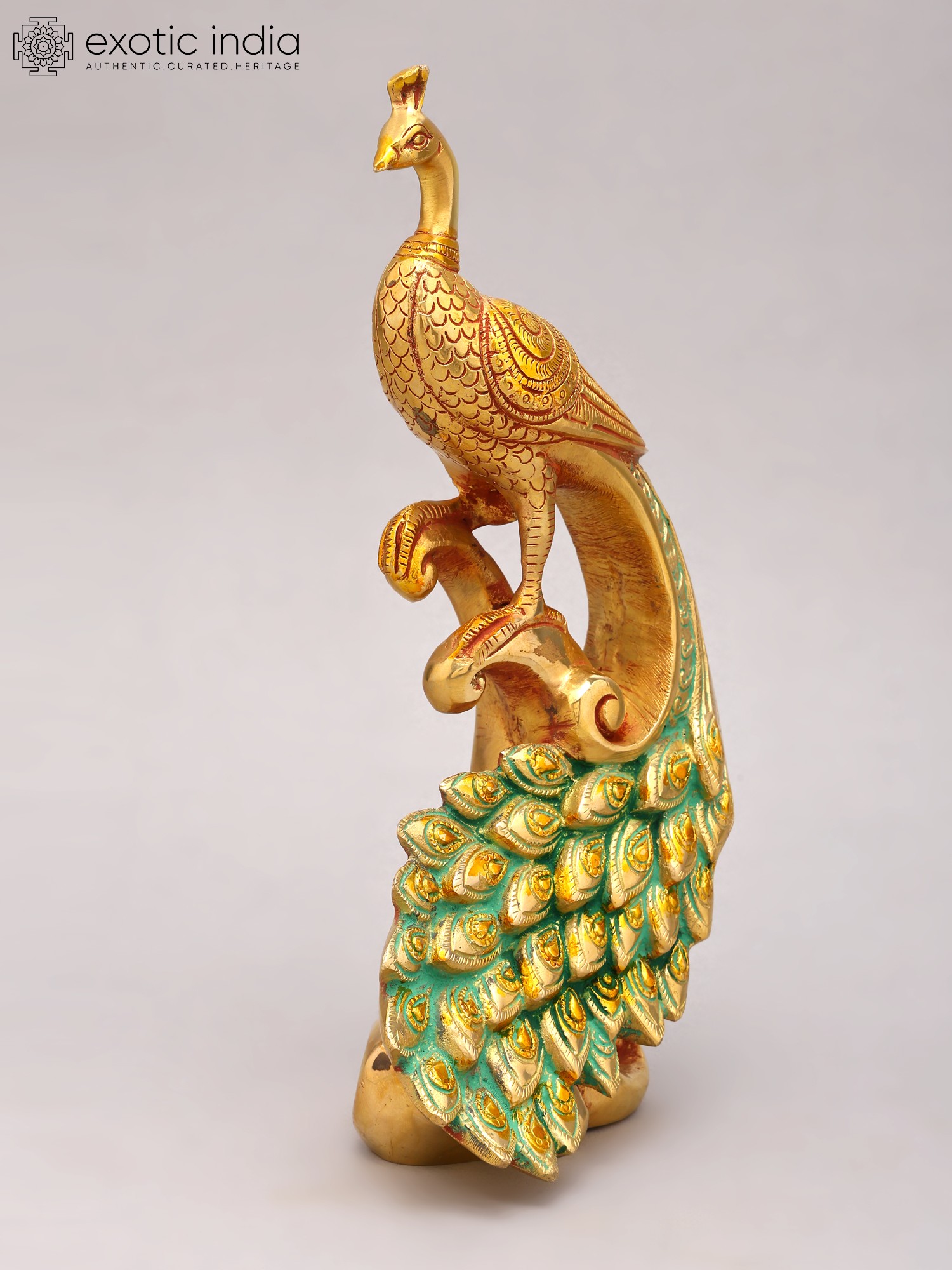 Captivating brass sculpture of a peacock with a striking, extended tail.