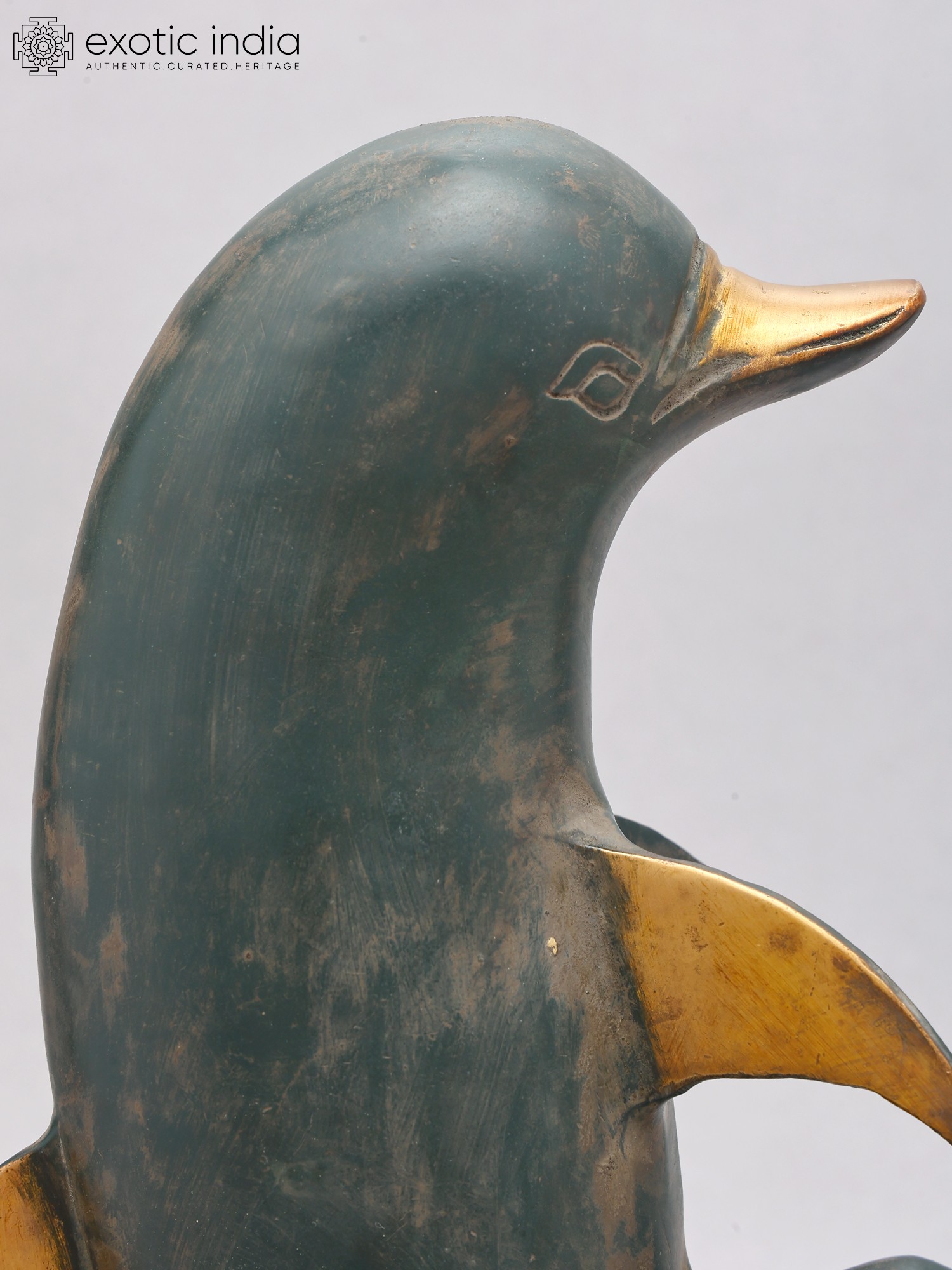 Features a rich, dark green patina with contrasting golden accents.