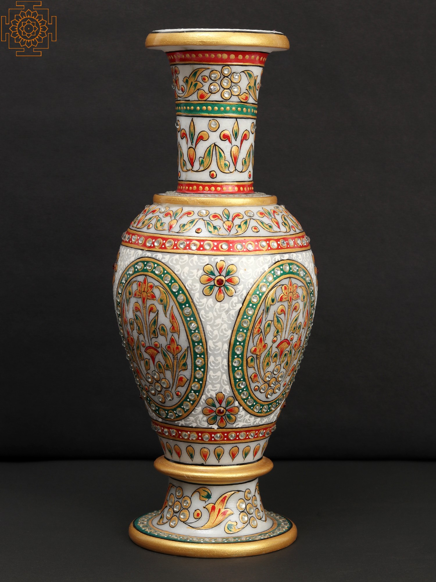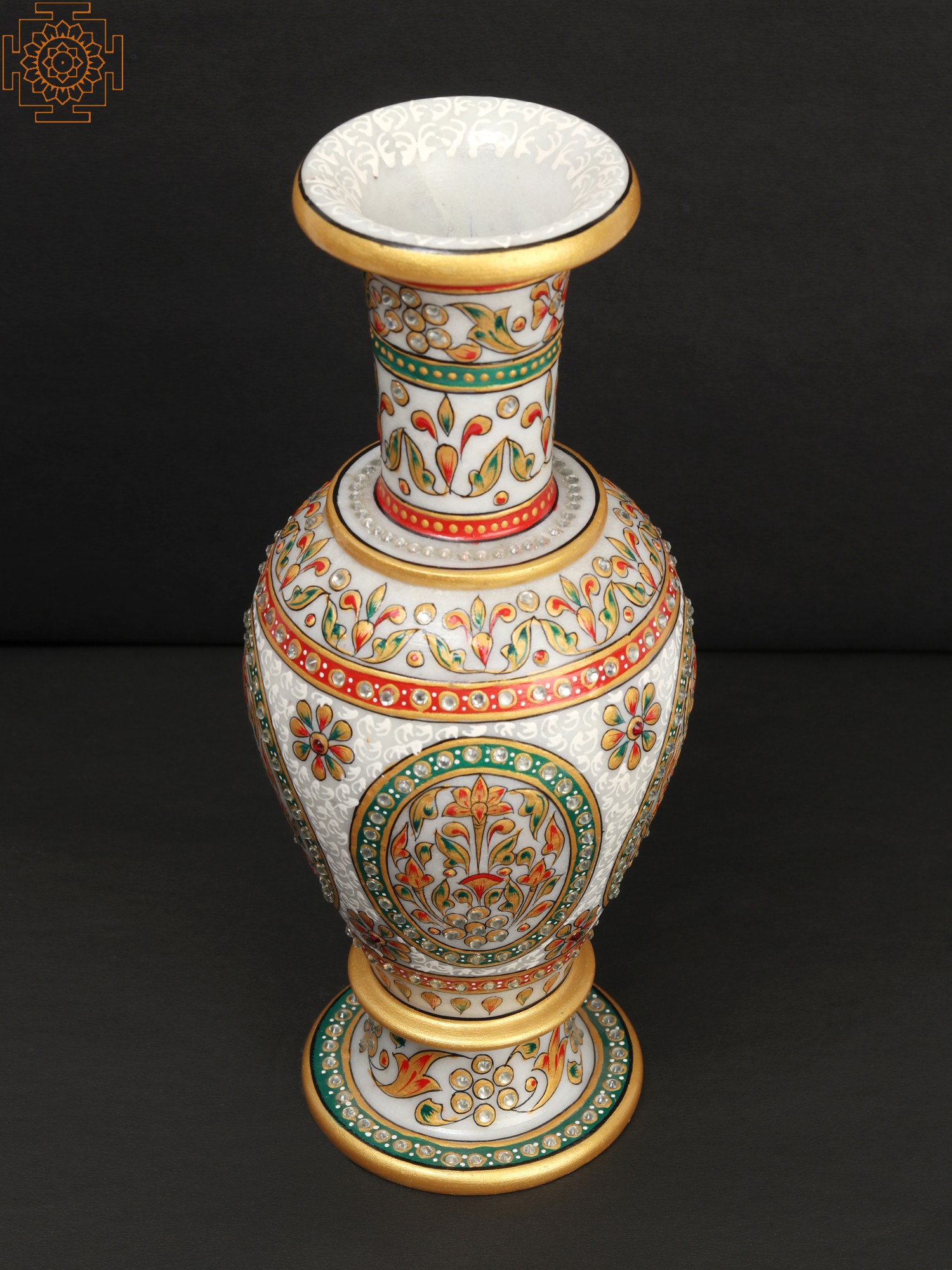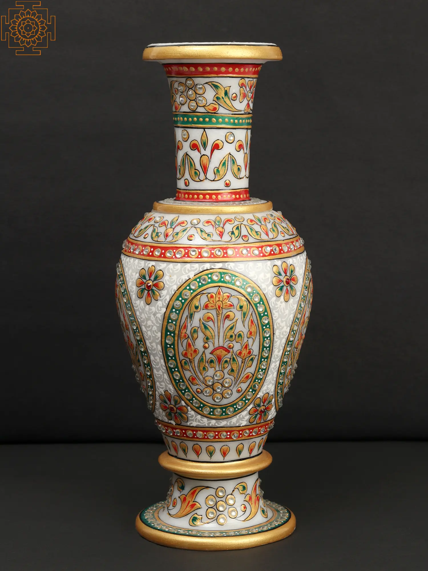 Elevate your home décor with this exquisite 12" designer flower vase, a masterpiece of artistry and craftsmanship. Crafted from high-quality marble and adorned with intricate stonework, this vase is more than just a container; it's a captivating work of art that will command attention in any room. The elegant design, featuring a harmonious blend of colors and patterns, adds a touch of sophistication and refinement to your living space. This stunning piece is perfect for showcasing your favorite fresh flowers or dried arrangements, or simply standing alone as a beautiful decorative accent. Its timeless appeal will complement both traditional and modern interior styles, making it a versatile addition to your home.
